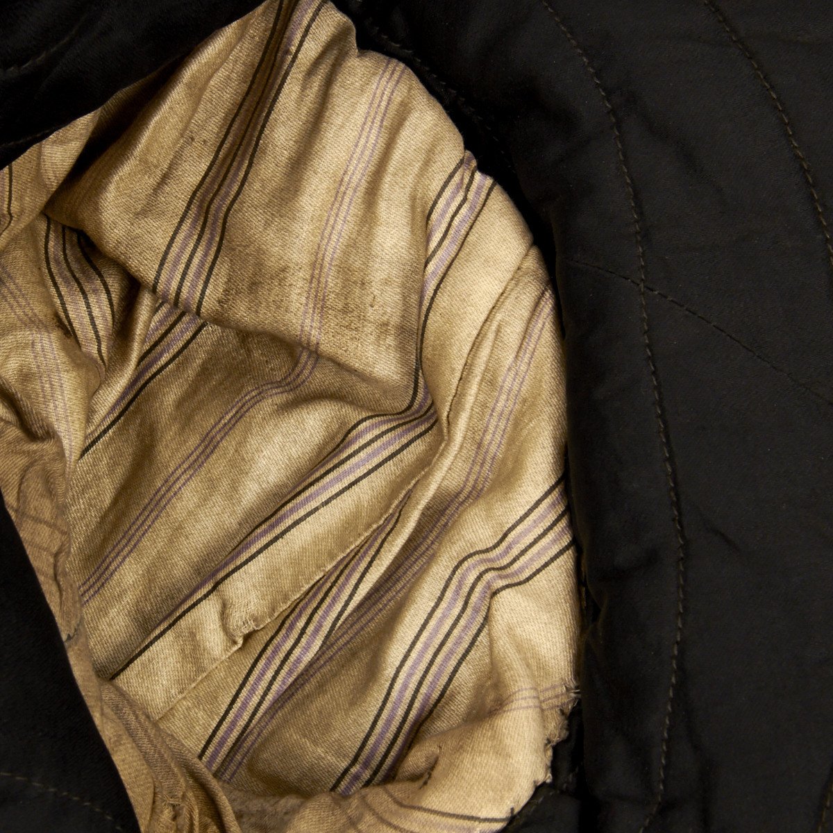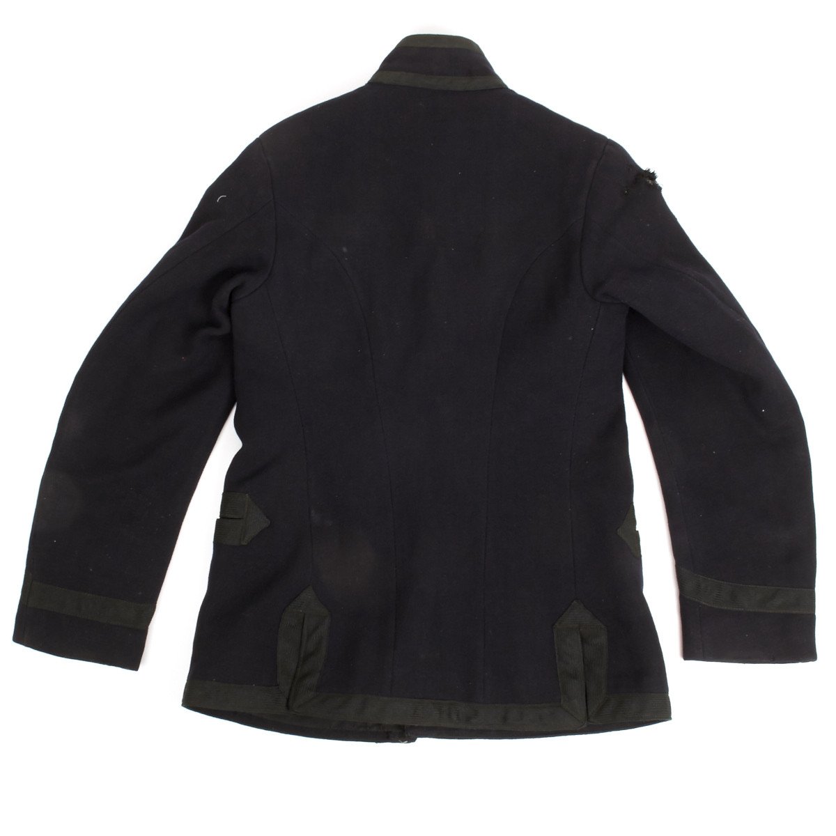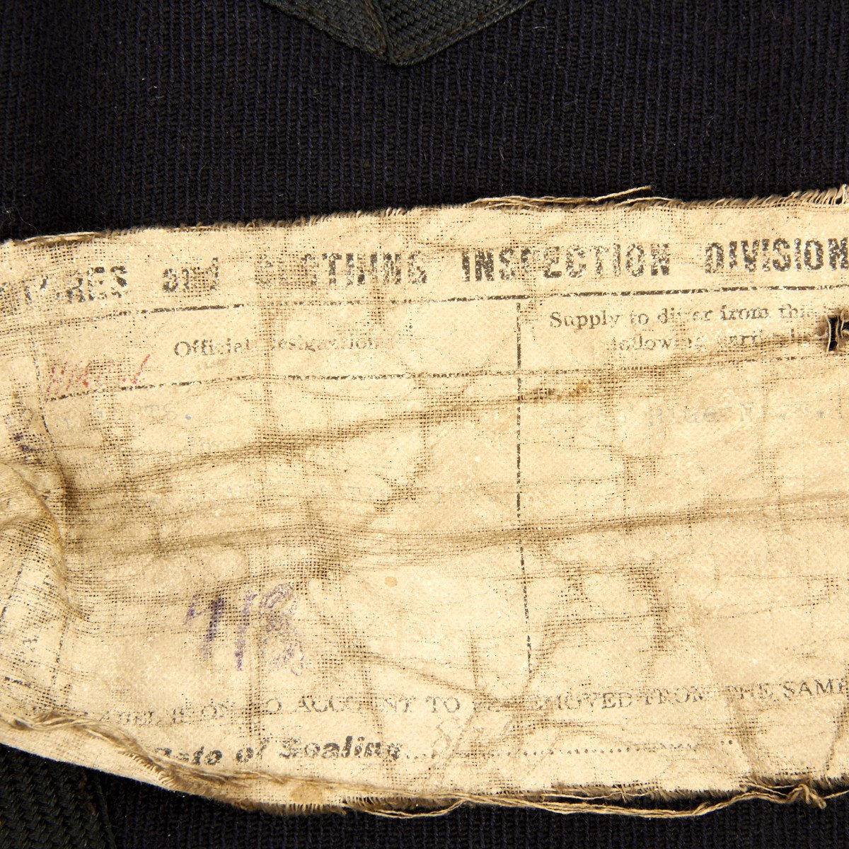 The label, a form of printed cloth is understandably worn being about 130 years old and one can still make out SPARES AND CLOTHING DIVISION. The rear of the label shows dates, in this case just two entries, when the garment was released to a manufacturer. The faint dates appear to be in the 1889. The garment is fully lined in black and the lining of the sleeves is what appears to be mattress ticking.