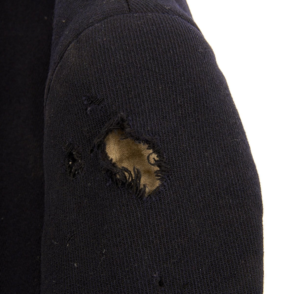 The garment shows age including a hole, resembling a bullet hole, in the upper right arm.