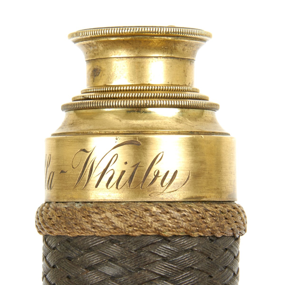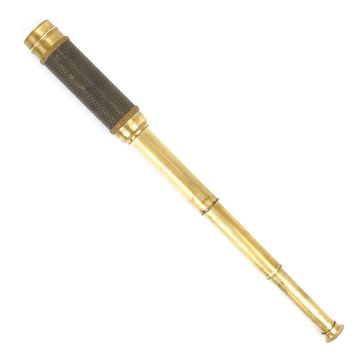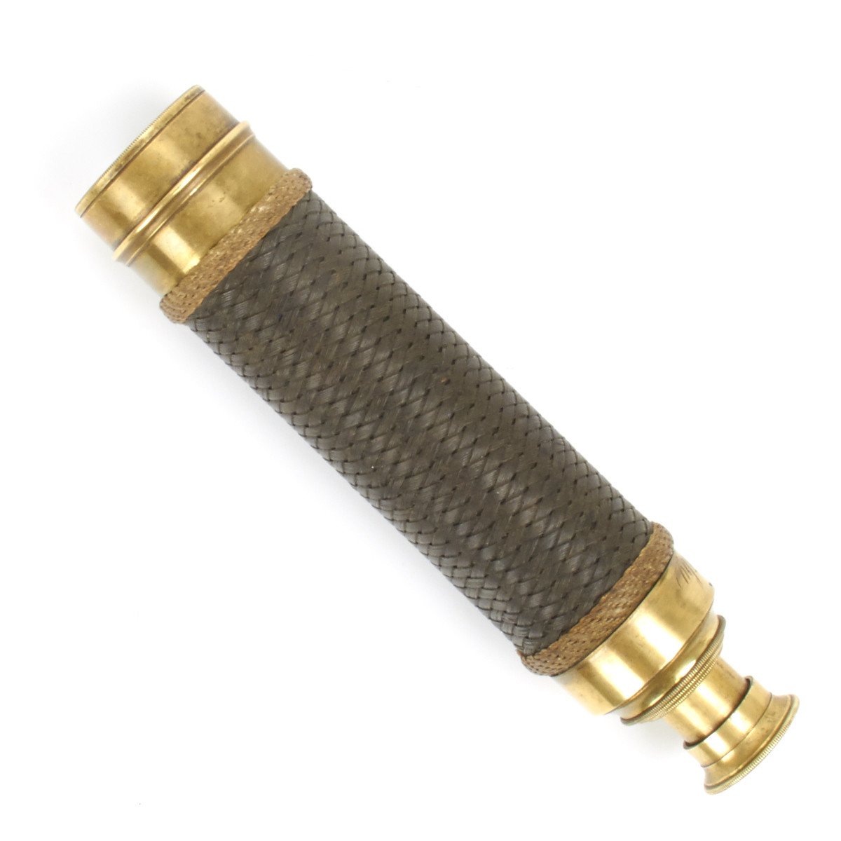 Original Item: Only One Available. This is a fine compact all brass three draw telescope with laced leather covering around primary cylinder and with woven rope ends. It carries the maker's name engraved on the smallest cylinder that reads: