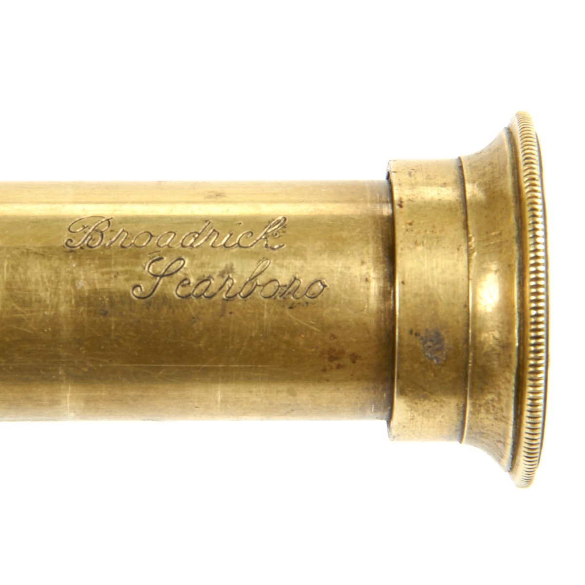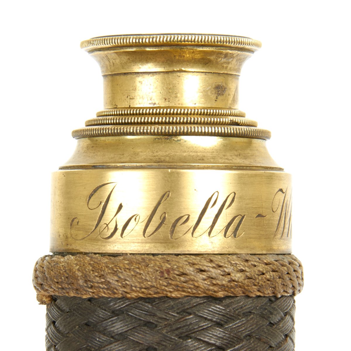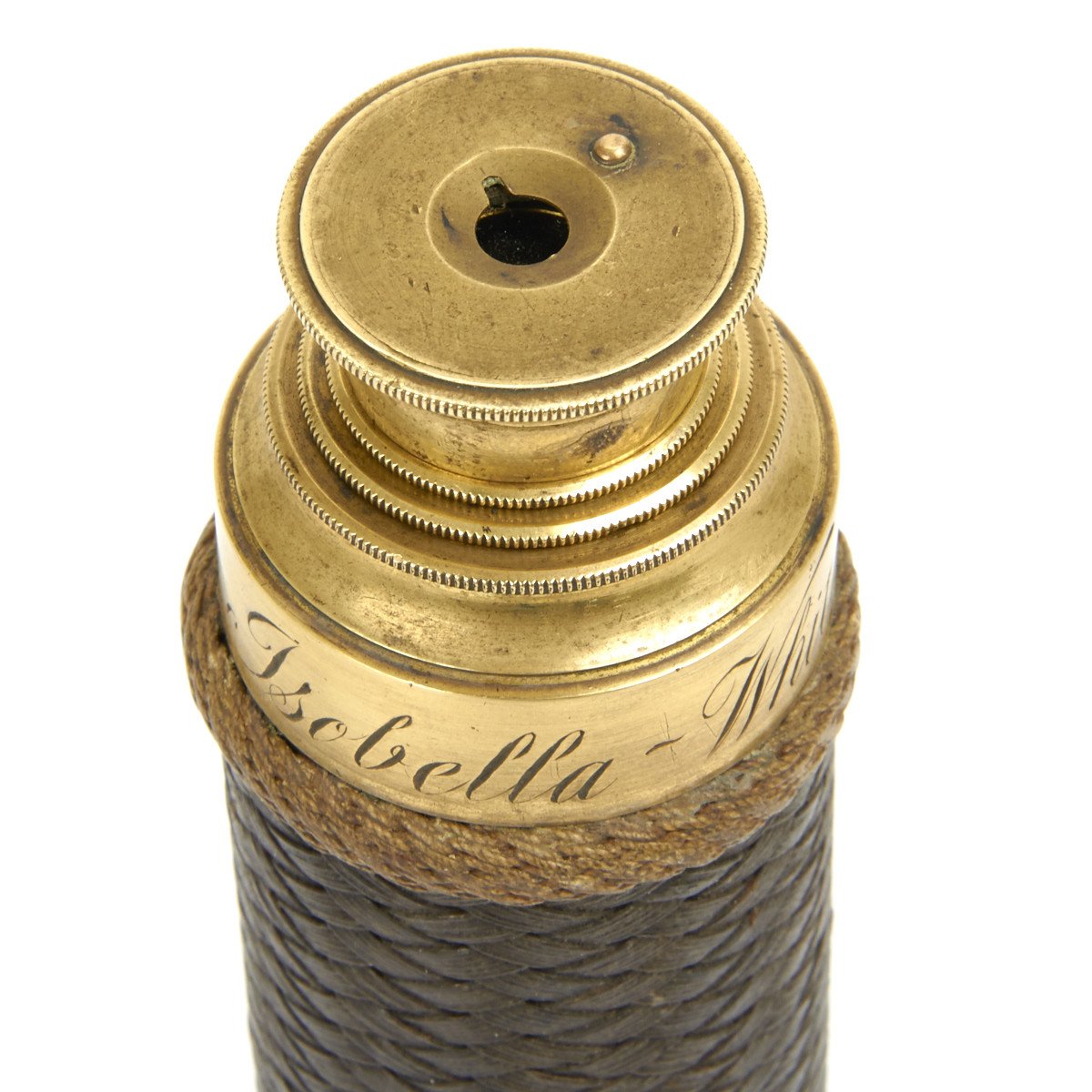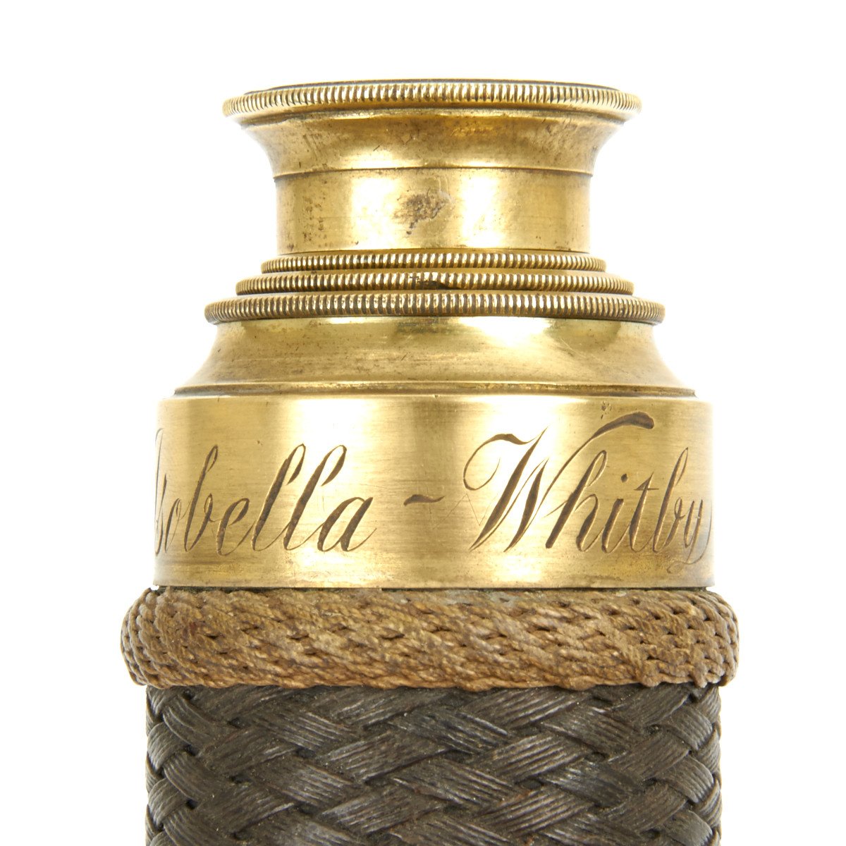Original Item: Only One Available. This is a fine compact all brass three draw telescope with laced leather covering around primary cylinder and with woven rope ends. It carries the maker's name engraved on the smallest cylinder that reads:
