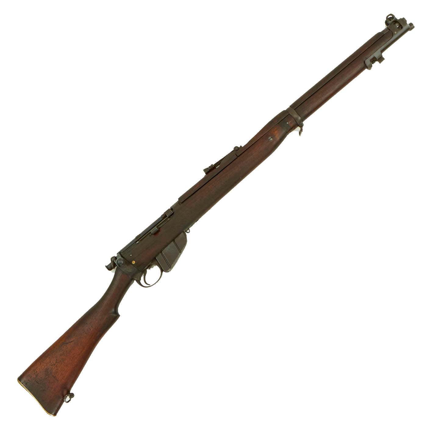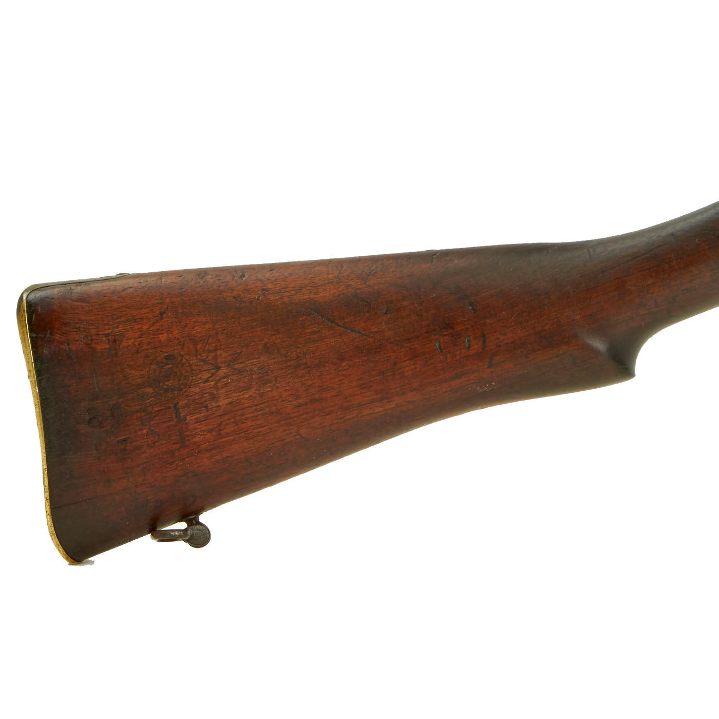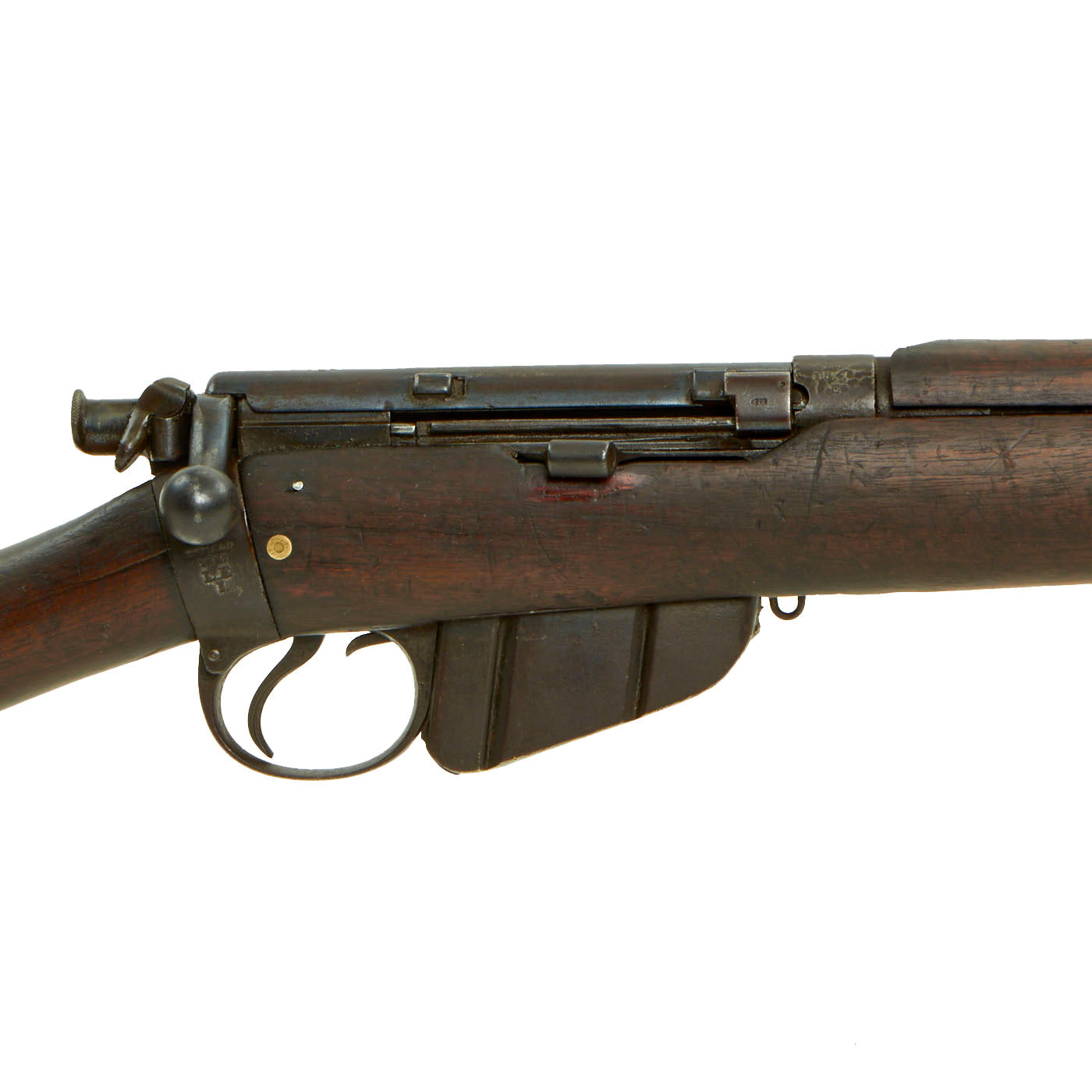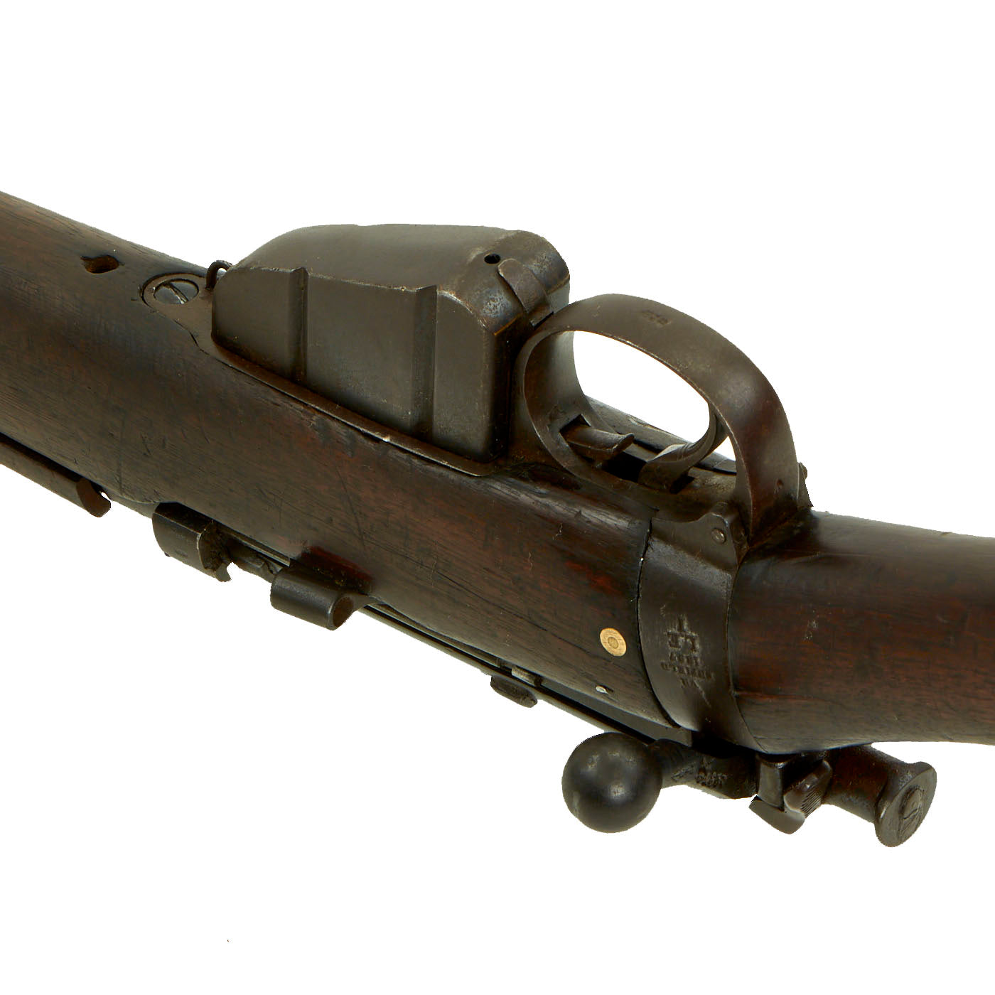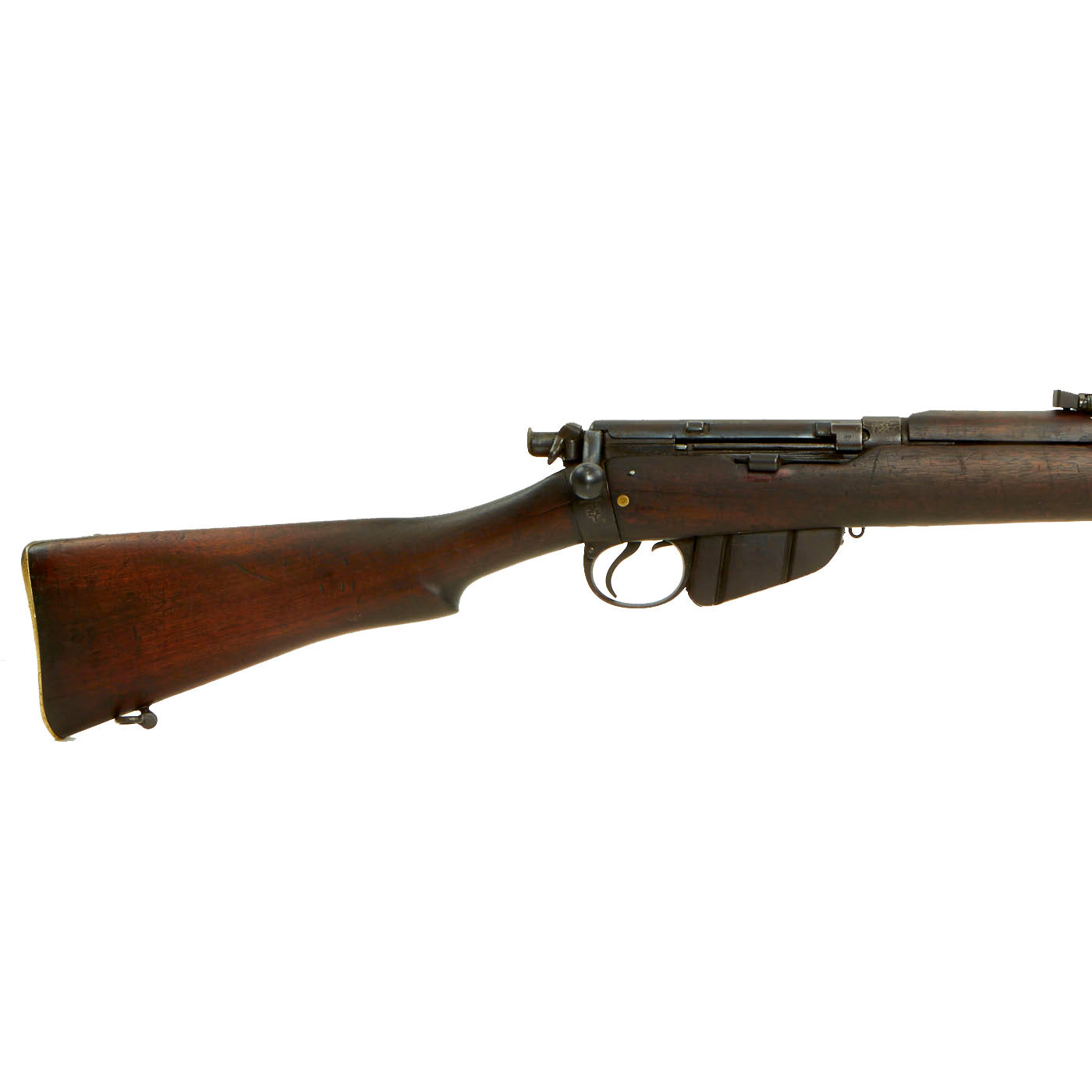 This rifle has definitely seen extensive service, and there are numerous proofs and markings on the stock and metal, some of which are no longer completely legible. It has several "opposed broad arrow" markings, for rifles sold out of military service. The receiver is marked with serial number 1548 / E, while the other numbers on the rifle are not matching.