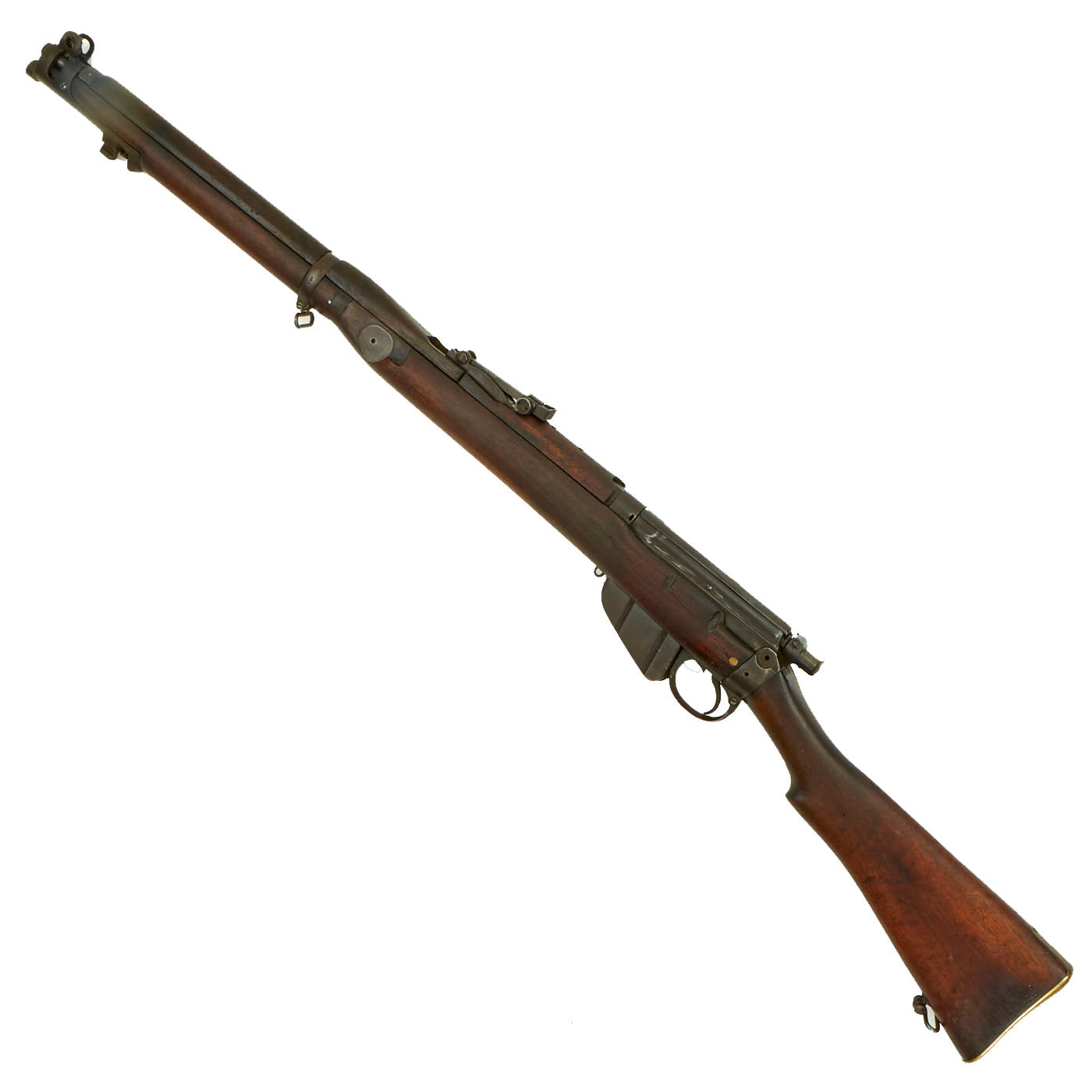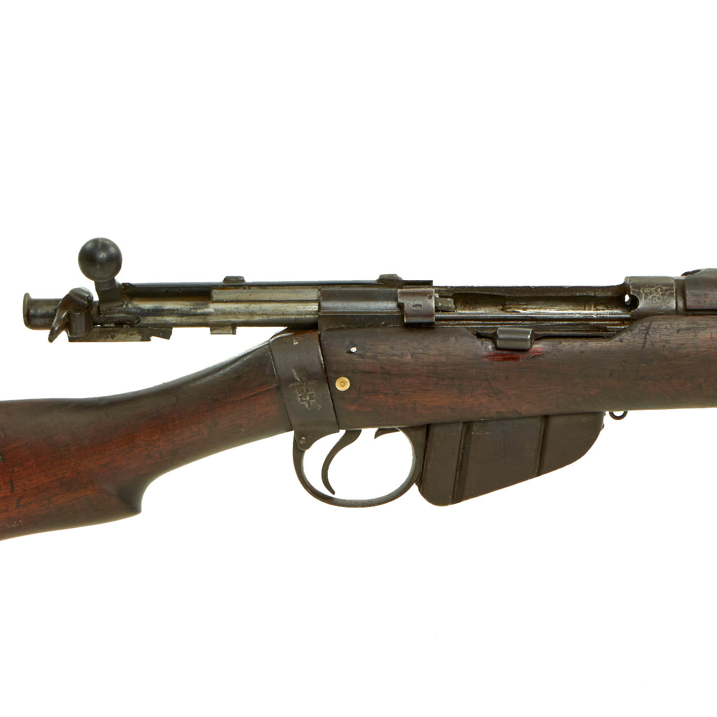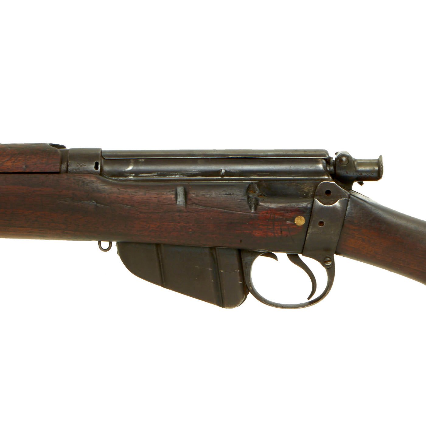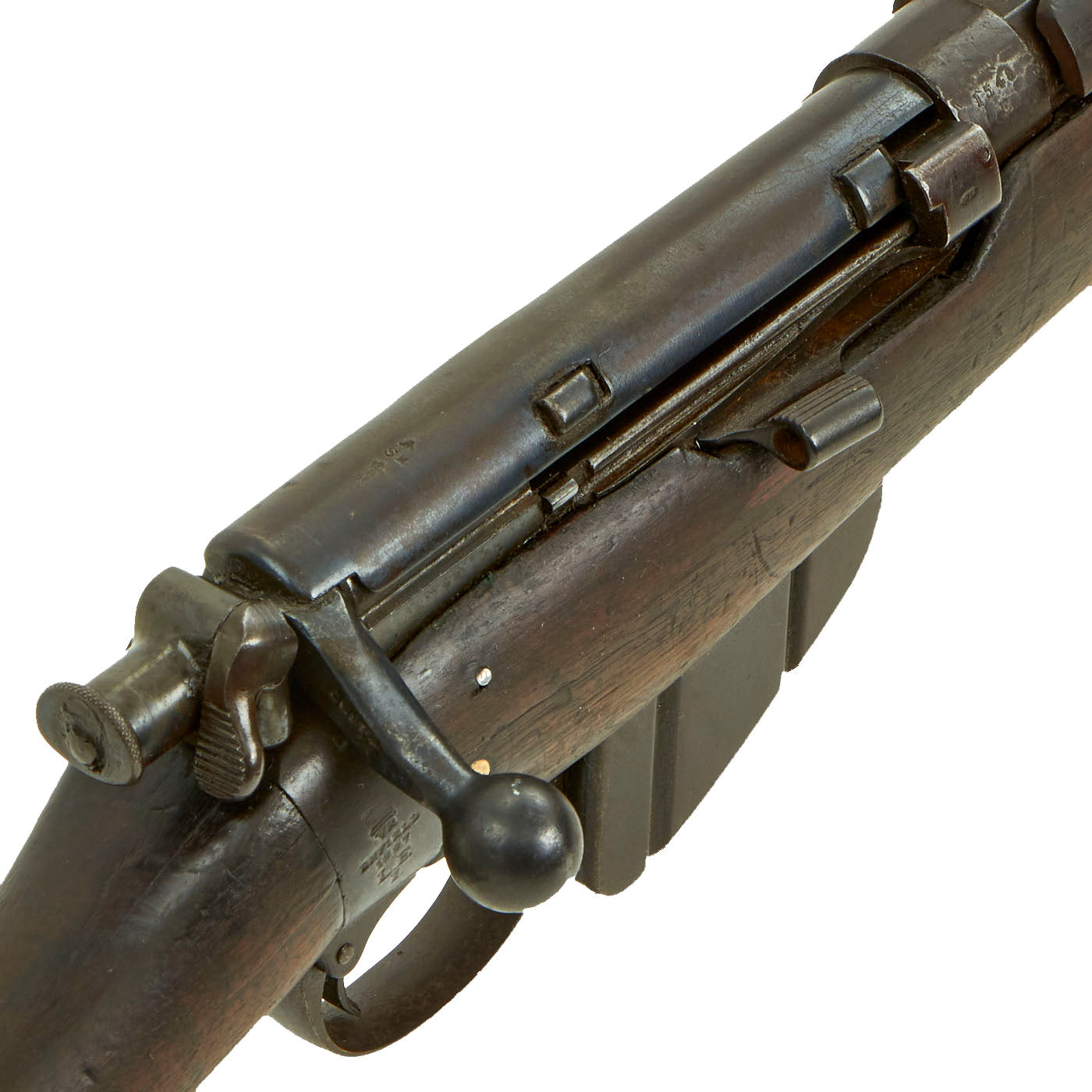 This rifle has definitely seen extensive service, and there are numerous proofs and markings on the stock and metal, some of which are no longer completely legible. It has several "opposed broad arrow" markings, for rifles sold out of military service. The receiver is marked with serial number 1548 / E, while the other numbers on the rifle are not matching.