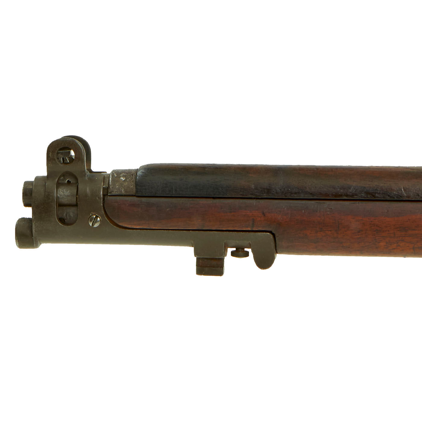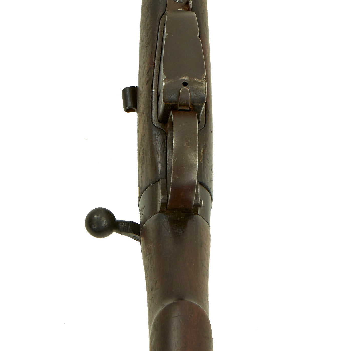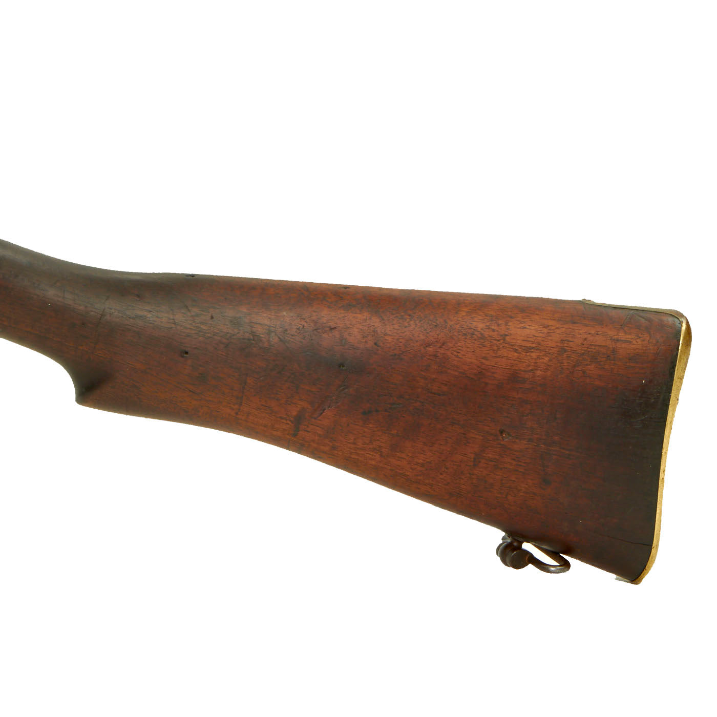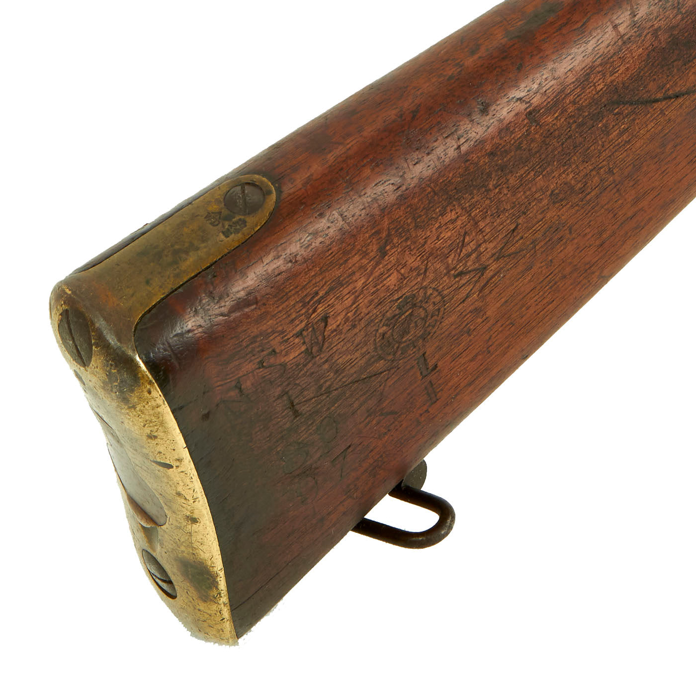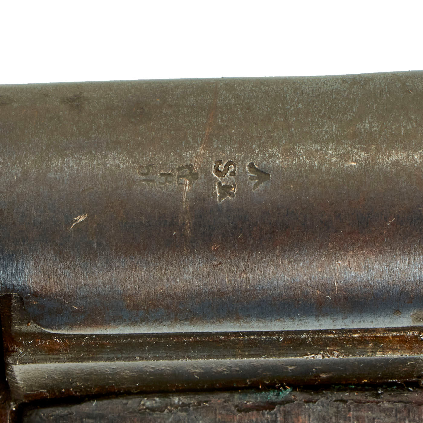 This rifle has definitely seen extensive service, and there are numerous proofs and markings on the stock and metal, some of which are no longer completely legible. It has several "opposed broad arrow" markings, for rifles sold out of military service. The receiver is marked with serial number 1548 / E, while the other numbers on the rifle are not matching.