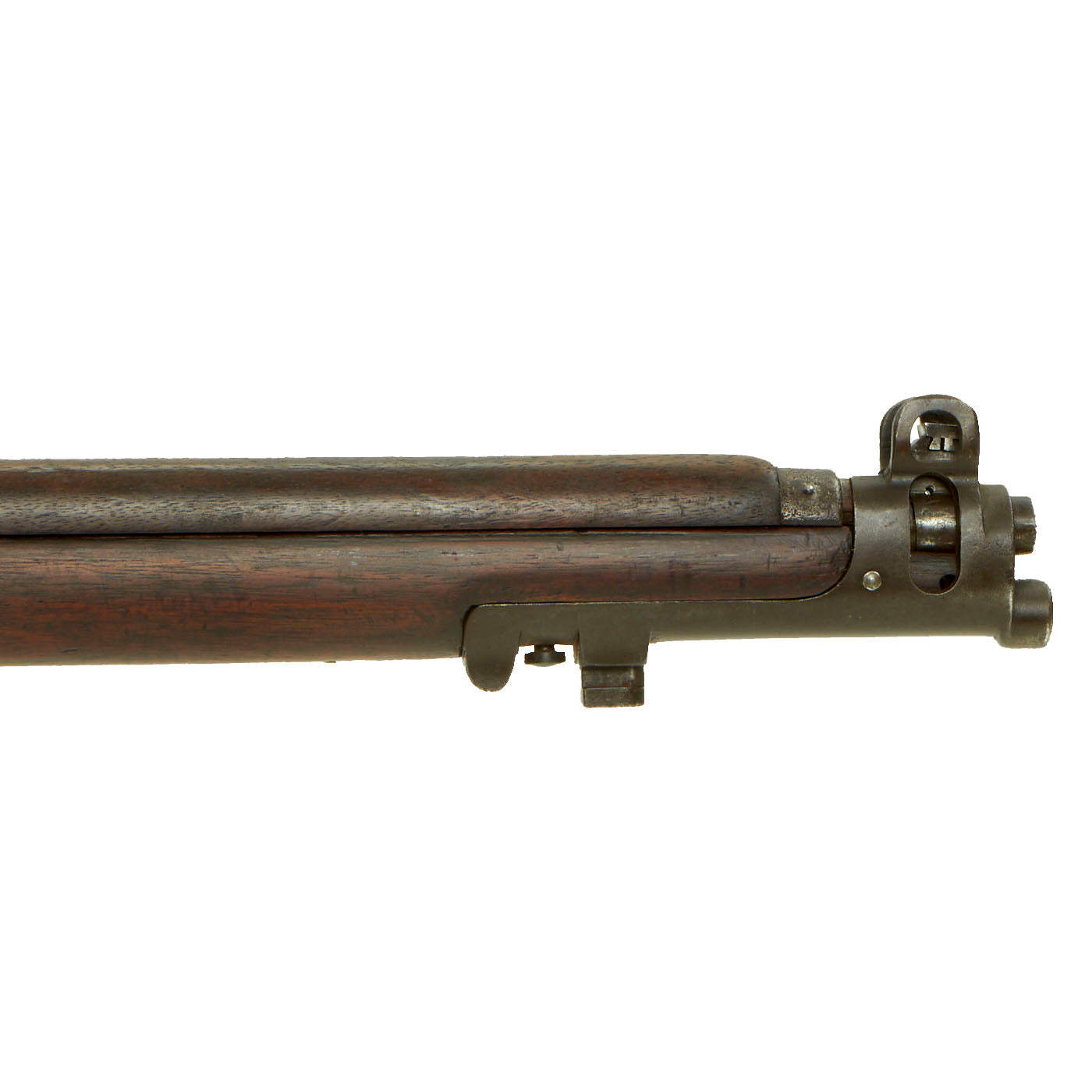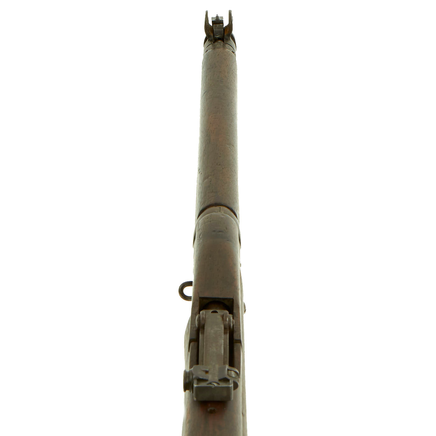 This rifle was then later shortened and refitted to "Short Magazine Lee-Enfield" (S.M.L.E.) dimensions, and saw further service. The right side of the butt stock has the original R M / ENFIELD Rondel stamp, but also N S W for New South Wales in Australia. It was originally fitted with long range volley sights, however those have been removed, though the base for the front sight is still on the sight, so the rifle was not restocked during conversion. The handguard however definitely was replaced, along with the rear sight. The top of the barrel nocks form is marked MOTTY, and it also has the 303 / NITRO PROOF on the left side of the barrel under the handguard, indicating it was good for use with the new Nitrocellulose propelled .303 British Cartridges. There also looks to be the "Three Rifle" B.S.A. trademark logo in front of the rear sight, so the entire barrel may have been replaced at some point.