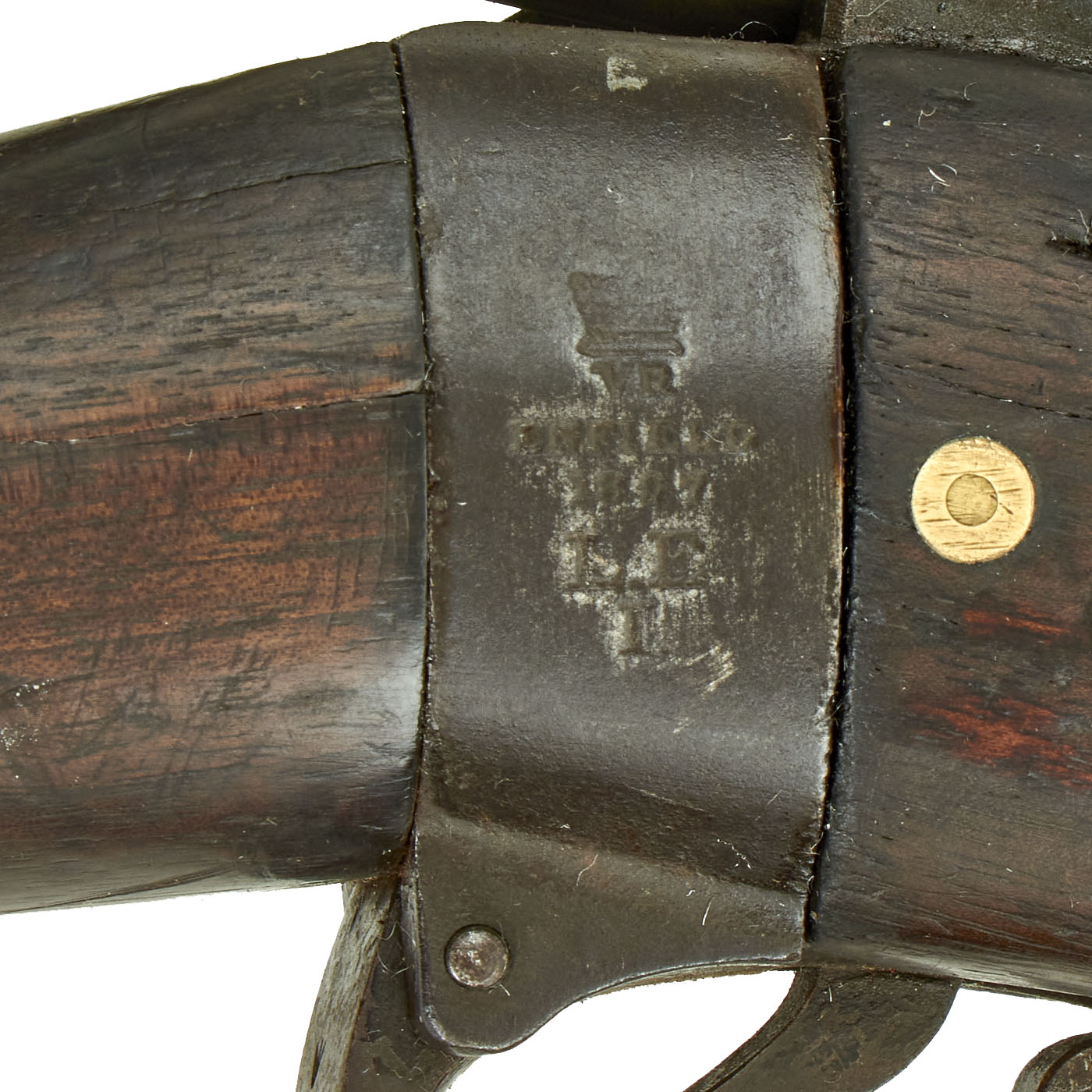 ENFIELD indicates that the first incarnation of this piece was produced by the Royal Small Arms Factory at Enfield Lock and 1897 was the year of original manufacture. L.E. is the abbreviation for the .303 calibre, Rifle, Magazine, Lee–Enfield, with the I indicating the first version. There are no stars indicating that it was produced as a modified first version. It saw service, and then was deemed worn or obsolete, so it was converted to the new Short MLE configuration.