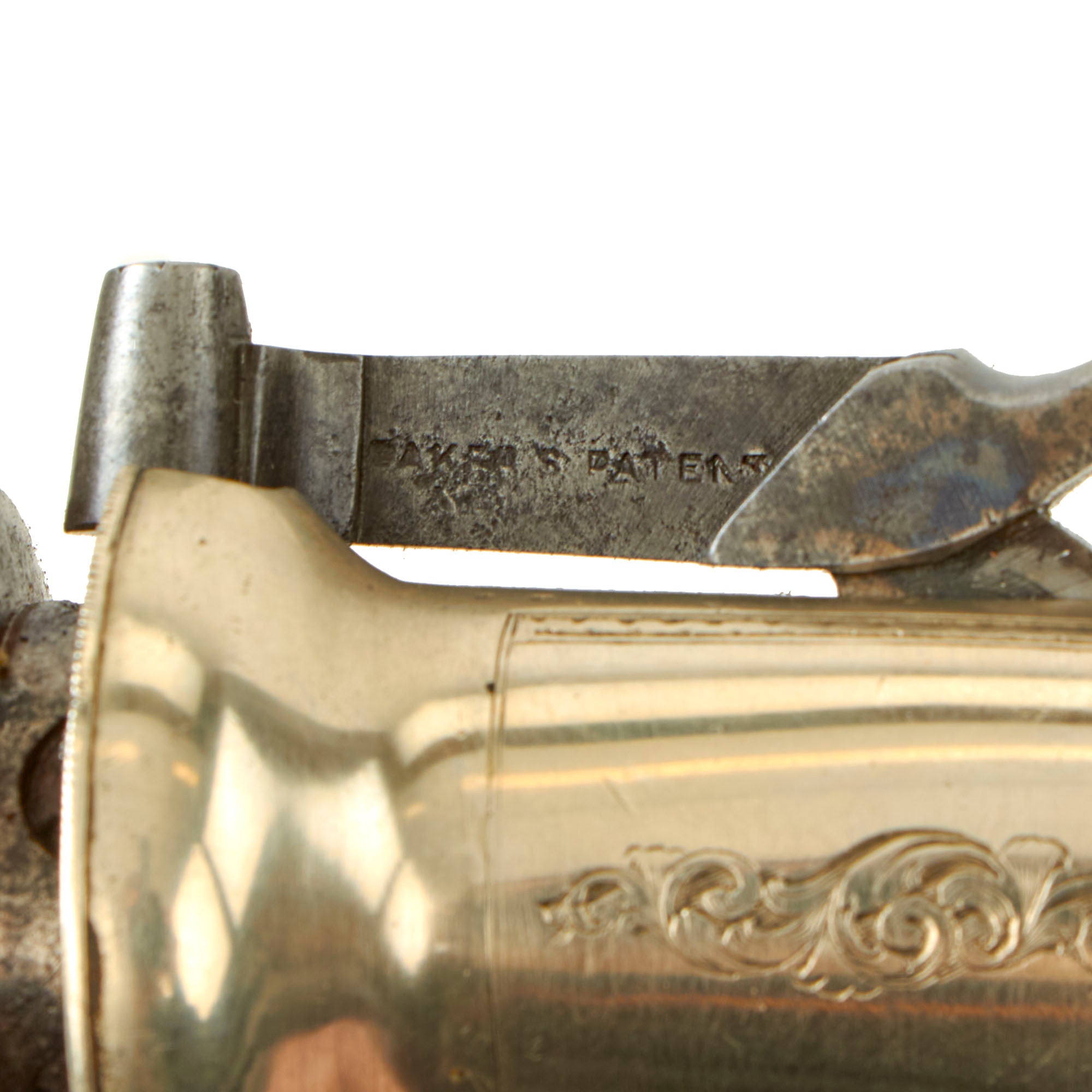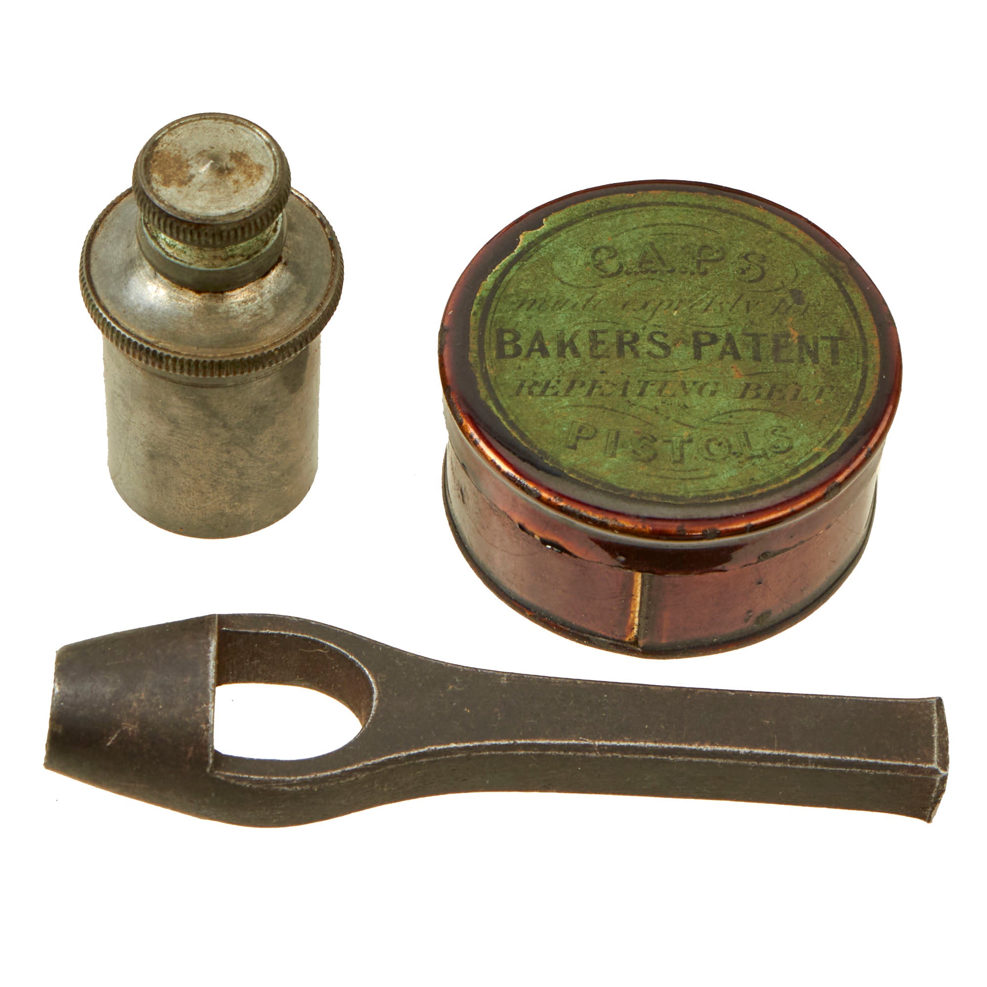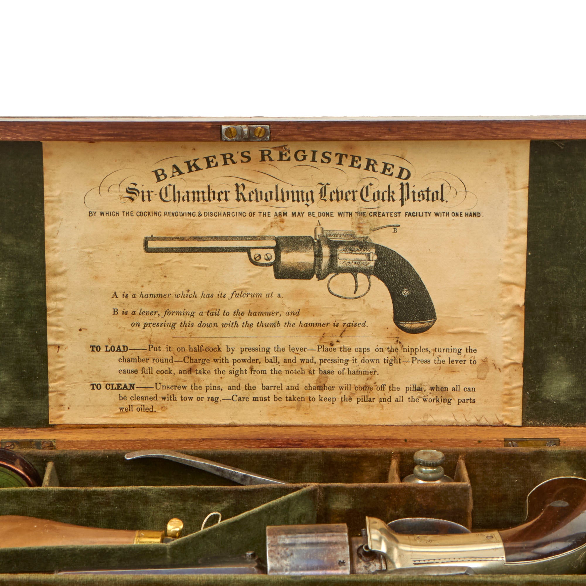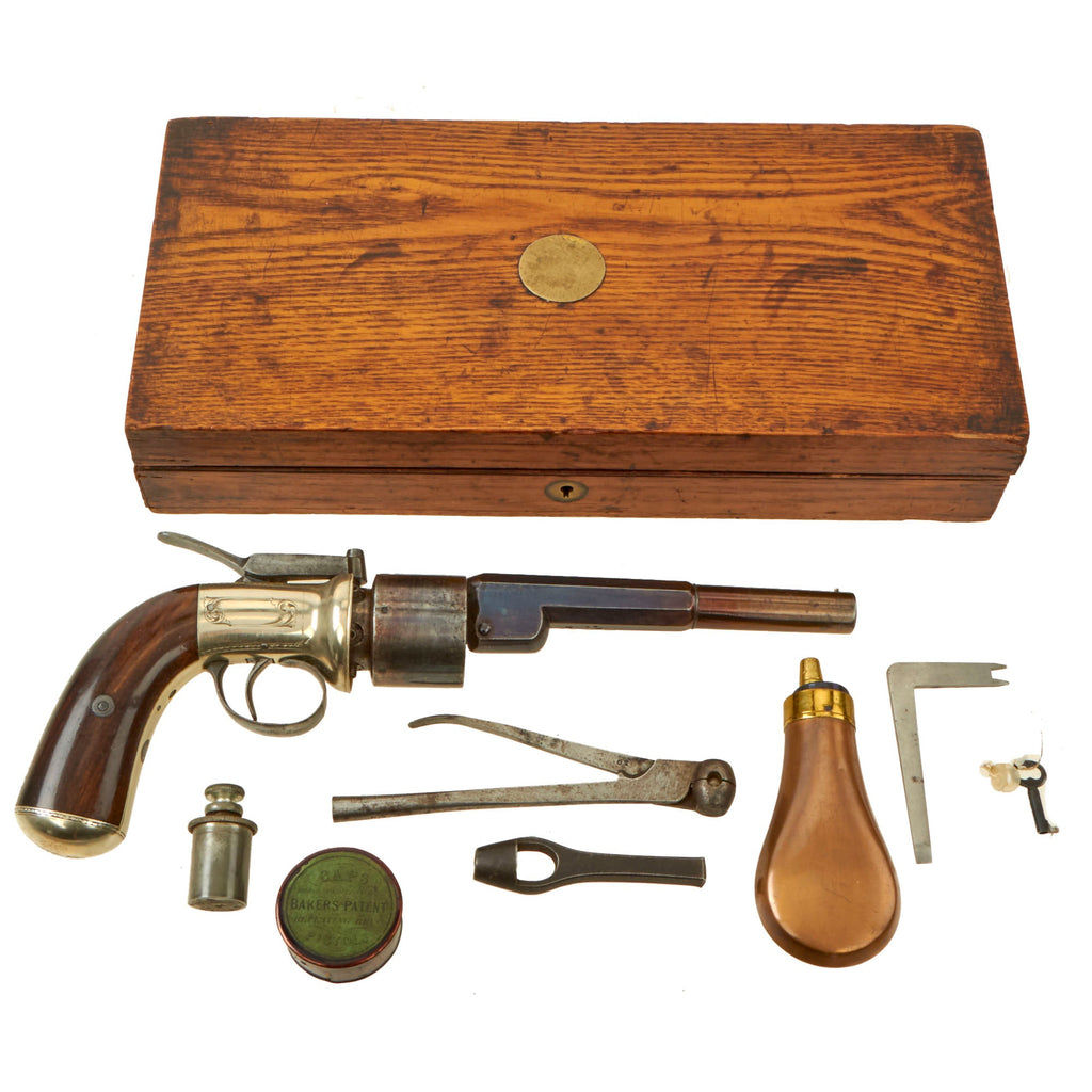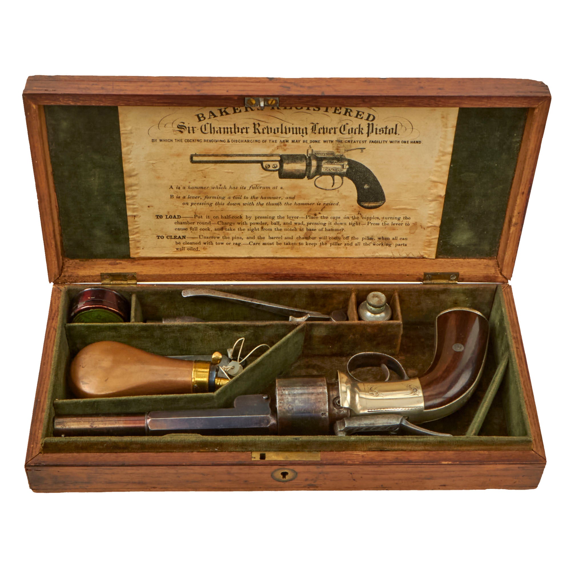 Original Item: Only One Available. This is a lovely example of a rare Baker's Patent Nickel Silver Framed percussion revolver, complete with a fantastic custom case an accessories. Thomas Kerslake Baker was a gunmaker in Victorian England, and worked out of 88 Fleet Street in London. He is most known for is 1852 Patent of a "Longspur" cocking handle for single action revolvers, which did achieve some popularity at the time. Not only did it allow easy cocking of the revolver, it also has a cutout in the left side as well as a slight offset to the right, with a notch sight at the bottom of the cutout. This allowed accurate sighting of the revolver, something often not possible with this design of revolver.