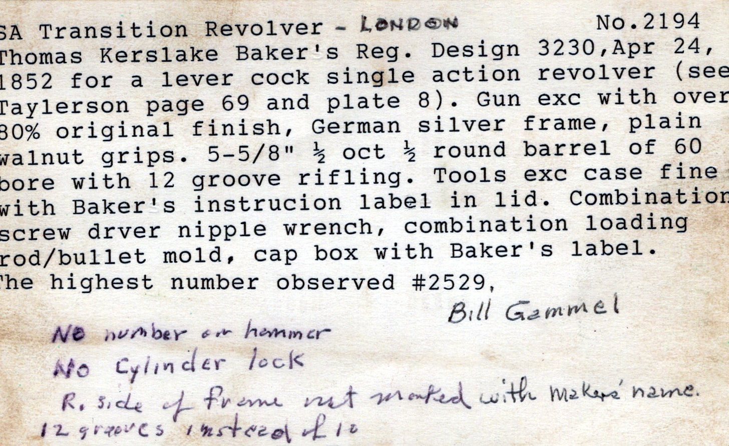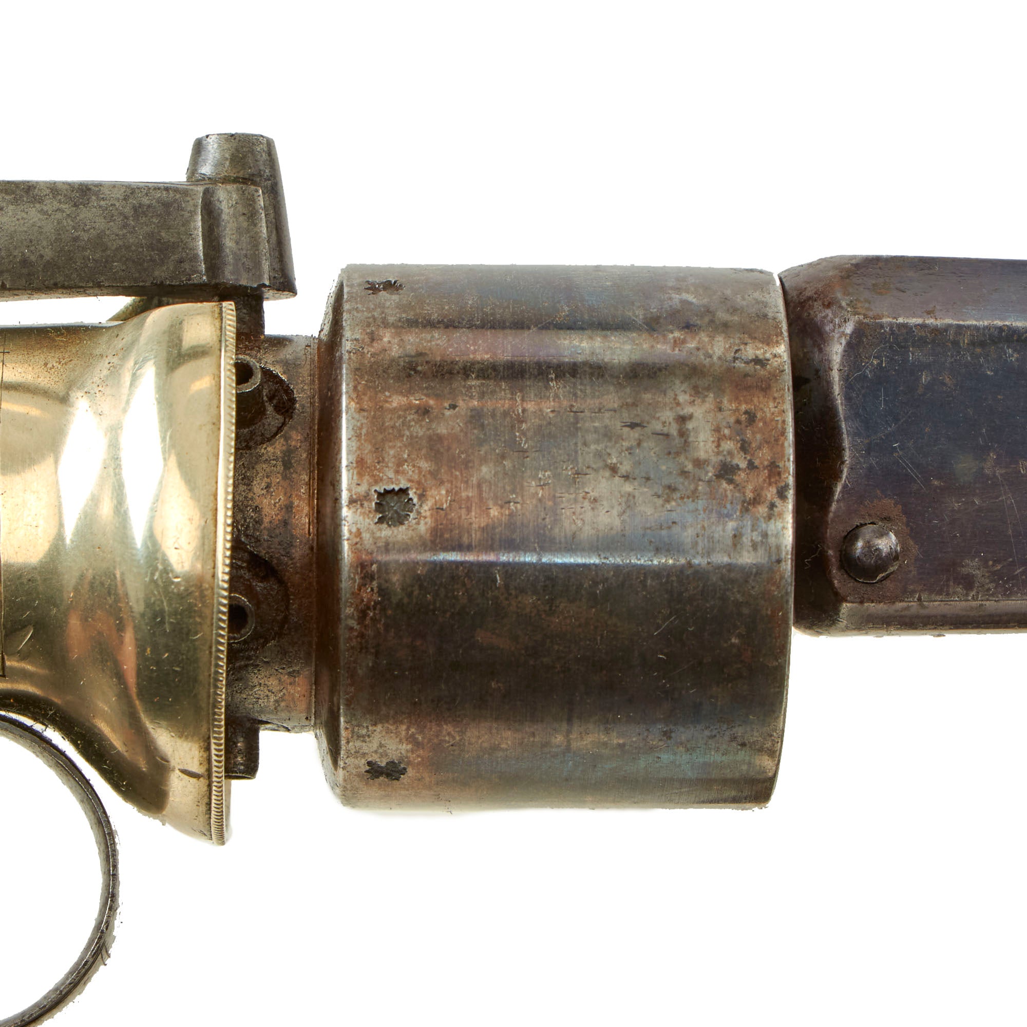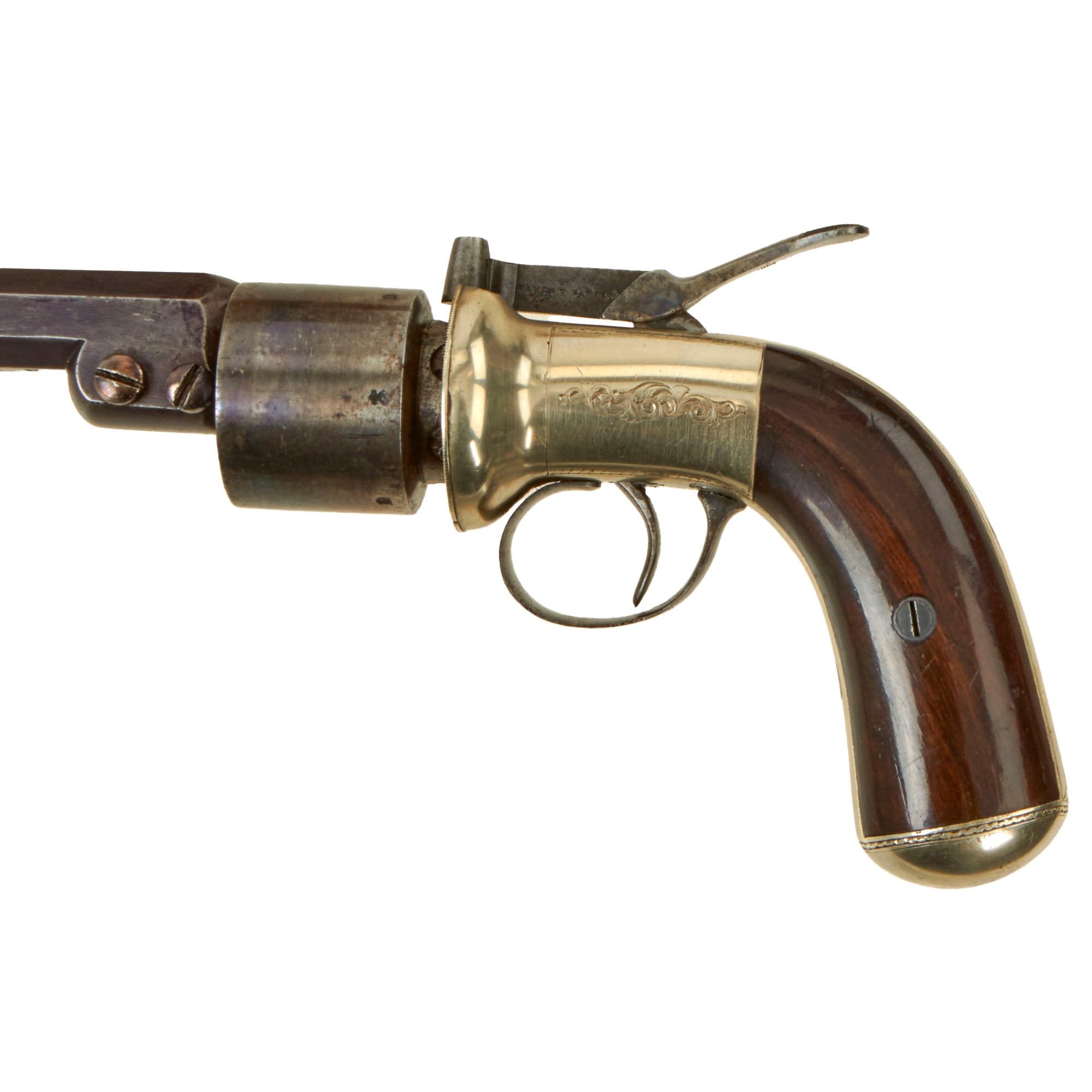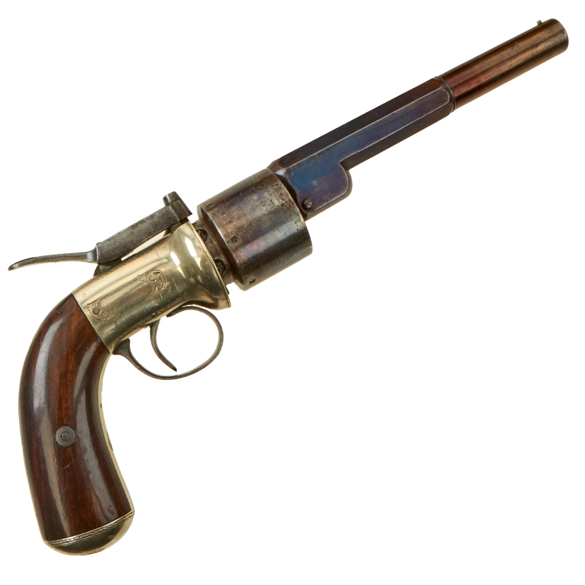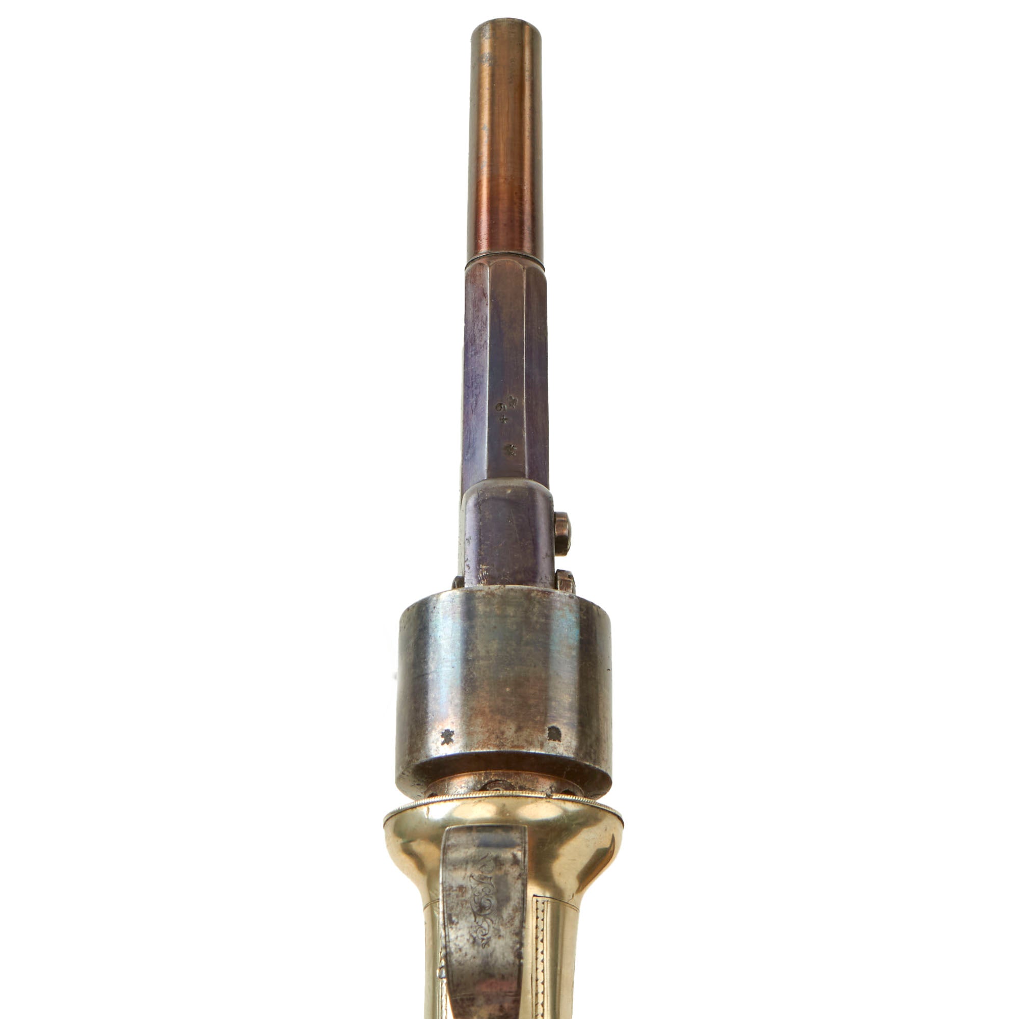 Original Item: Only One Available. This is a lovely example of a rare Baker's Patent Nickel Silver Framed percussion revolver, complete with a fantastic custom case an accessories. Thomas Kerslake Baker was a gunmaker in Victorian England, and worked out of 88 Fleet Street in London. He is most known for is 1852 Patent of a "Longspur" cocking handle for single action revolvers, which did achieve some popularity at the time. Not only did it allow easy cocking of the revolver, it also has a cutout in the left side as well as a slight offset to the right, with a notch sight at the bottom of the cutout. This allowed accurate sighting of the revolver, something often not possible with this design of revolver.