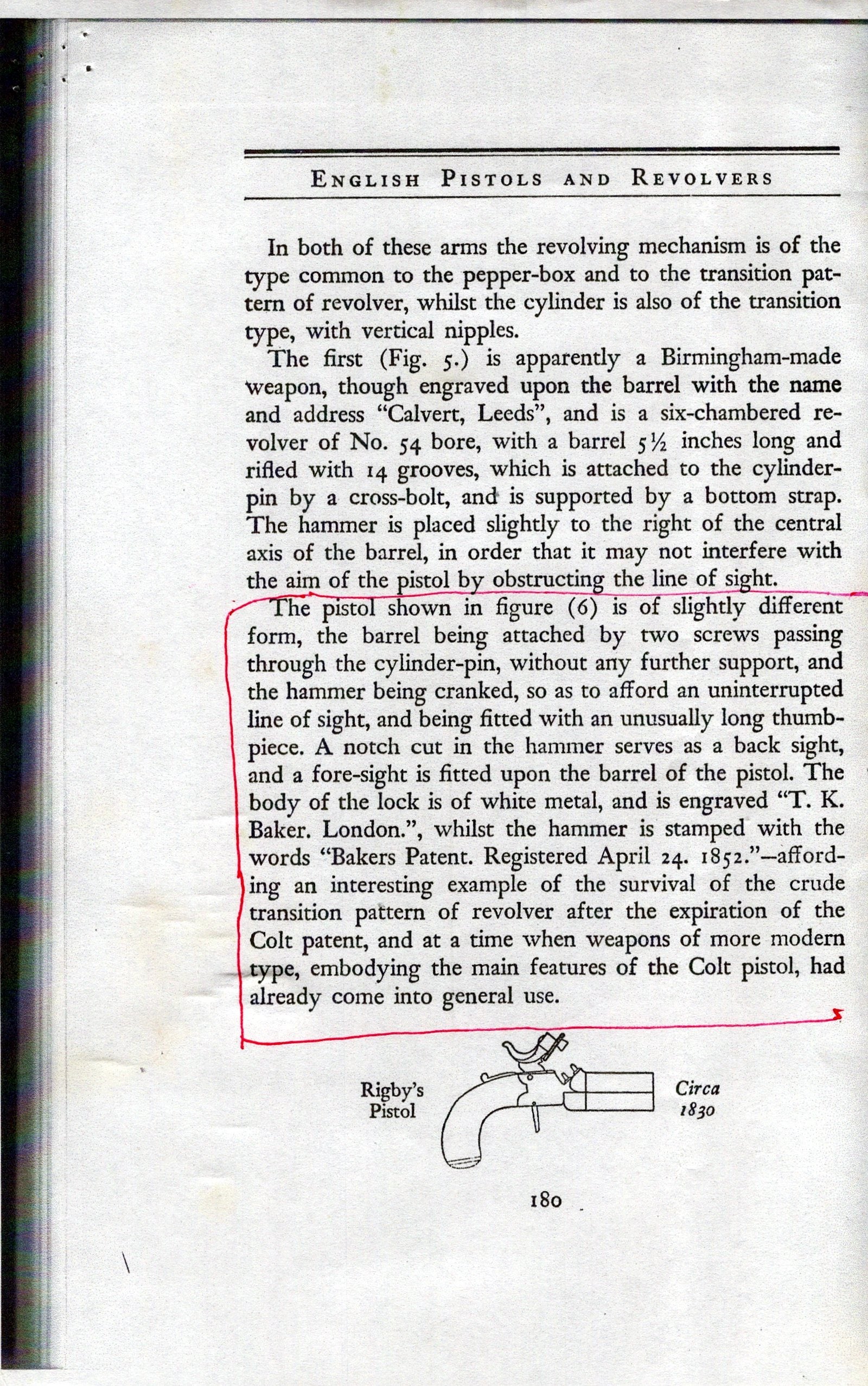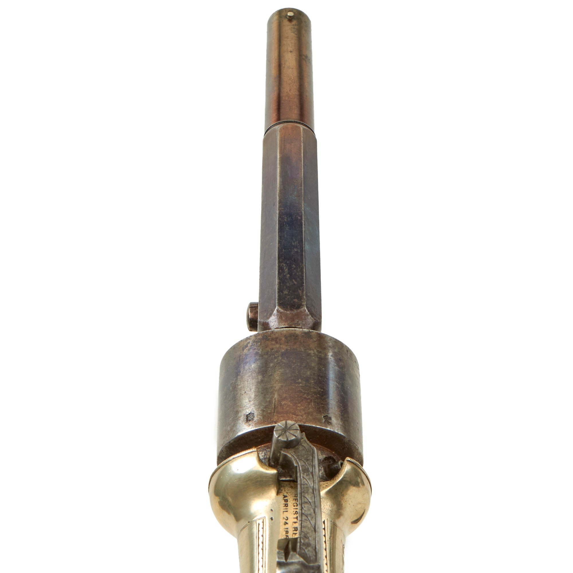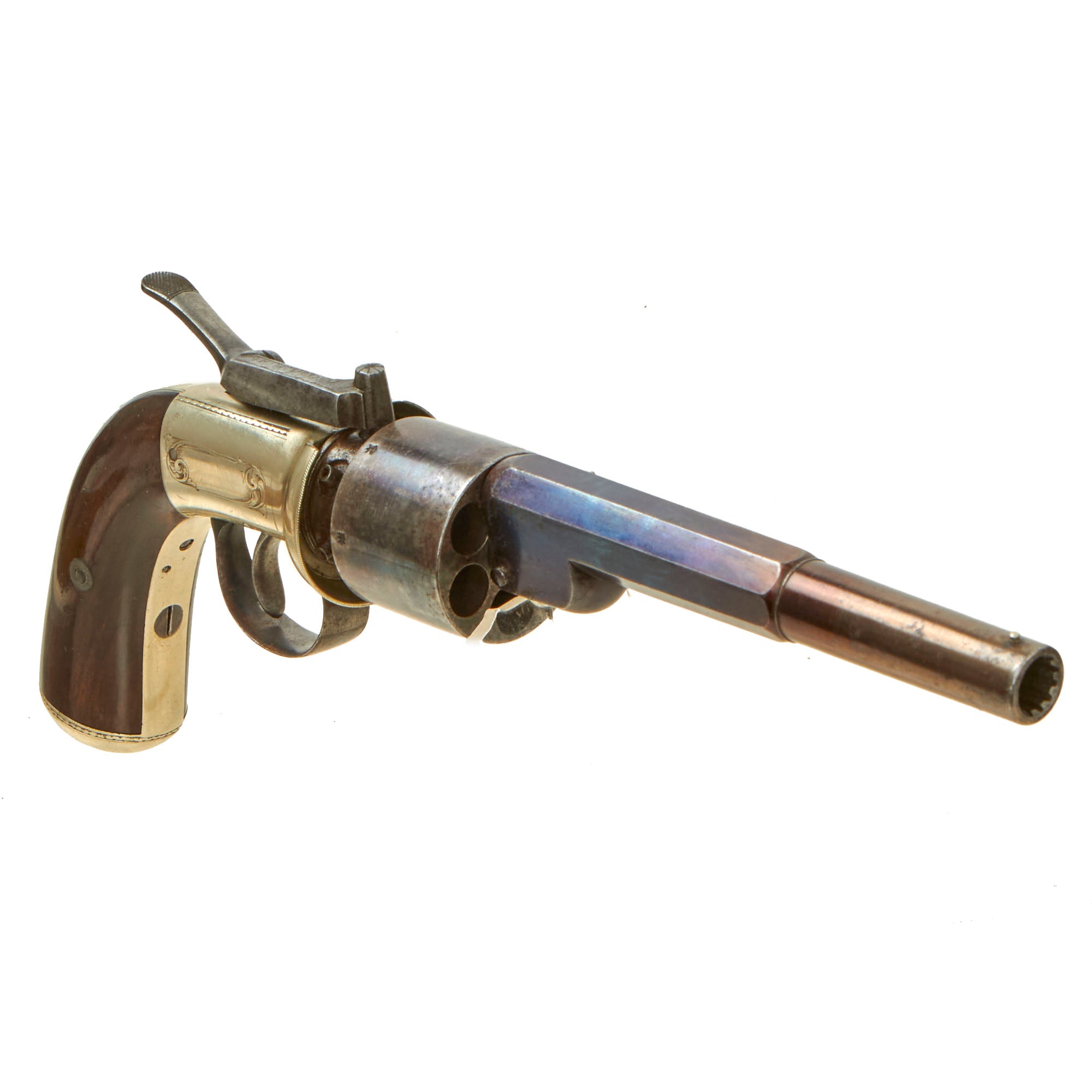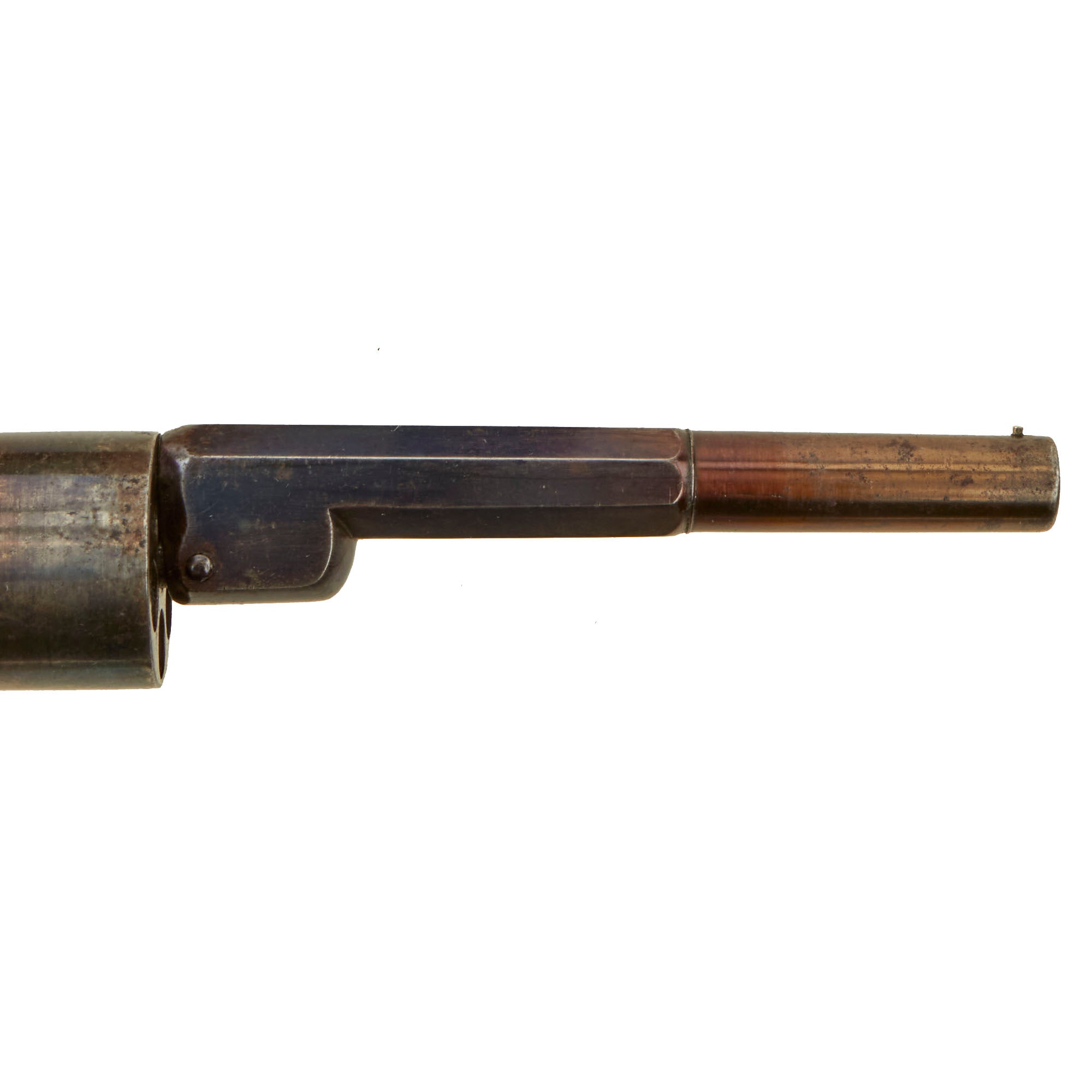 Original Item: Only One Available. This is a lovely example of a rare Baker's Patent Nickel Silver Framed percussion revolver, complete with a fantastic custom case an accessories. Thomas Kerslake Baker was a gunmaker in Victorian England, and worked out of 88 Fleet Street in London. He is most known for is 1852 Patent of a "Longspur" cocking handle for single action revolvers, which did achieve some popularity at the time. Not only did it allow easy cocking of the revolver, it also has a cutout in the left side as well as a slight offset to the right, with a notch sight at the bottom of the cutout. This allowed accurate sighting of the revolver, something often not possible with this design of revolver.