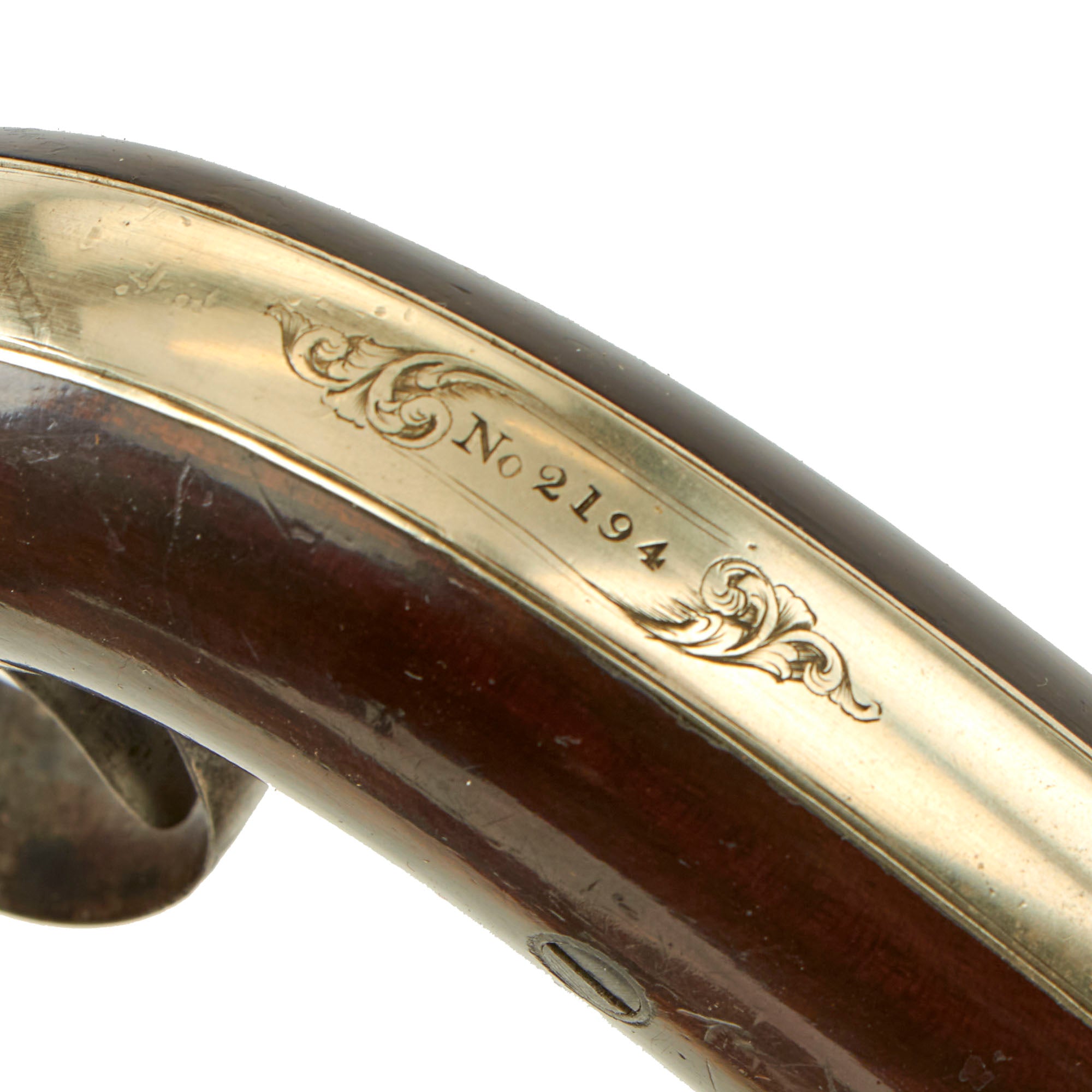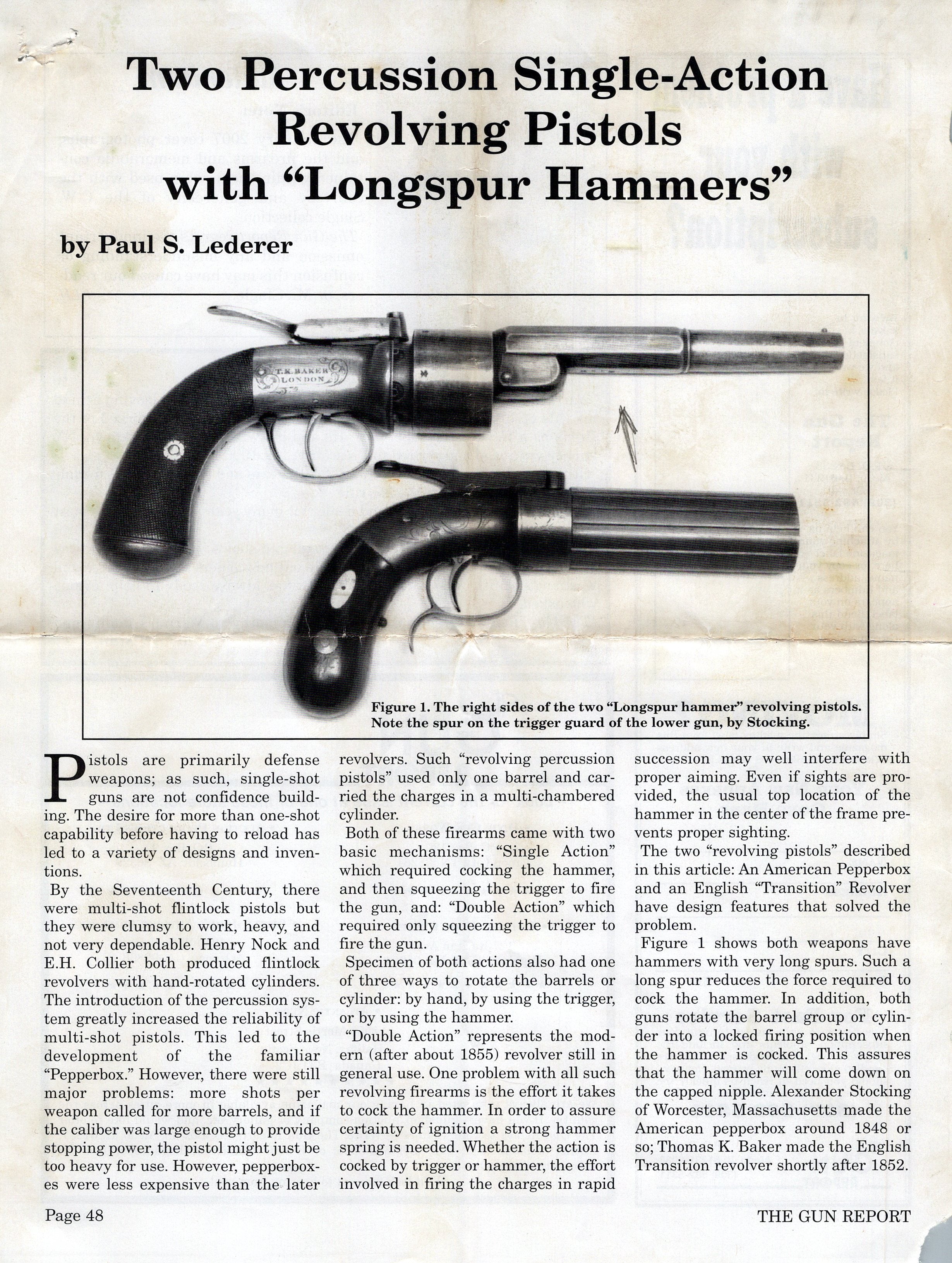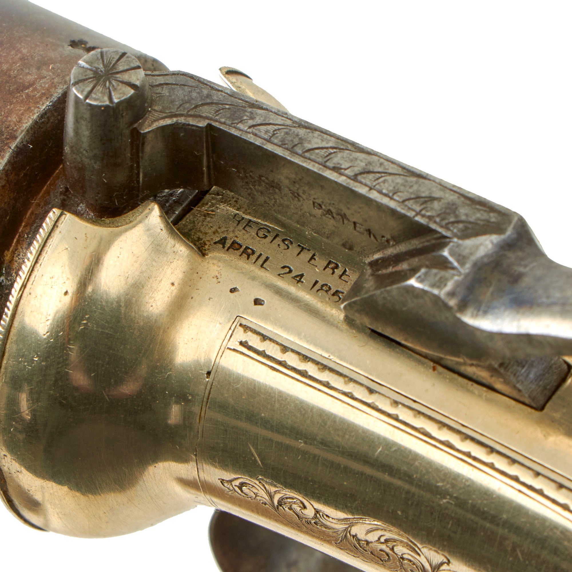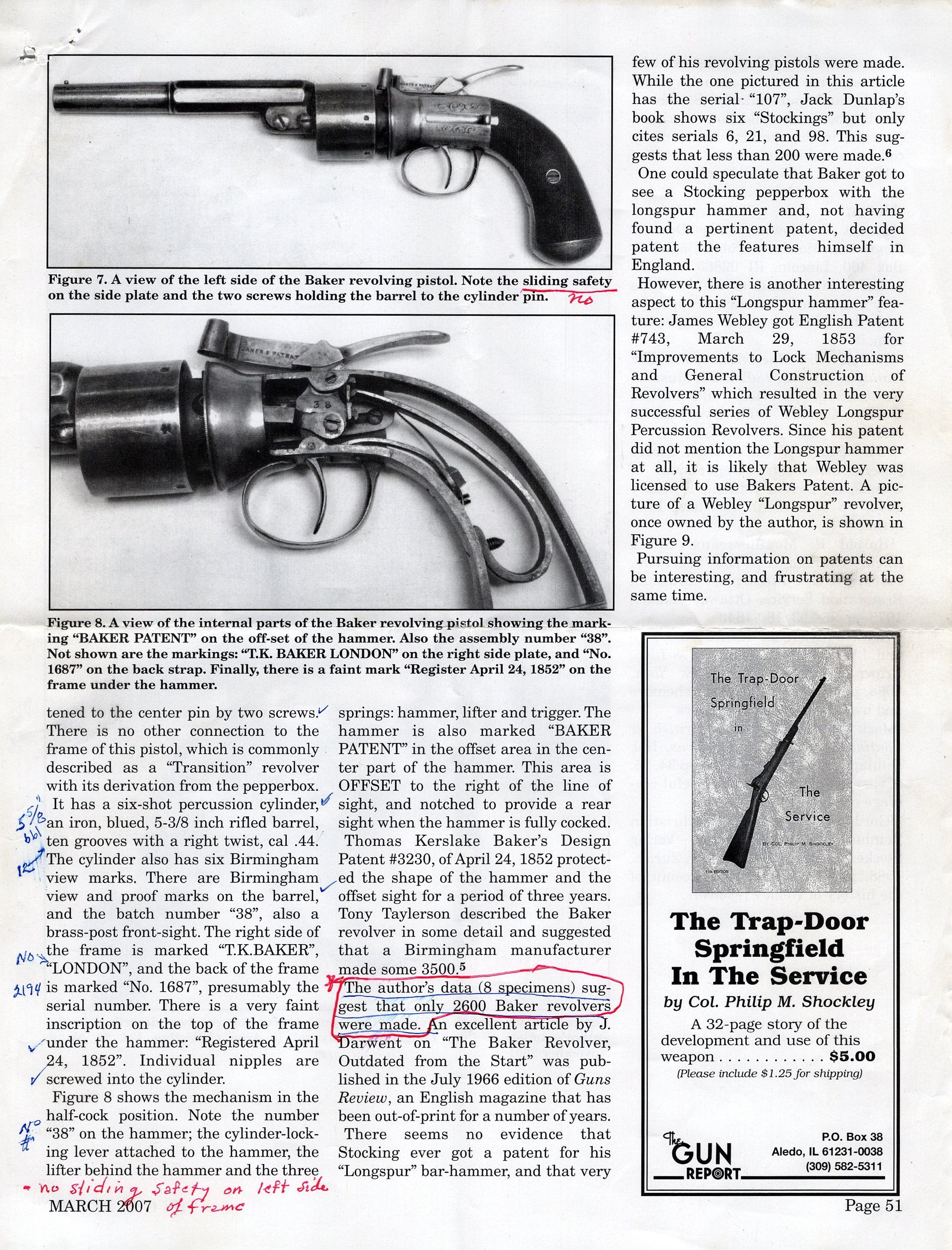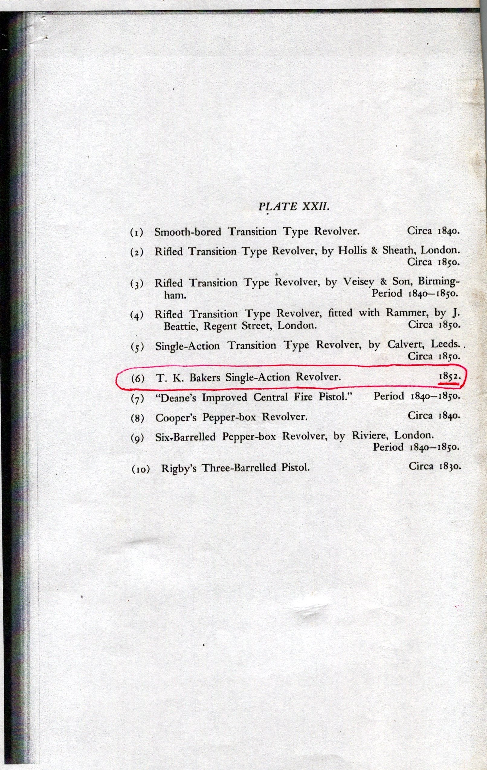 Original Item: Only One Available. This is a lovely example of a rare Baker's Patent Nickel Silver Framed percussion revolver, complete with a fantastic custom case an accessories. Thomas Kerslake Baker was a gunmaker in Victorian England, and worked out of 88 Fleet Street in London. He is most known for is 1852 Patent of a "Longspur" cocking handle for single action revolvers, which did achieve some popularity at the time. Not only did it allow easy cocking of the revolver, it also has a cutout in the left side as well as a slight offset to the right, with a notch sight at the bottom of the cutout. This allowed accurate sighting of the revolver, something often not possible with this design of revolver.