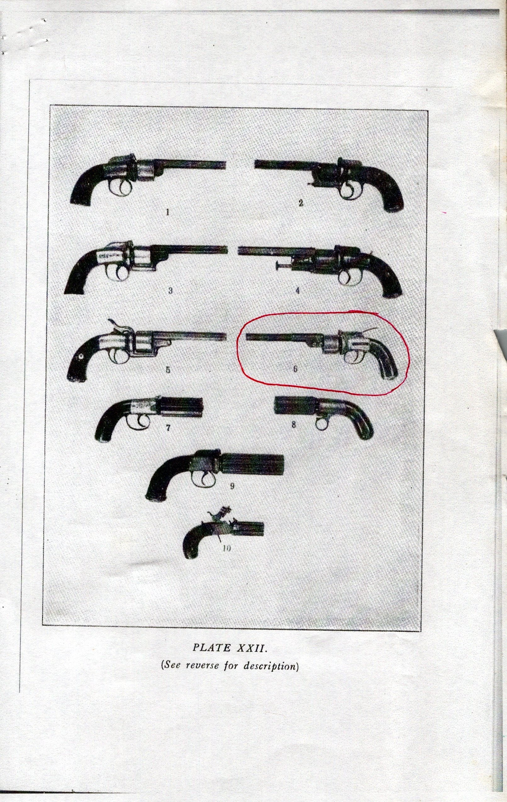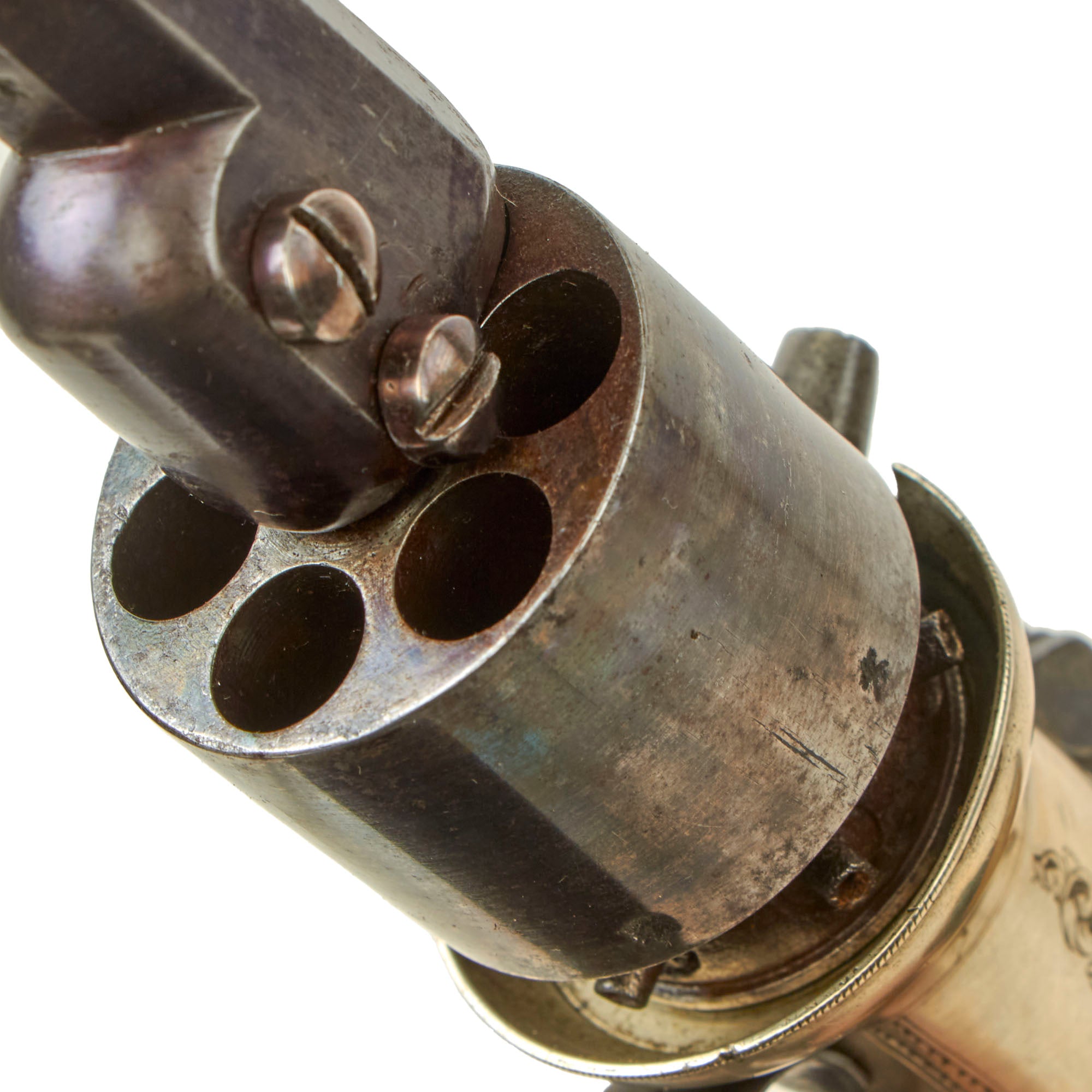 This is exactly the type of hammer featured on this revolver, which is really a beautiful piece. It features a lovely Nickel Silver frame that has foliate engraving on both sides, and there is a lovely engraved accent on the rear of the grip frame as well, which surrounds the serial No 2194. We have seen some British pepperbox revolvers that have a similar style, and it's very possible that the action was adopted from one of those, as the action mechanics are completely behind the cylinder. It does not feature any kind of top or bottom strap around the cylinder, and the barrel is retained solely by two screws on the central "pillar" style arbor pin.