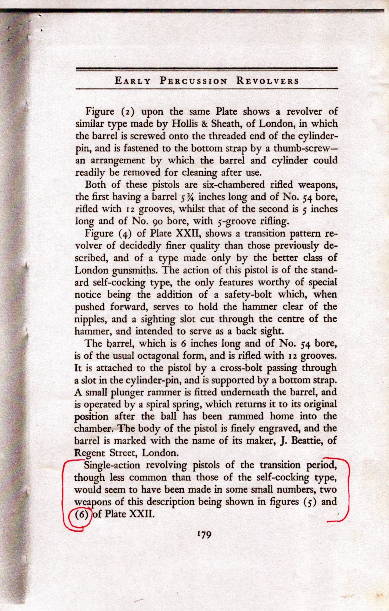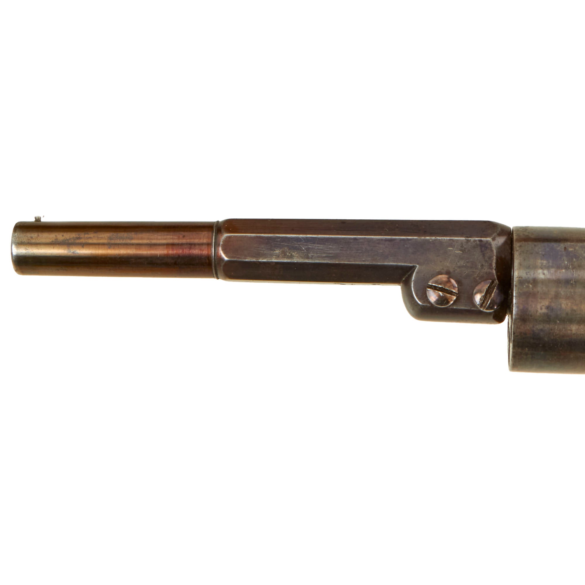 We tested the action, and it really is tight as a drum. We did not notice any deficiencies in cycling with indexing or the cylinder lockup. The bore is in very good condition, showing a partly bright finish and clear rifling, which looks to have about 12 grooves, popular with early percussion revolvers in England. It does show some past fouling and oxidation, now cleaned away, but is really quite nice compared to most we see. The cylinder is in great shape, with the cap nipple cones all still present, though they do show wear. Due to the angle they are on, we have no way to tell if they are still clear.