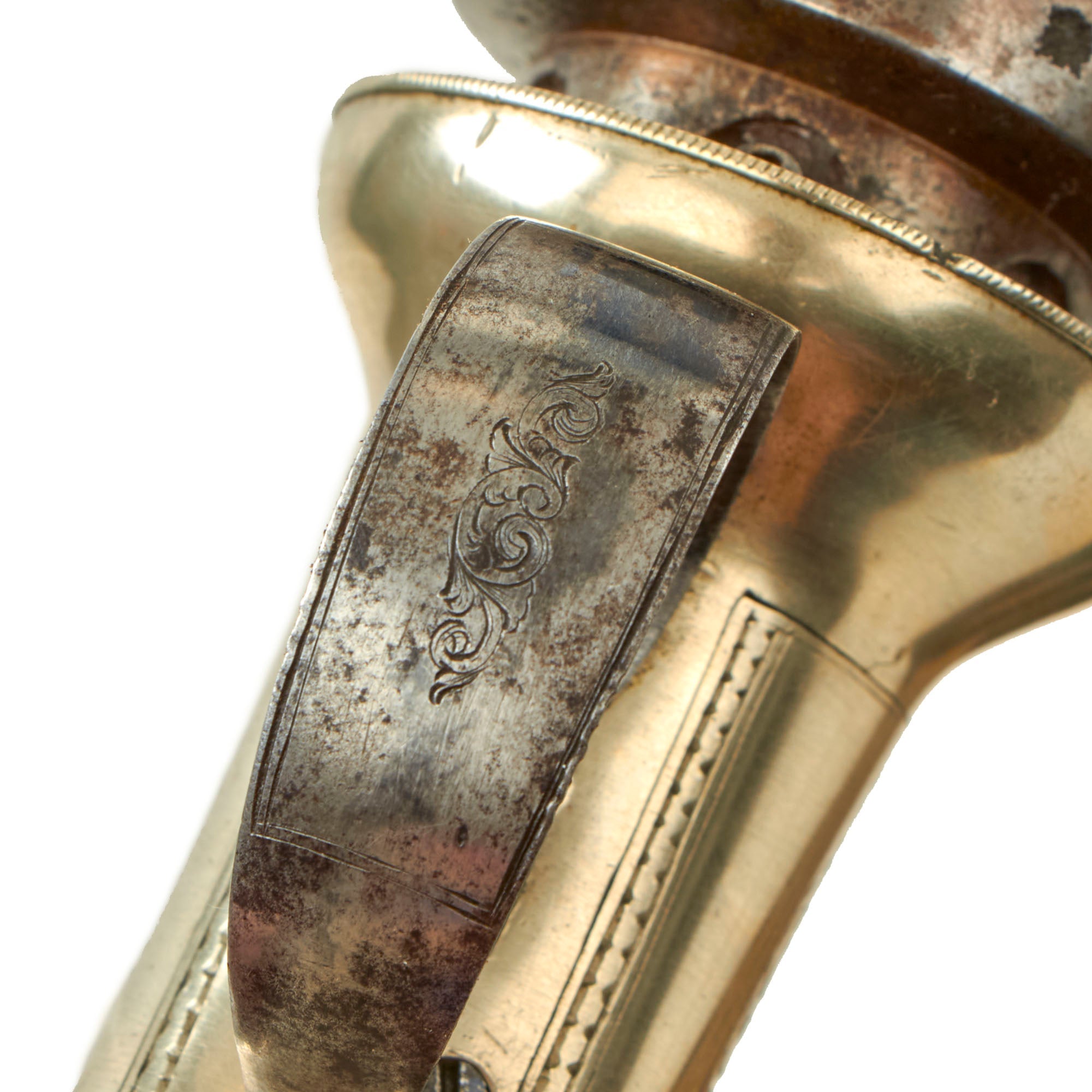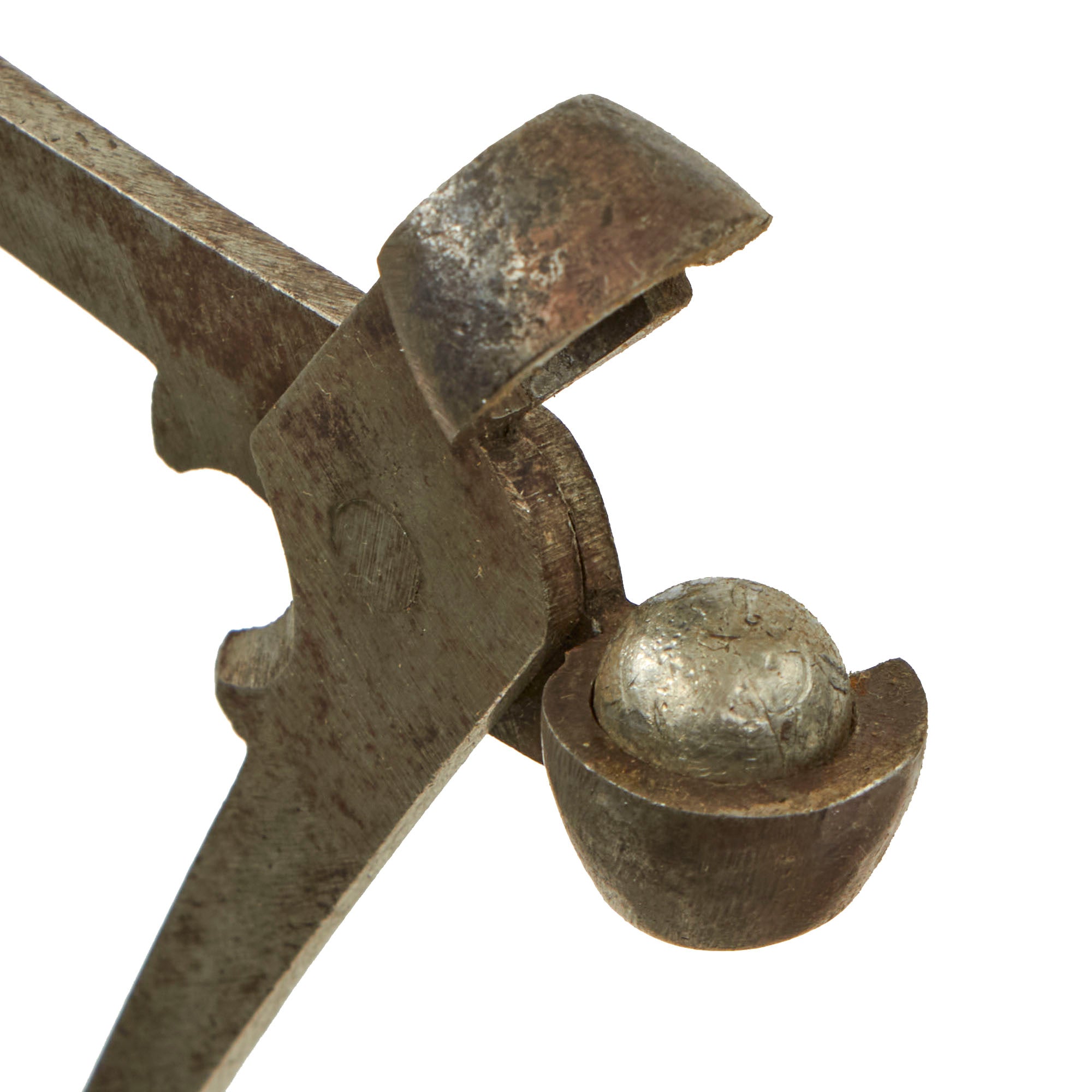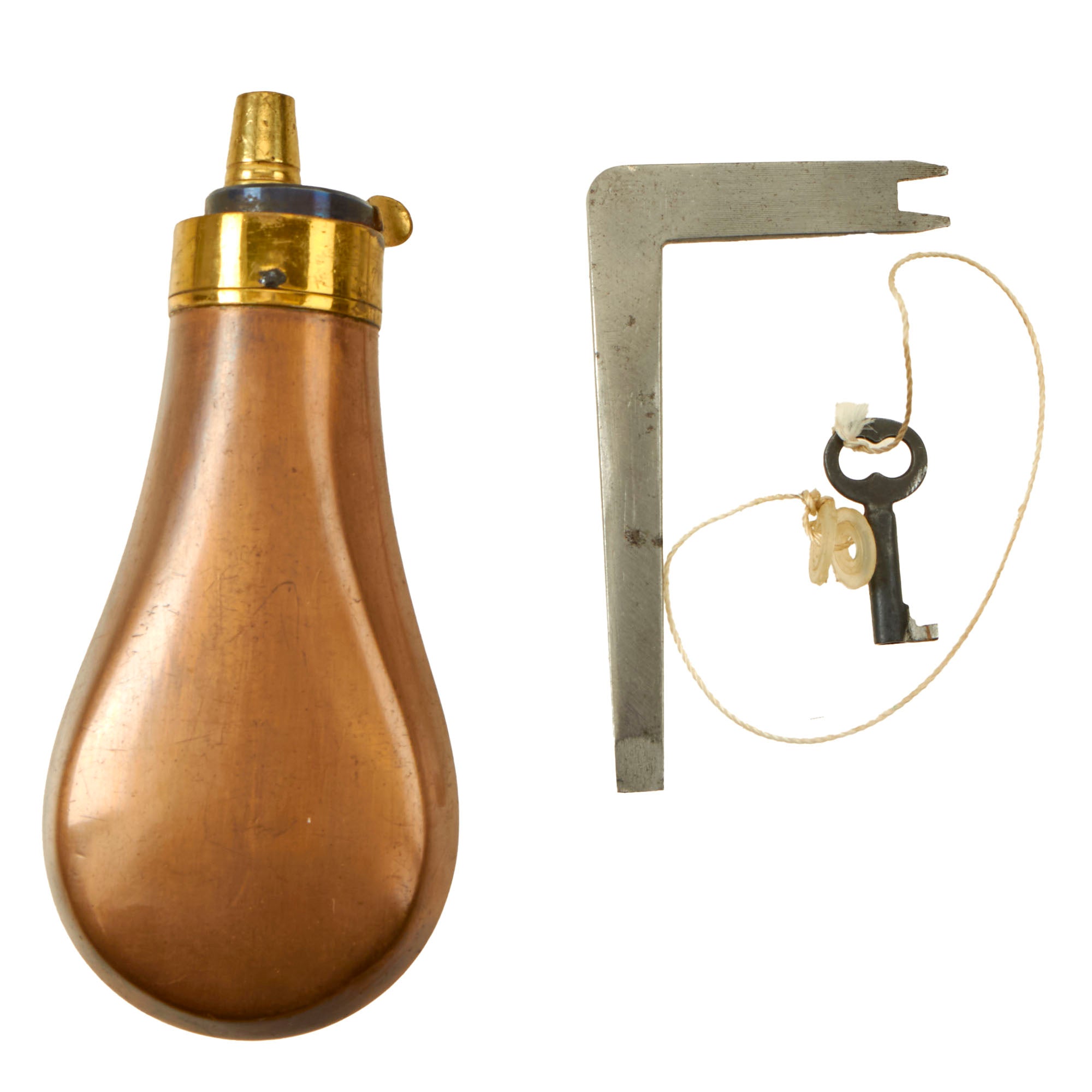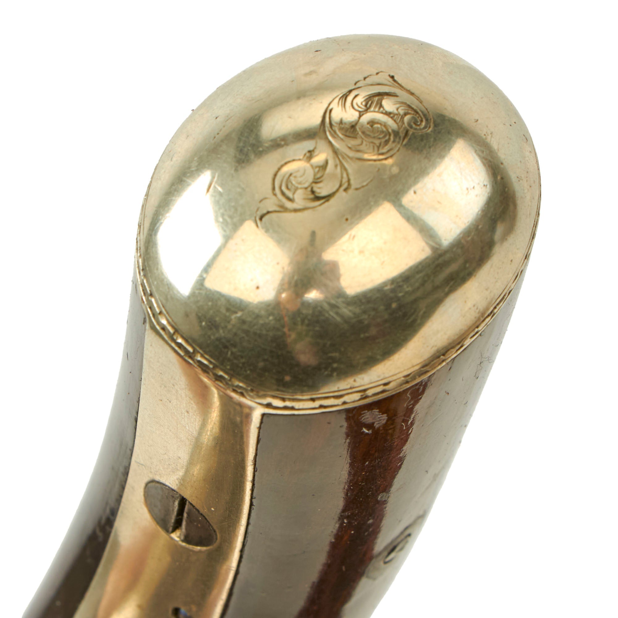 To make this offering even better, it came to us with a fantastic custom wood case, which measures approximately 12 3/4" x 6" x 2 3/8", and has different compartments inside, all dark green velvet lined. These are for various accessories one might use with the pistol, including a small copper powder flask, a small multi-tool with flathead and spanner head ends, and another tool that we cannot quite identify. It also has a small oil bottle, a cap of caps, and a lovely iron bullet mold that still has a round bullet inside. We also noticed that one of the "arms" of the mold doubles as a ramrod. The case is lovely, and as an added treat, there is the original manual sheet for the Baker's pistol glued onto the inside of the lid, which gives instructions on loading and cleaning. Also, it actually still has a functional lock in the front, along with the key to use it! We almost never see these with functional locks. It shows wear to the interior, and definitely has held the pistol for quite some time!