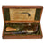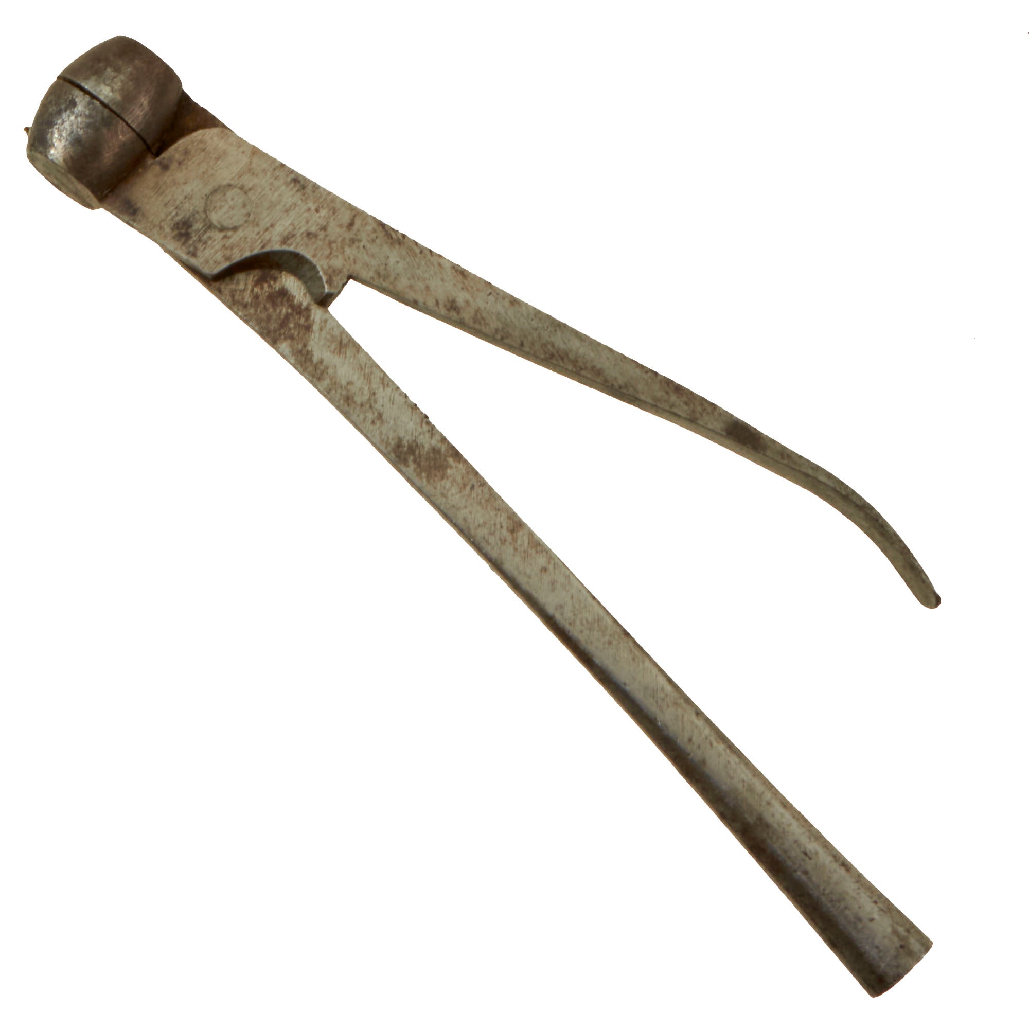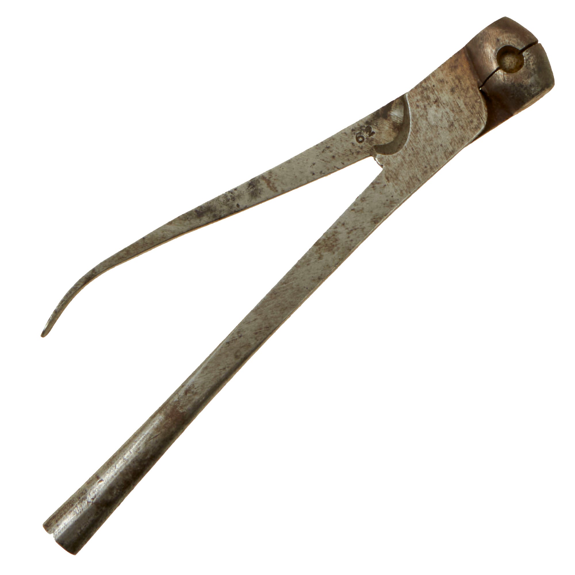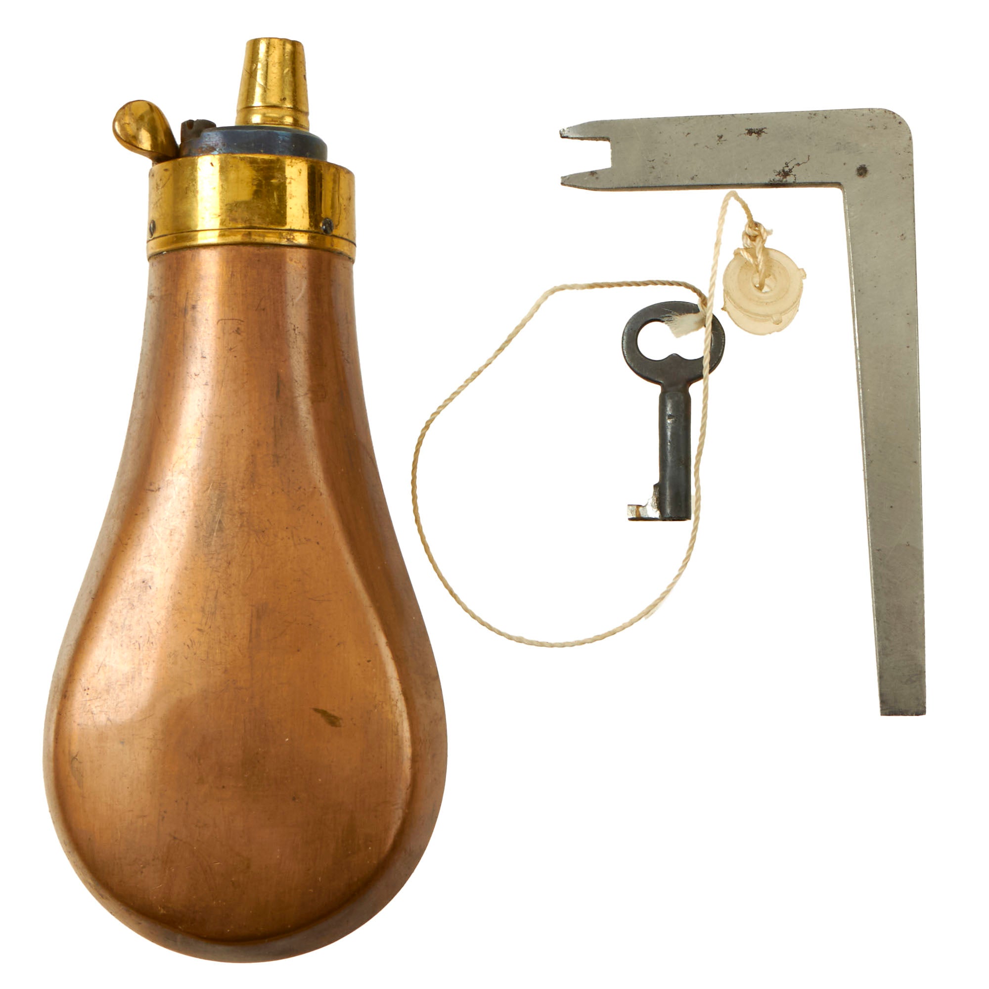 To make this offering even better, it came to us with a fantastic custom wood case, which measures approximately 12 3/4" x 6" x 2 3/8", and has different compartments inside, all dark green velvet lined. These are for various accessories one might use with the pistol, including a small copper powder flask, a small multi-tool with flathead and spanner head ends, and another tool that we cannot quite identify. It also has a small oil bottle, a cap of caps, and a lovely iron bullet mold that still has a round bullet inside. We also noticed that one of the "arms" of the mold doubles as a ramrod. The case is lovely, and as an added treat, there is the original manual sheet for the Baker's pistol glued onto the inside of the lid, which gives instructions on loading and cleaning. Also, it actually still has a functional lock in the front, along with the key to use it! We almost never see these with functional locks. It shows wear to the interior, and definitely has held the pistol for quite some time!