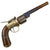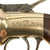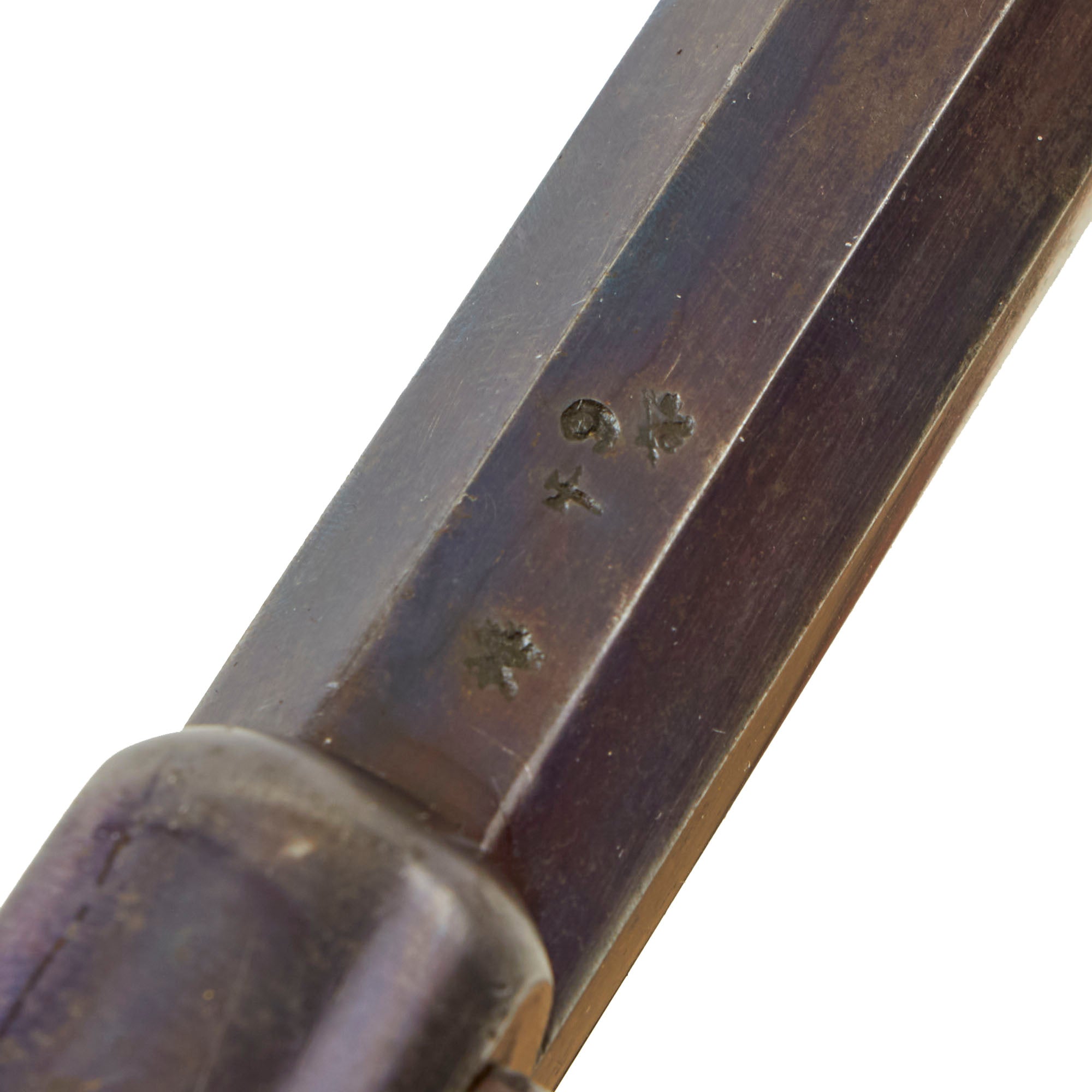 The underside of the octagonal barrel is marked with the CROWN / CROSSED SCEPTERS / BPC "black powder proof" and CROWN / CROSSED SCEPTERS / V "viewed" marks from the city of Birmingham. There is also a 64 assembly number on the underside of the barrel between the proofs, which matches the number on the back of the cylinder. There are additional "viewed" marks on the cylinder, one for each cap nipple cone. This city was well known for its firearms industry, which supplied many guns to smaller gun shops and outfitters.