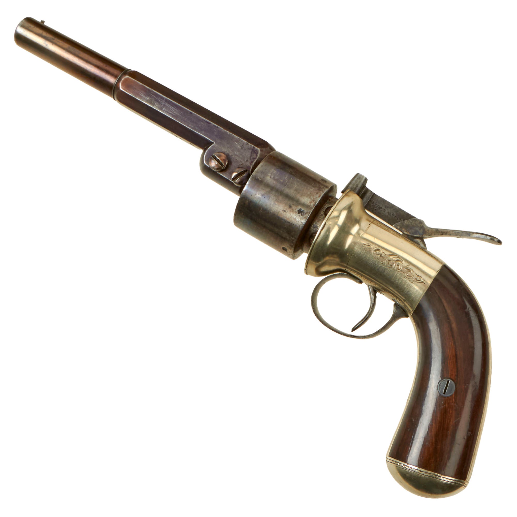 The revolver is exactly what a Victorian Gentleman might have concealed in his overcoat pocket to deal with the then all too common Foot Pads and Brigands. Nicely engraved decoration, and a fantastic look. One could see the owner keeping it in the case at home after it was serviced after each foray into the outside. Ready to research and display!