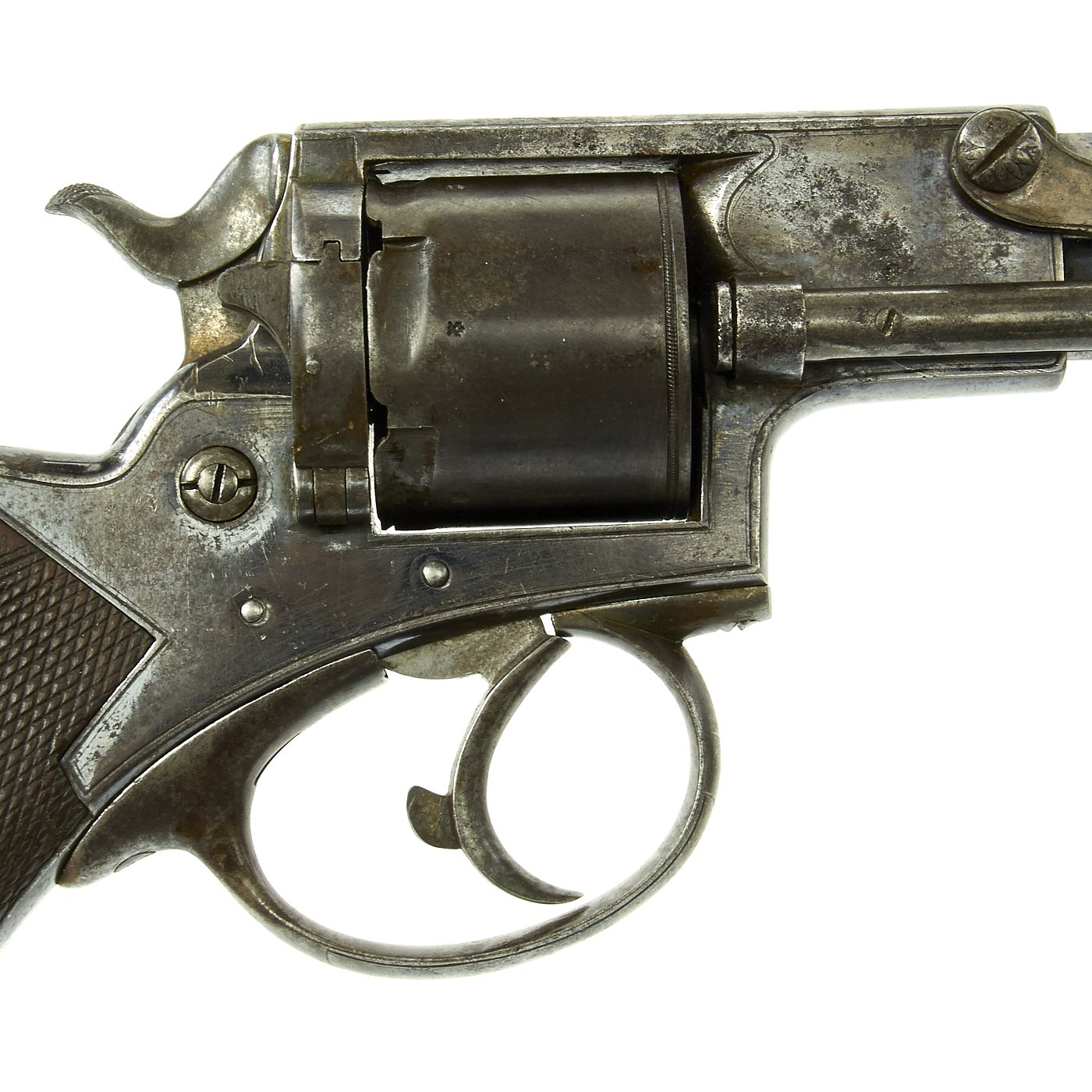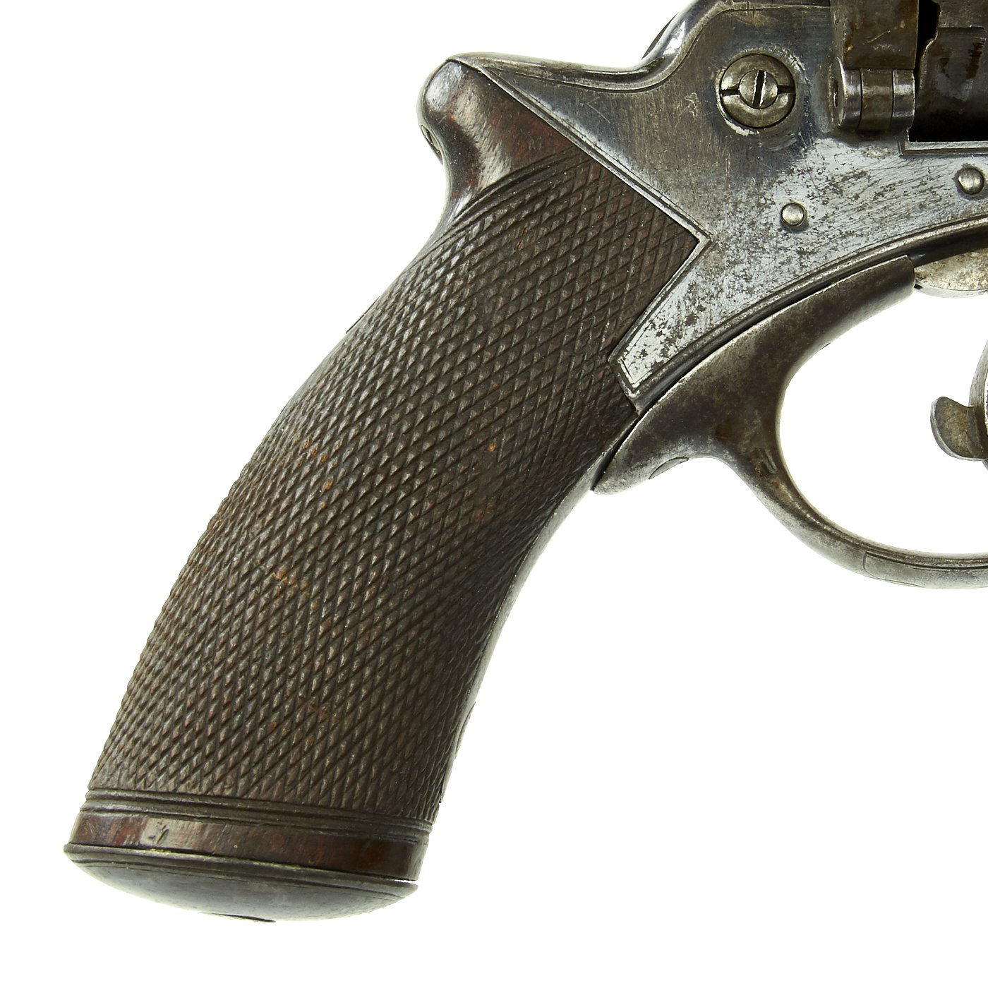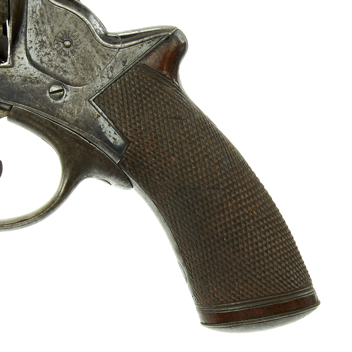Retaining much original blue finish with some wear spots, the walnut checkered wood grip shows hardly any wear whatsoever. This is most certainly a very desirable and fine condition British Officer's Campaign Revolver. Six Shot with side gate access on the right hand side to the rear of the chamber for re-loading.