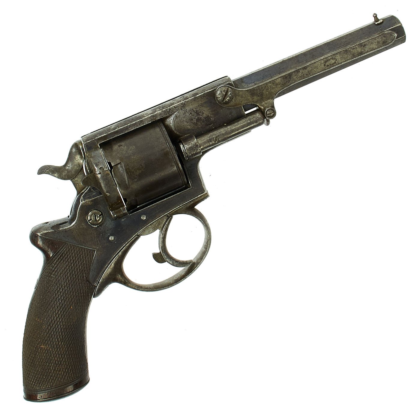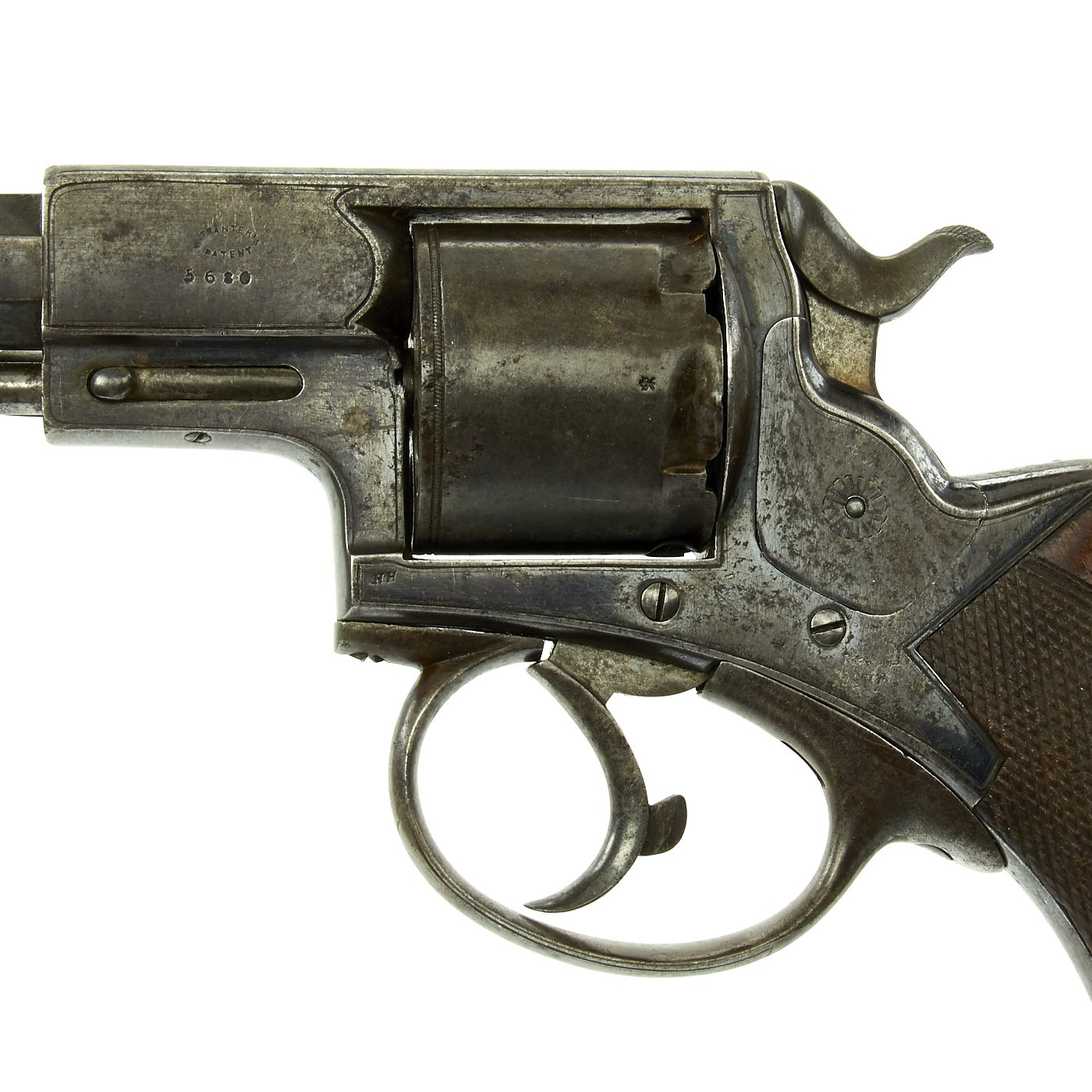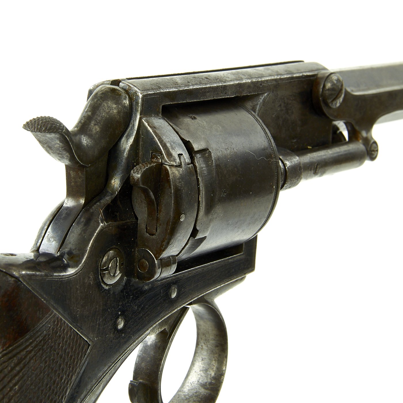 Retaining much original blue finish with some wear spots, the walnut checkered wood grip shows hardly any wear whatsoever. This is most certainly a very desirable and fine condition British Officer's Campaign Revolver. Six Shot with side gate access on the right hand side to the rear of the chamber for re-loading.