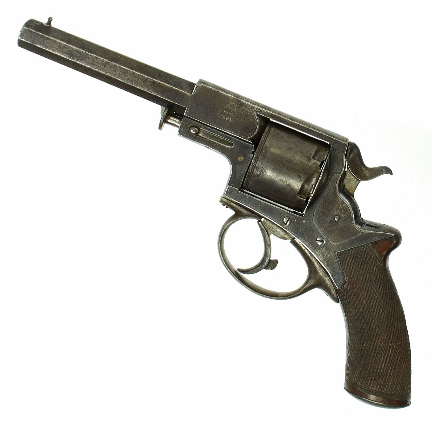Here is an excellent example, very possibly purchased by an Officer going overseas to one of the many parts of the empire where a military presence was needed. This is a truly up market example of Tranter's patent Revolver, with the supplier information engraved on the top of the barrel: