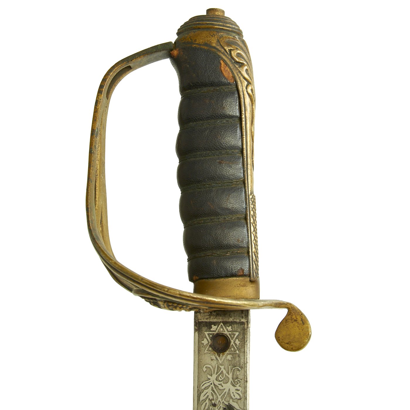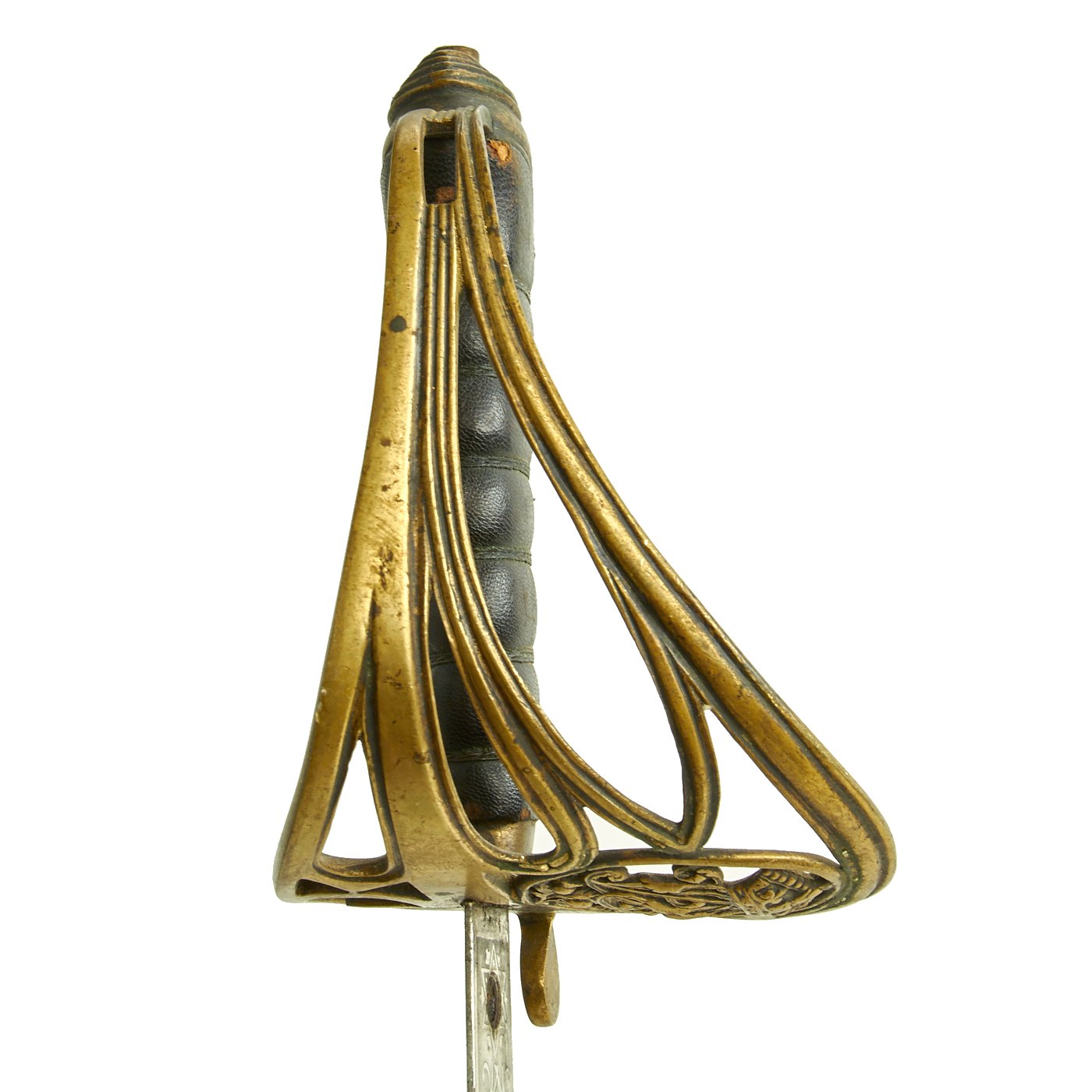The grip is leather wrapped wood, and the wire wrapping is intact and complete. The basket has a lovely lightly oxidized patina. The blade is tight to the grip, and the nickel plating is still in very good condition, with only some flaking towards the tip of the blade, as shown.