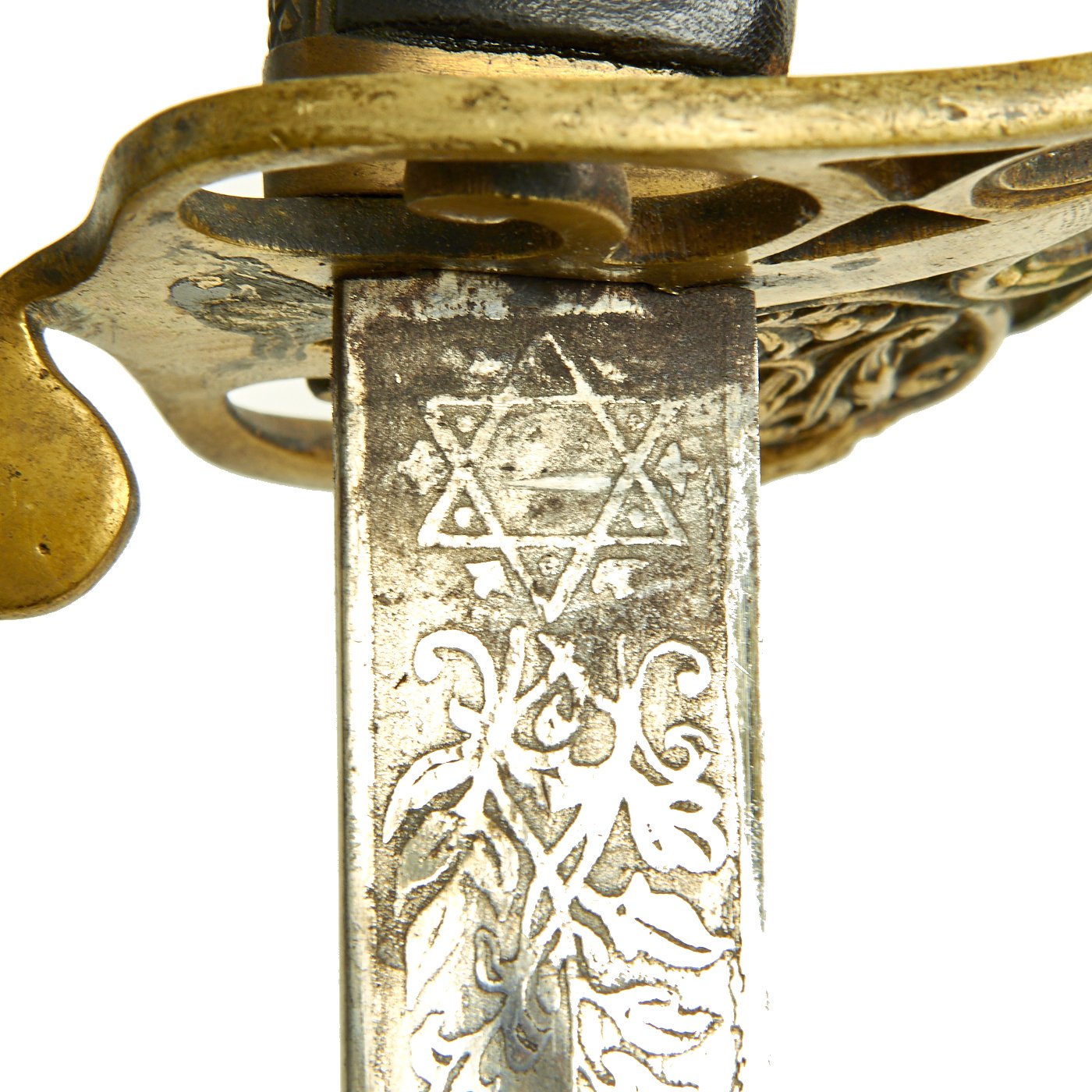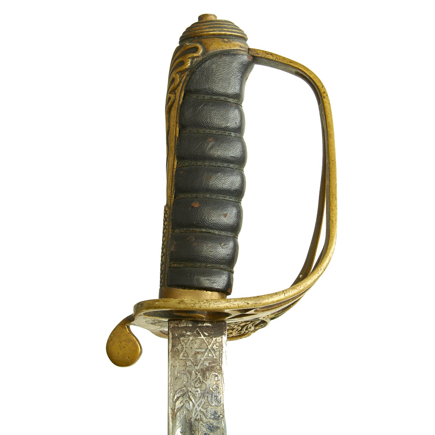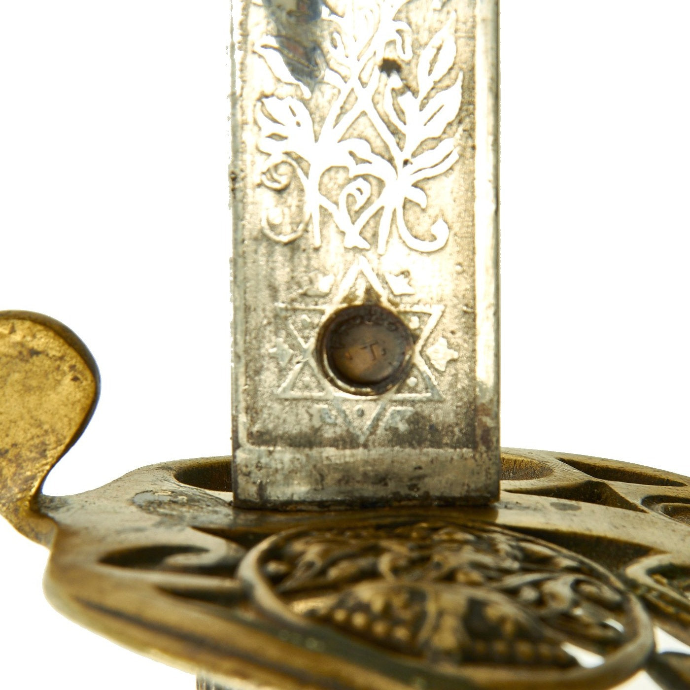 The blade ricasso has the standard 6 pointed star around a brass plug stamped PROVED / T, though this blade does not have any maker information that we can see. It was probably made specifically to order by an Officer, which would often use unmarked blades.