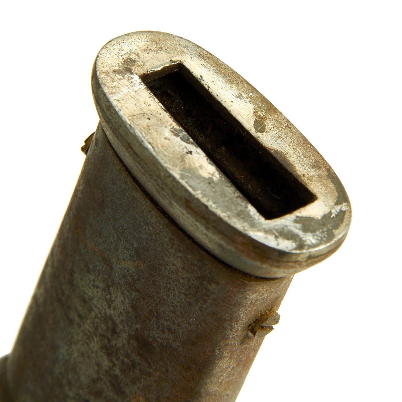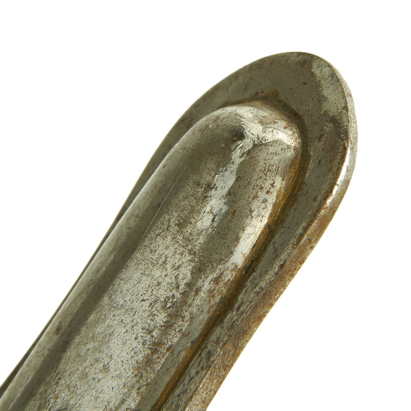 The scabbard is the standard straight steel type, with two hanger rings. It is nickel plated, though there is a lot of wear and oxidation to the plating. The scabbard is straight, with minimal dents, and has a lovely lightly oxidized patina.