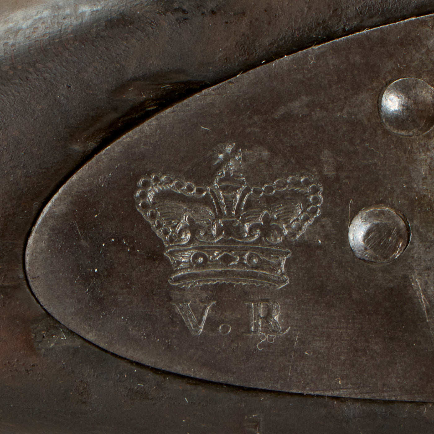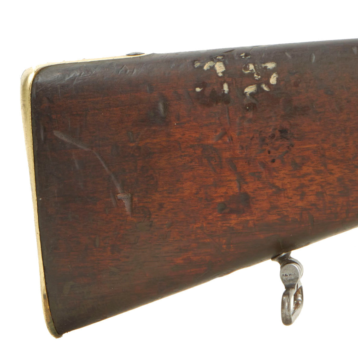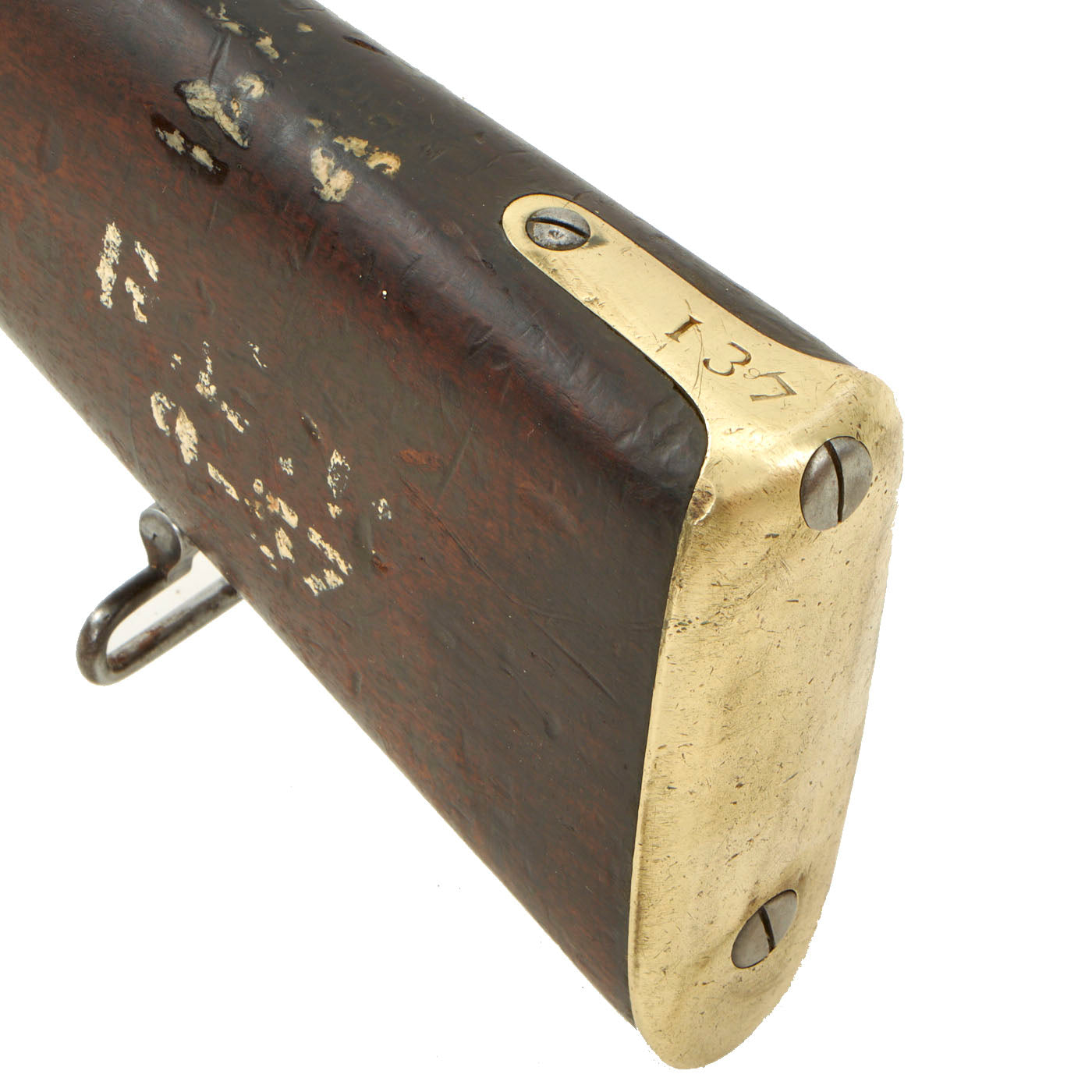 This very nice example is marked B.S.A. Co. / 1871 on the lock plate, for manufacture by the prolific Birmingham Small Arms Company. Above this is the correct "Lock Viewer's" CROWN / ARROW marking, and it also carries the stamping of the CROWN / V.R. across its tail. The V.R. proof indicates this rifle was made for the British Military, and was not an export or colonial service rifle. The brass Butt Plate marked with 137, the prison rack number.
