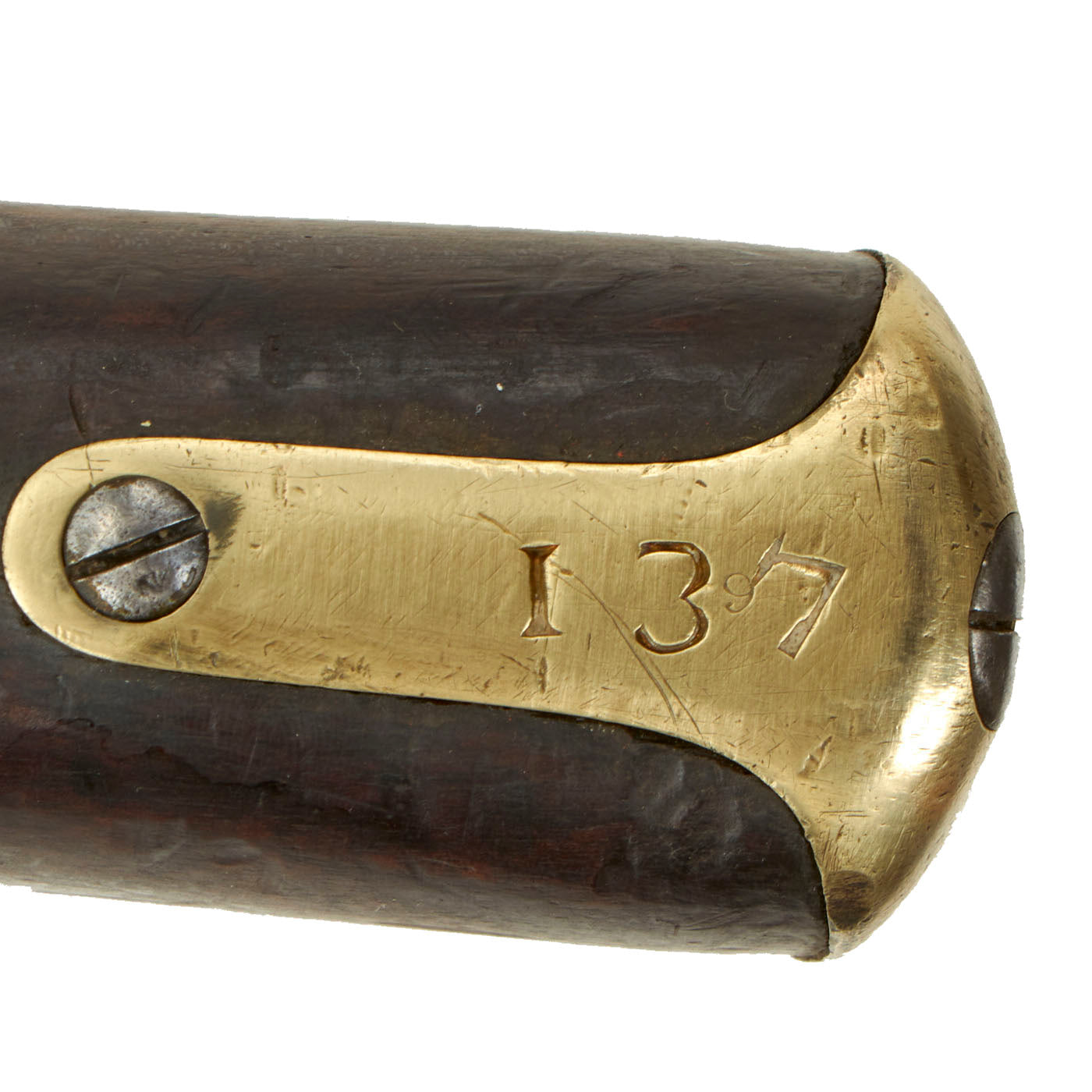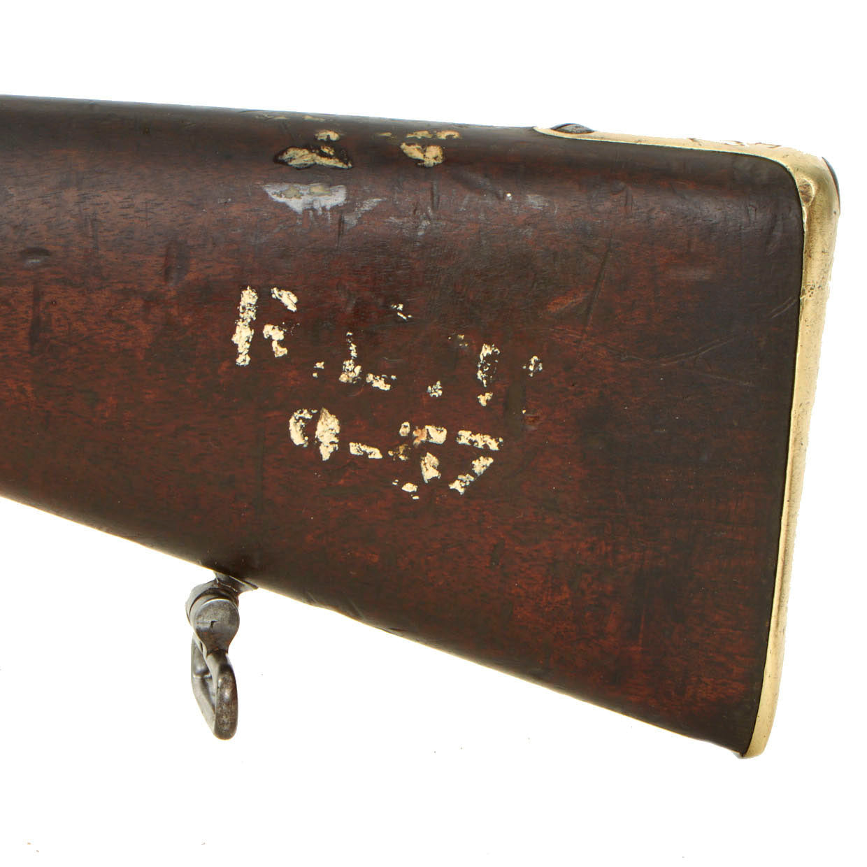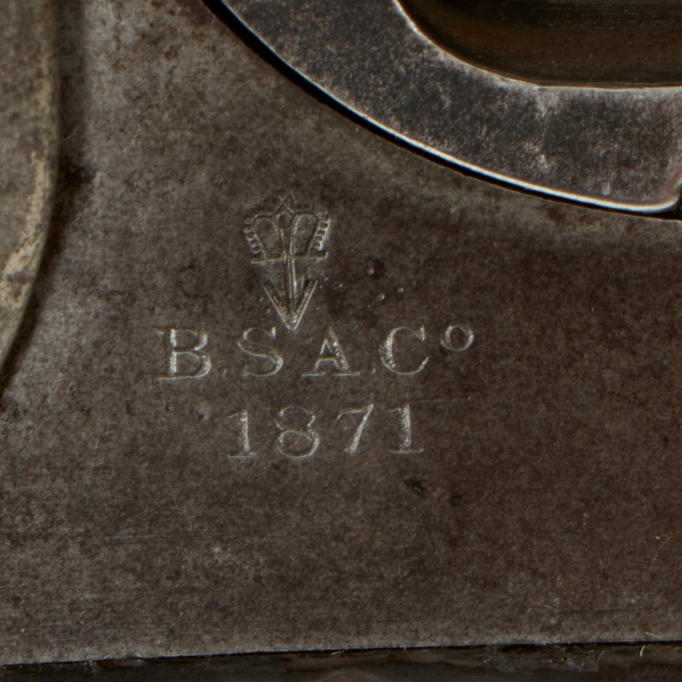 This very nice example is marked B.S.A. Co. / 1871 on the lock plate, for manufacture by the prolific Birmingham Small Arms Company. Above this is the correct "Lock Viewer's" CROWN / ARROW marking, and it also carries the stamping of the CROWN / V.R. across its tail. The V.R. proof indicates this rifle was made for the British Military, and was not an export or colonial service rifle. The brass Butt Plate marked with 137, the prison rack number.