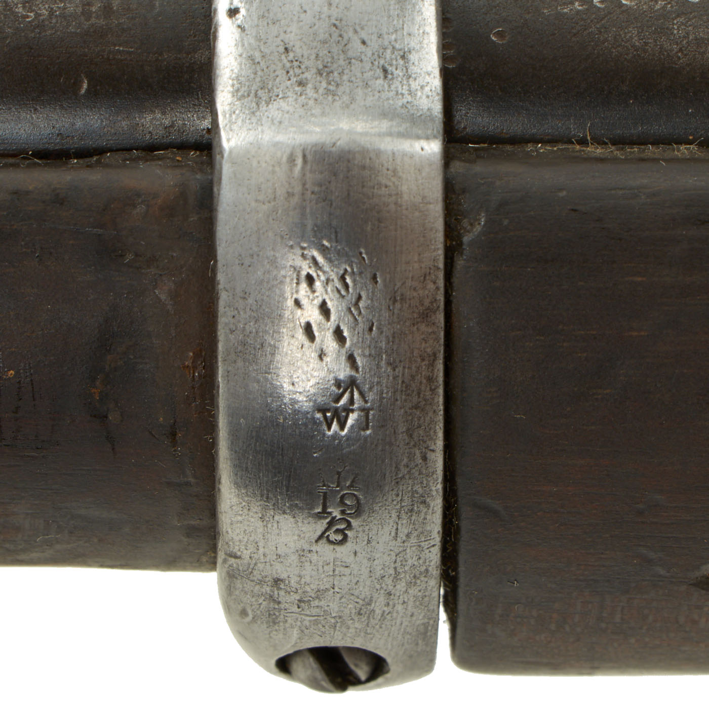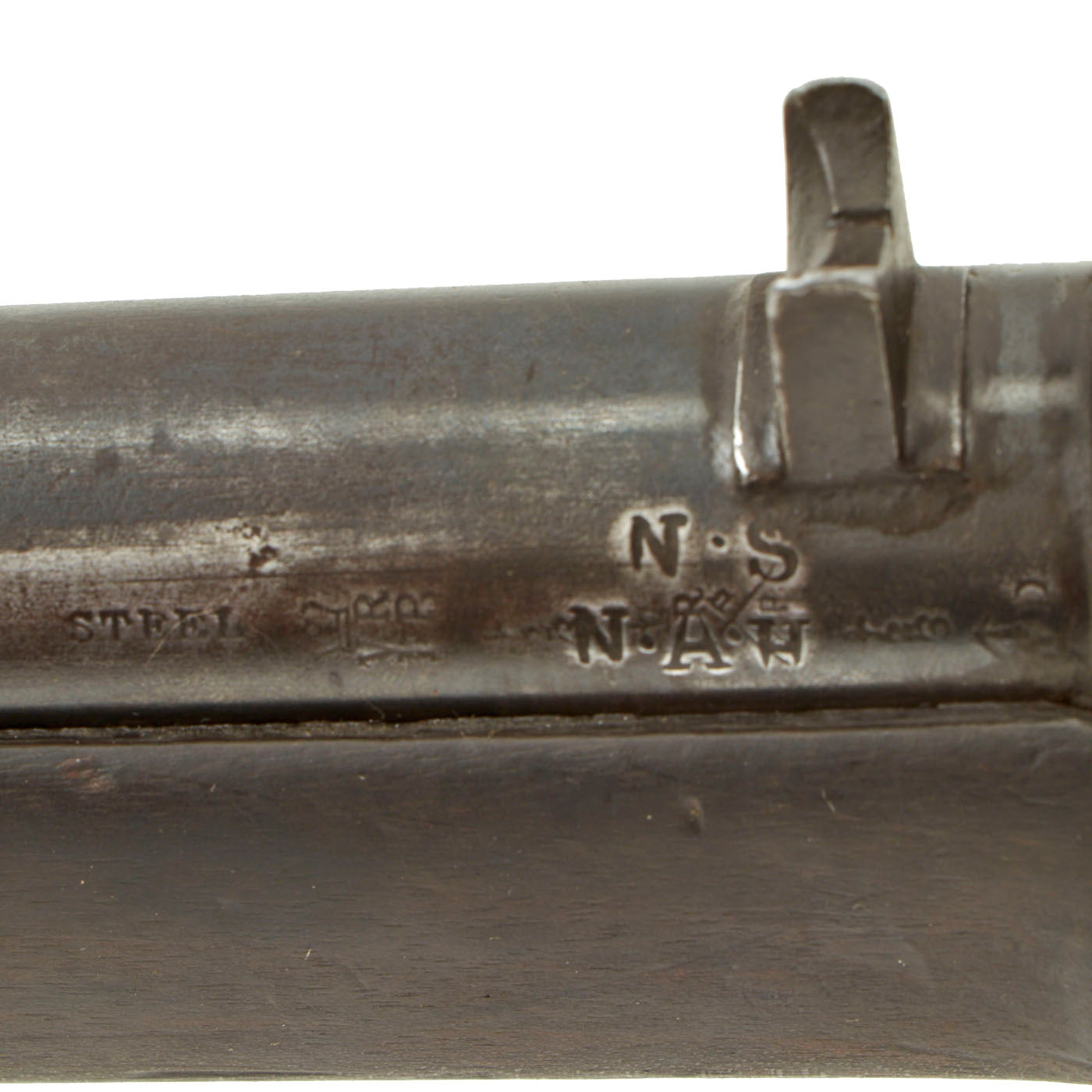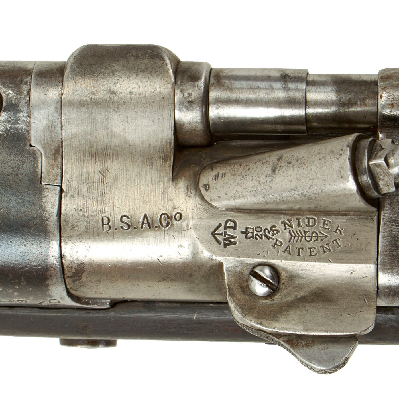 In fine shape, it is fitted with a Mark III action, as marked on the chamber. It is also marked B.S.A. Co. as well as SNIDER PATENT around the "Arrow S" proof, markings rarely seen on later non-converted examples. The breech block is the final locking version, and still locks very well. The barrel still has the original proof marks on the left side under the sight, and there are proof marks on many other parts of the rifle as well. There is a marking of N.S. / N.A.H., possibly indicating where it saw prison service. The lock still functions correctly, holding and half cock and firing at full. The smoothbore barrel has a bit of fouling and dirt inside, but does not show signs of much use at all.