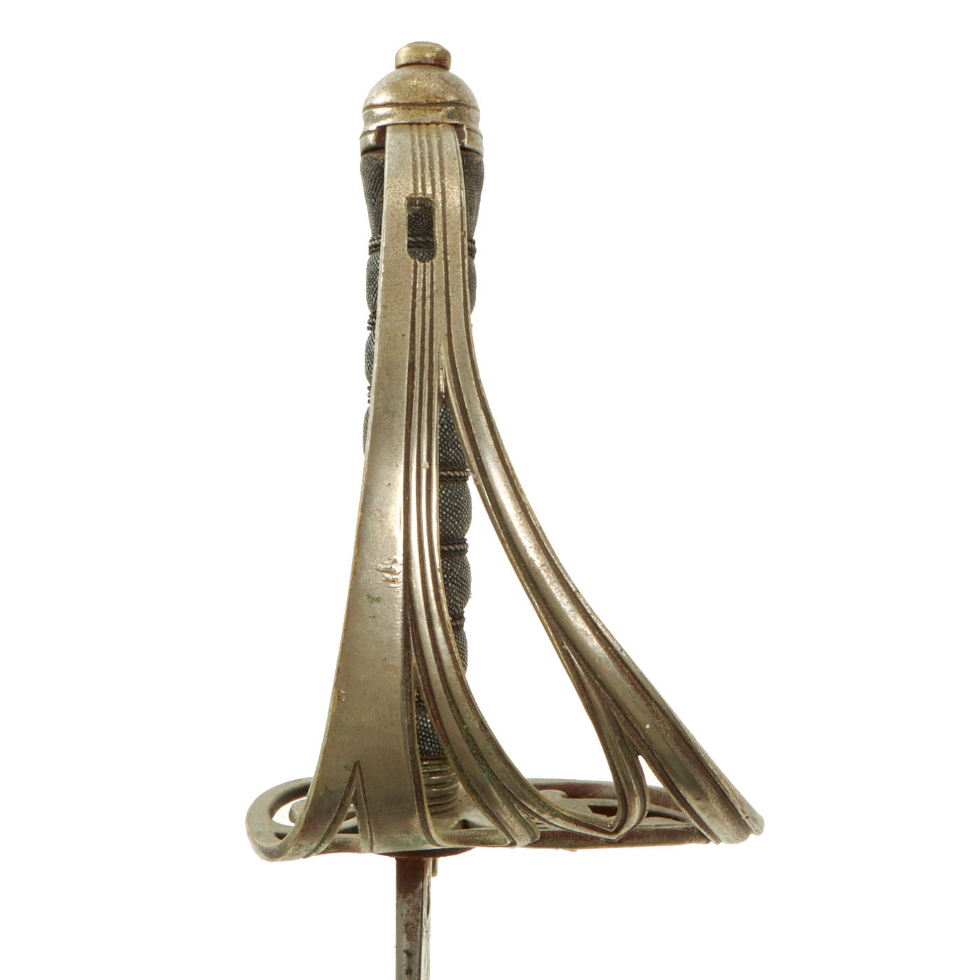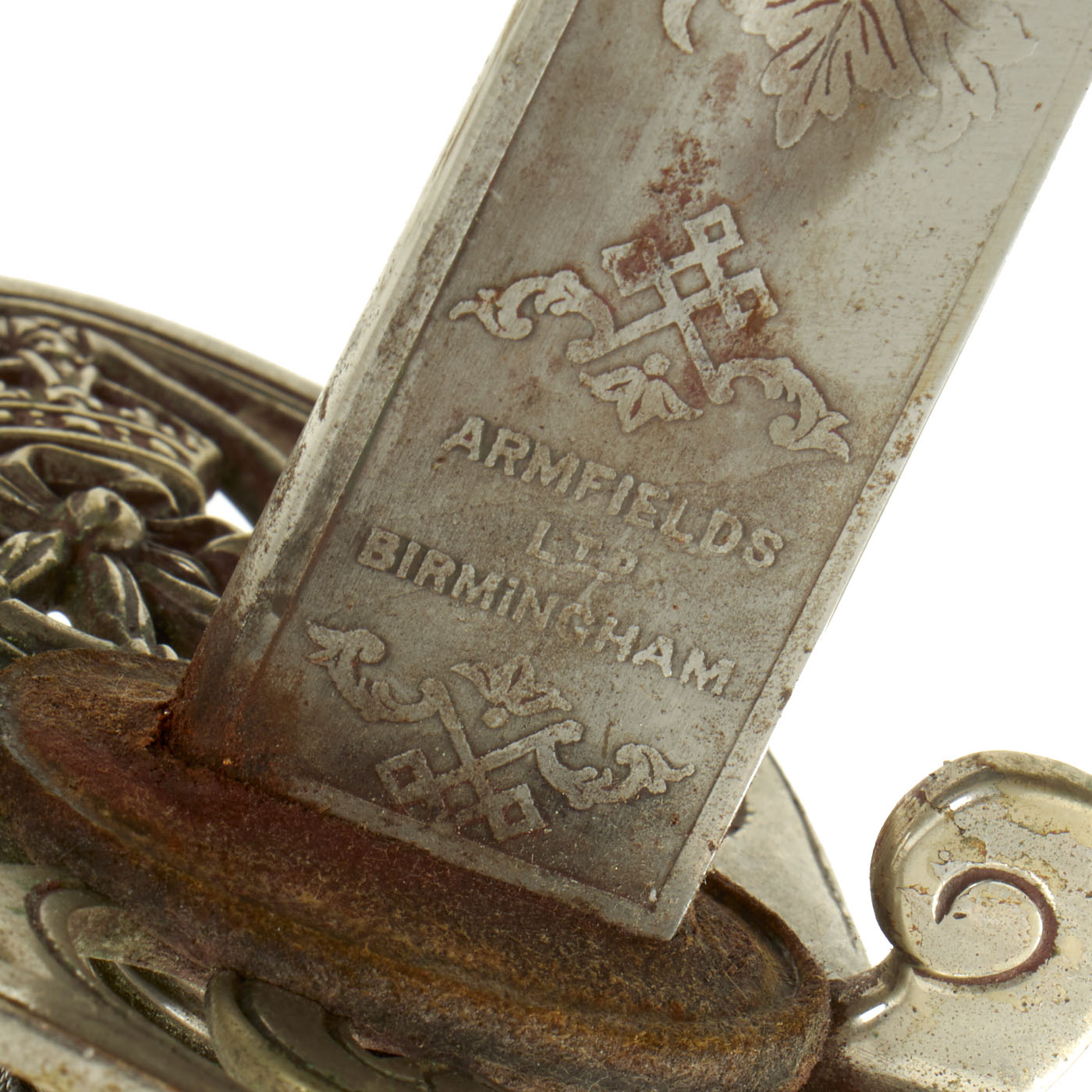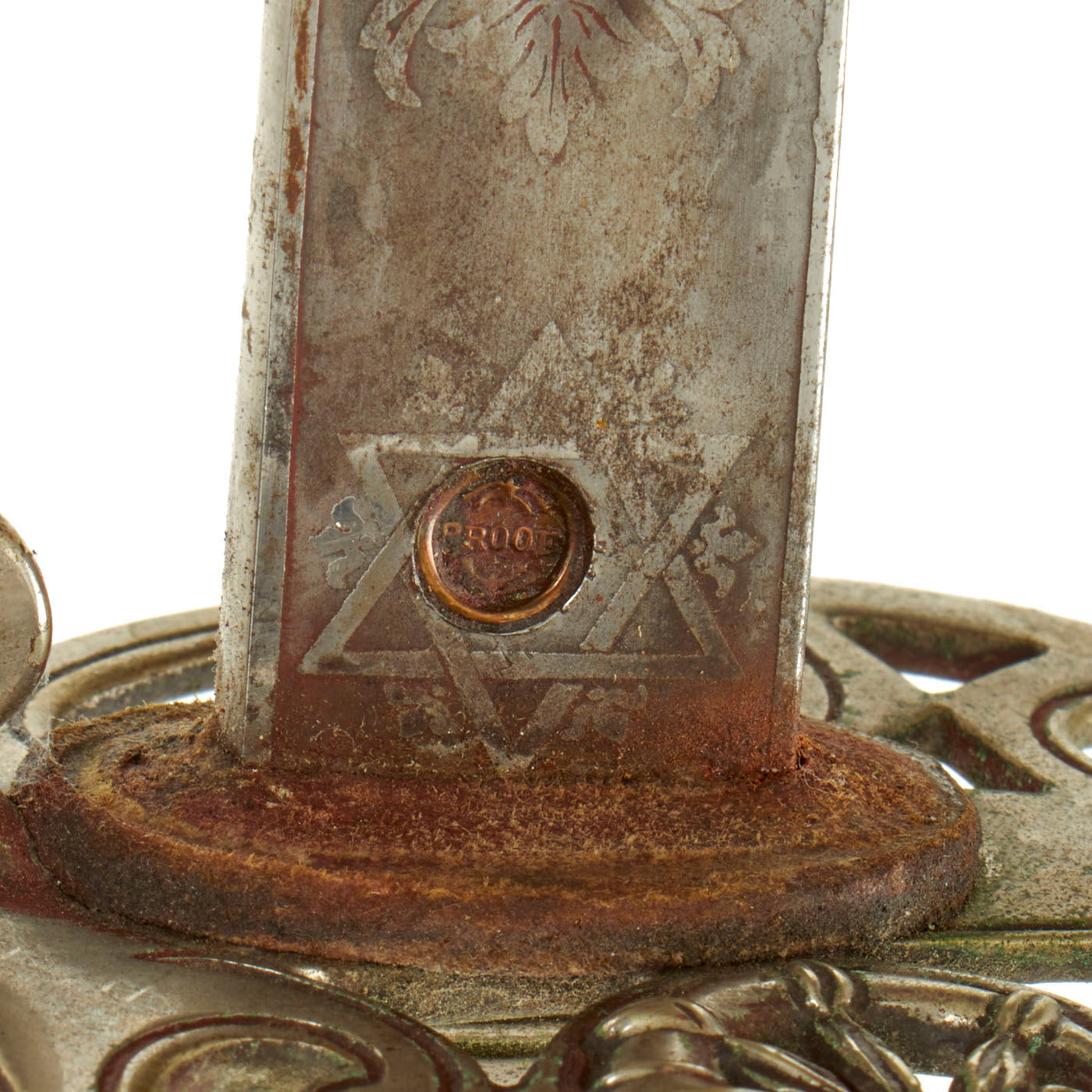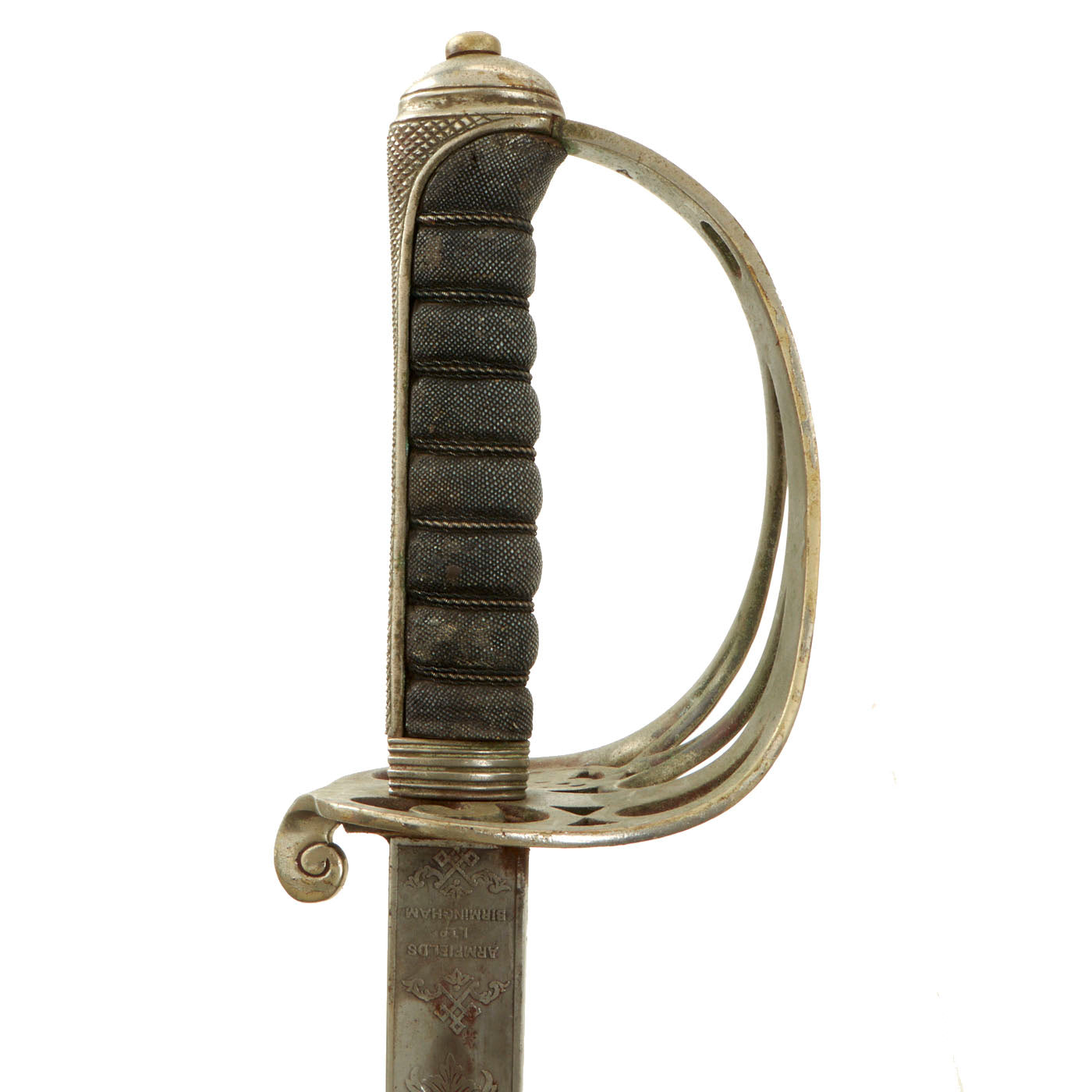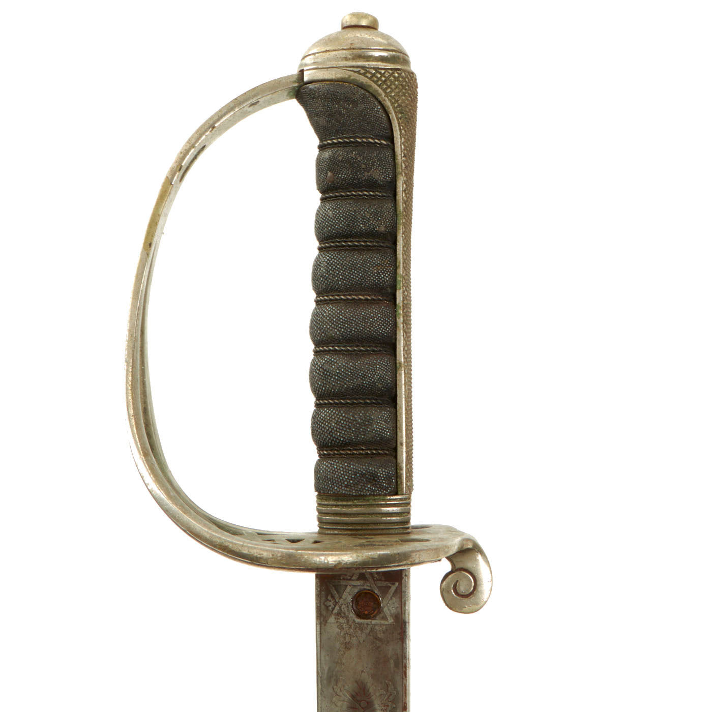 Shark skin grip is complete and shows light wear. The basket retains a fair amount of patina in some spots. The blade etching and embossing shows wear from cleaning. There is very little pitting or severe wear to the blade, though there is no play in the blade at the grip.