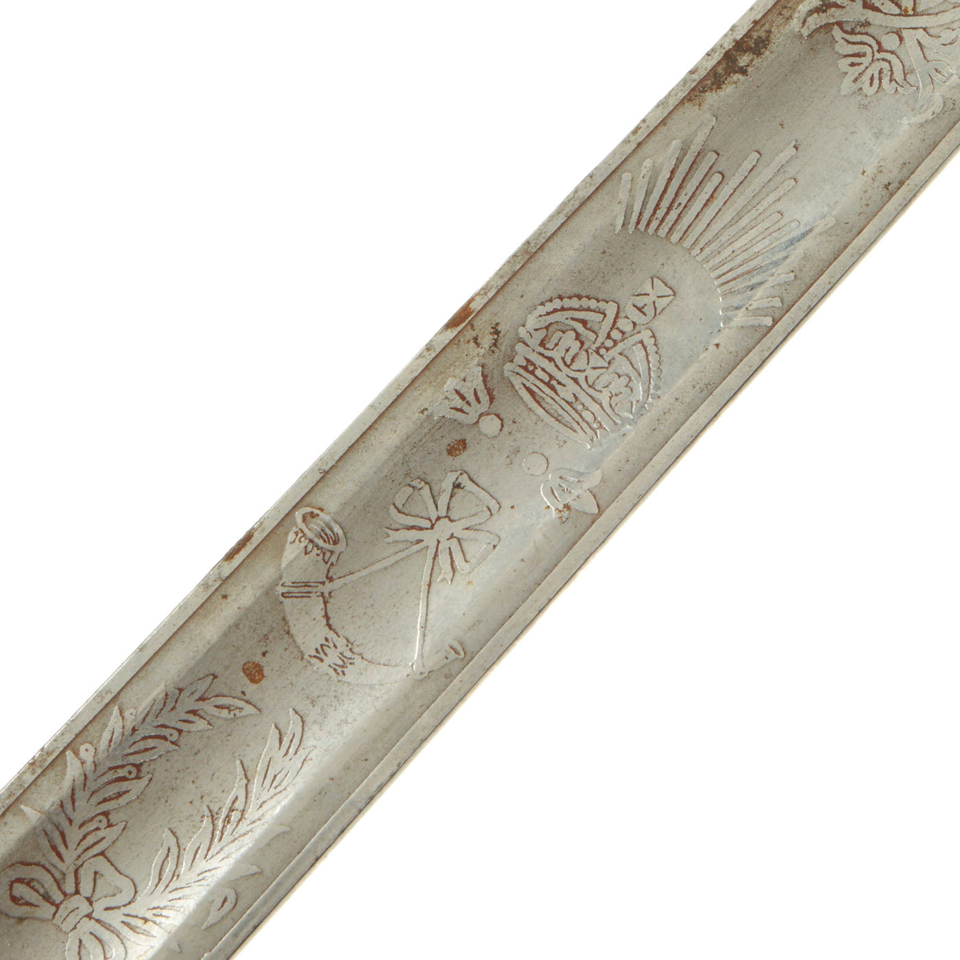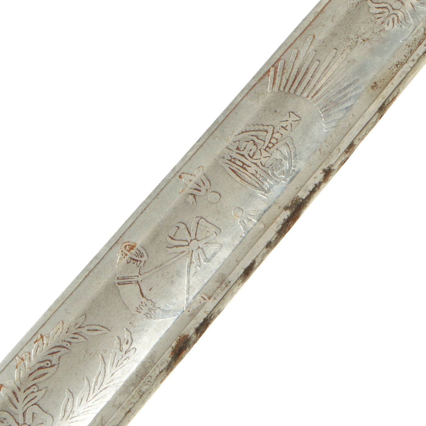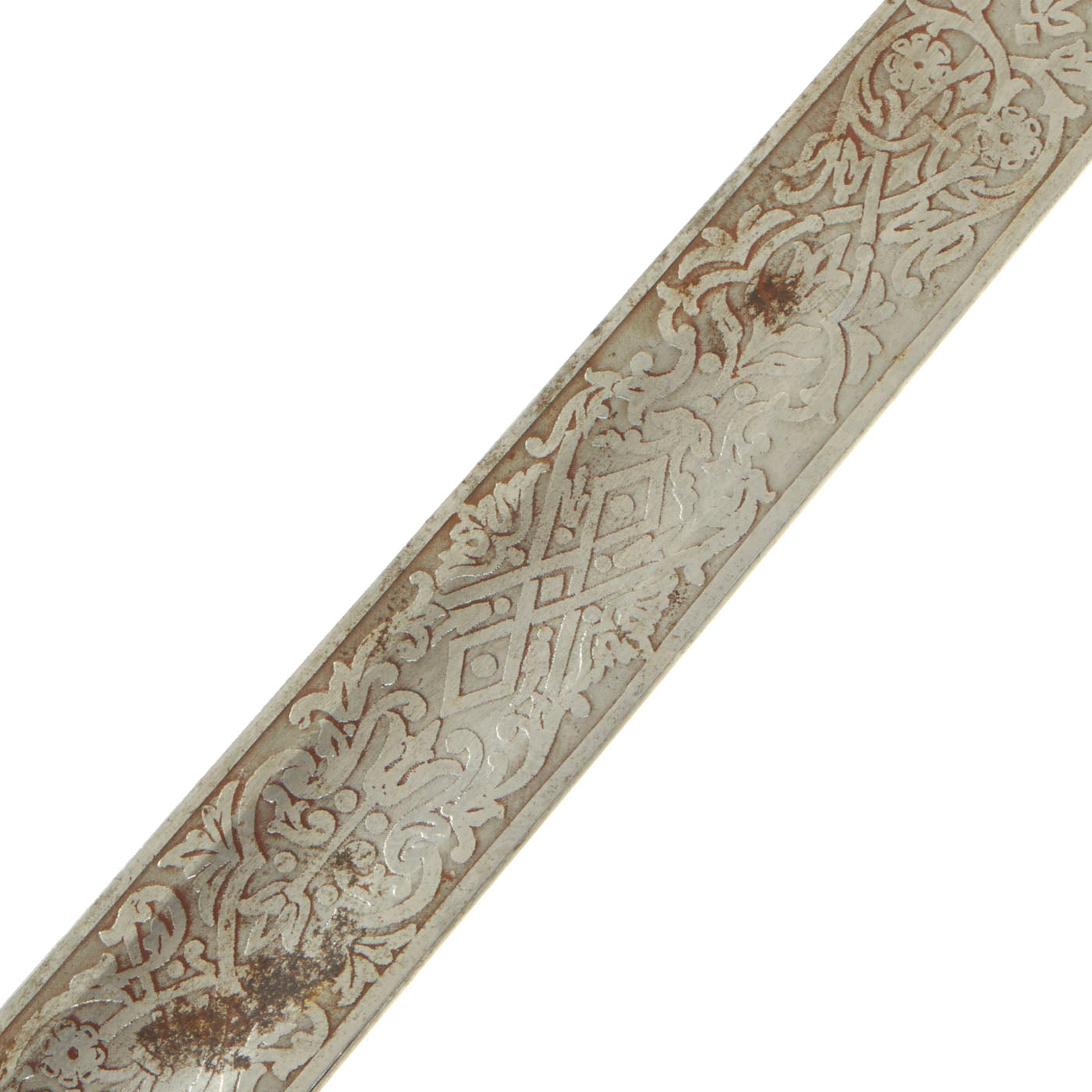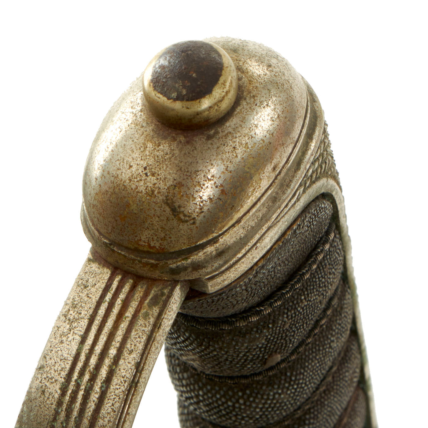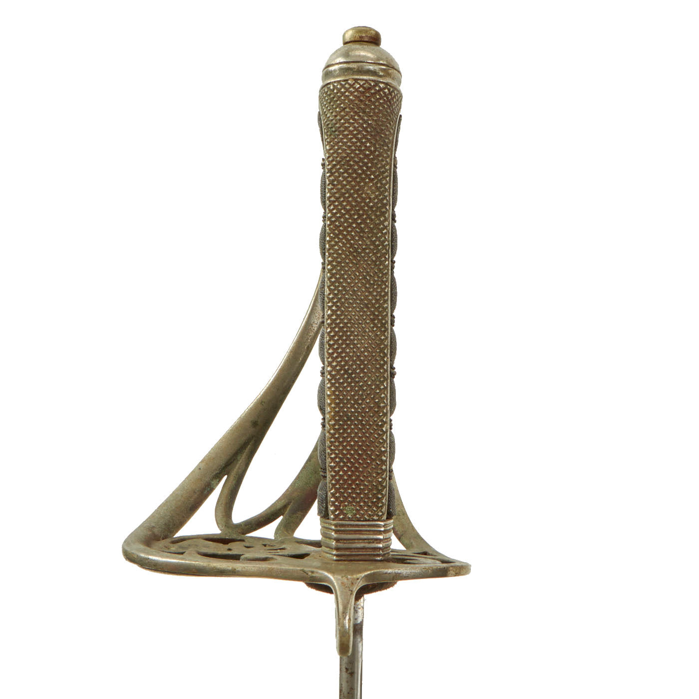 Shark skin grip is complete and shows light wear. The basket retains a fair amount of patina in some spots. The blade etching and embossing shows wear from cleaning. There is very little pitting or severe wear to the blade, though there is no play in the blade at the grip.