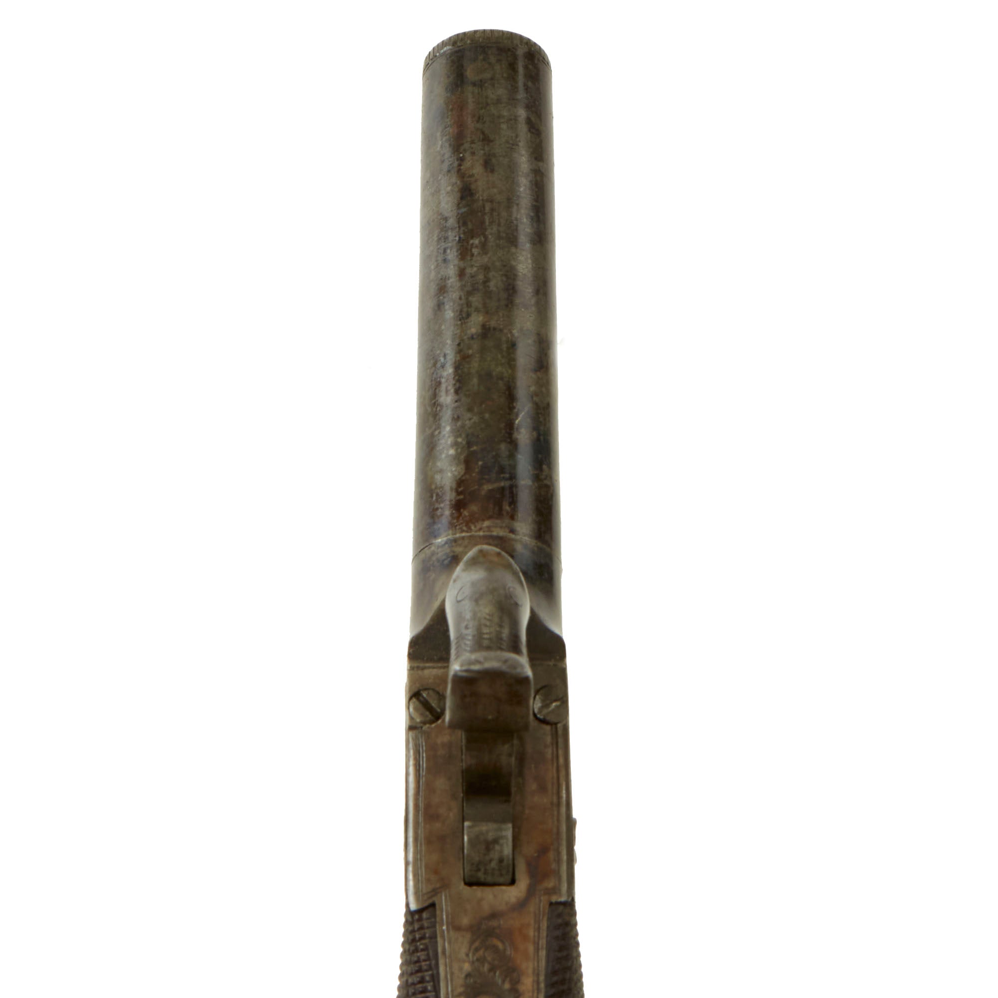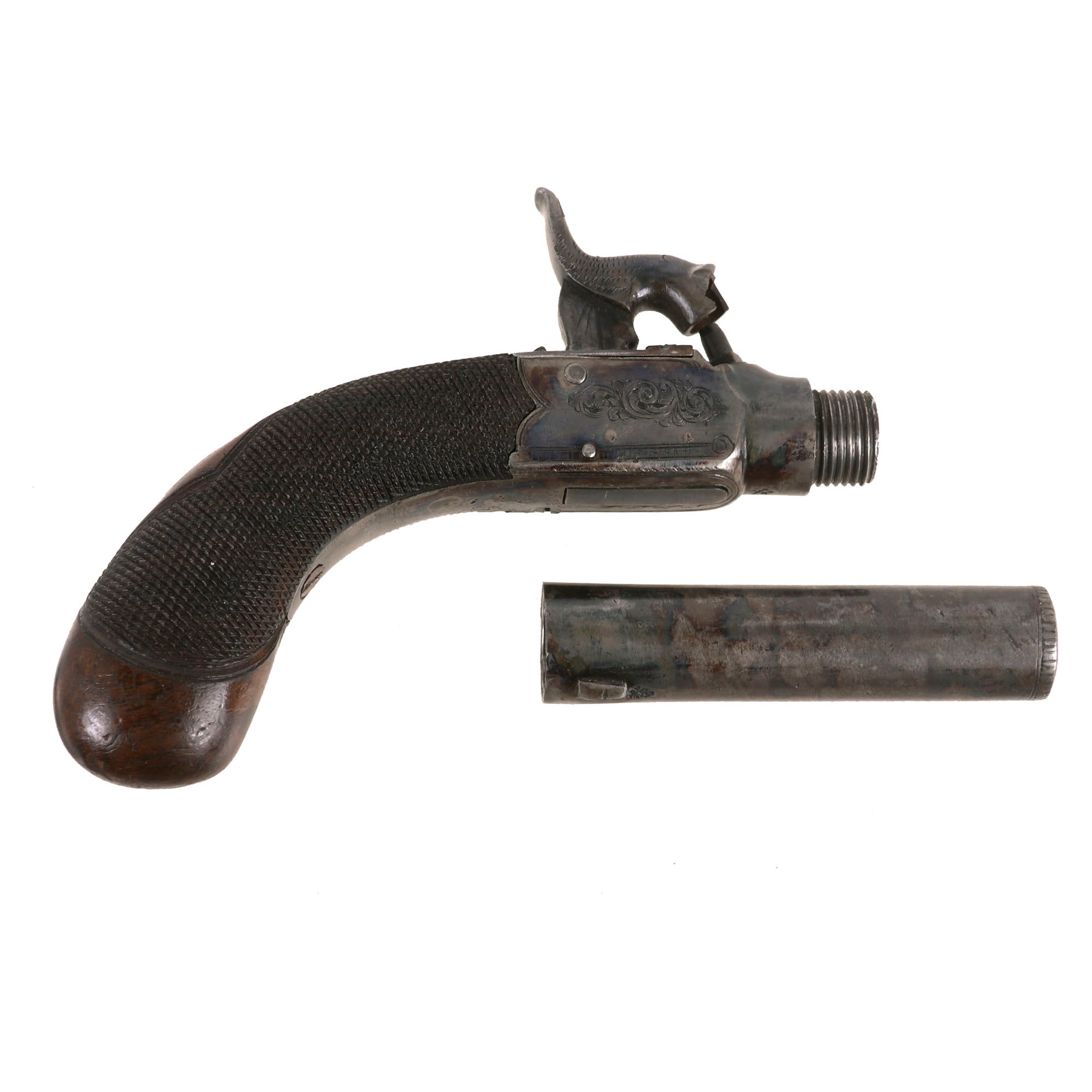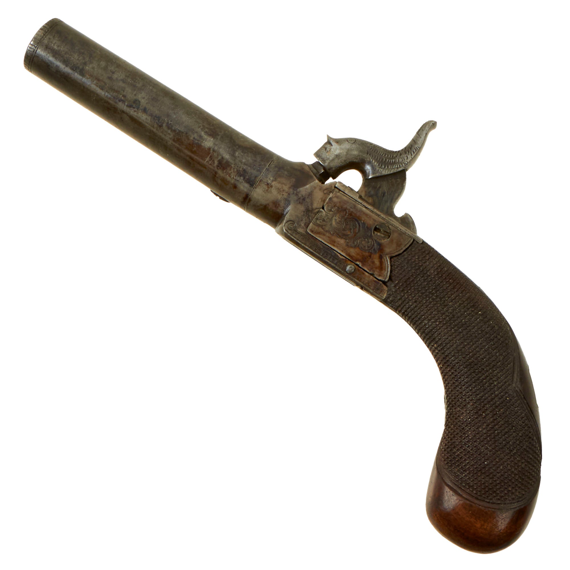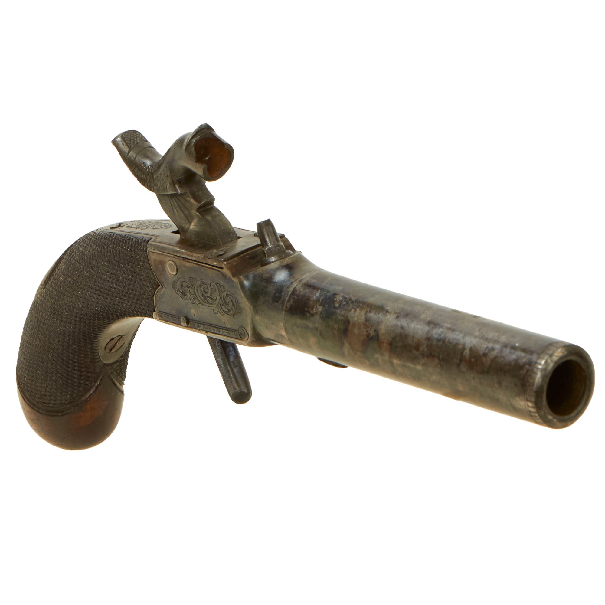 Original Item: Only One Available. This is a lovely Victorian Era British Vest Pocket Percussion pistol, completely unmarked on the "box lock" style frame, but definitely of very high quality, with lovely engraving on all sides of the frame. These were quite popular for self-protection, and were easily concealable in a vest pocket. Pistols like this were equally at home on dark Streets of New York or of London in Victorian England. We assume it was bespoke, or possibly made unmarked for a retailer.