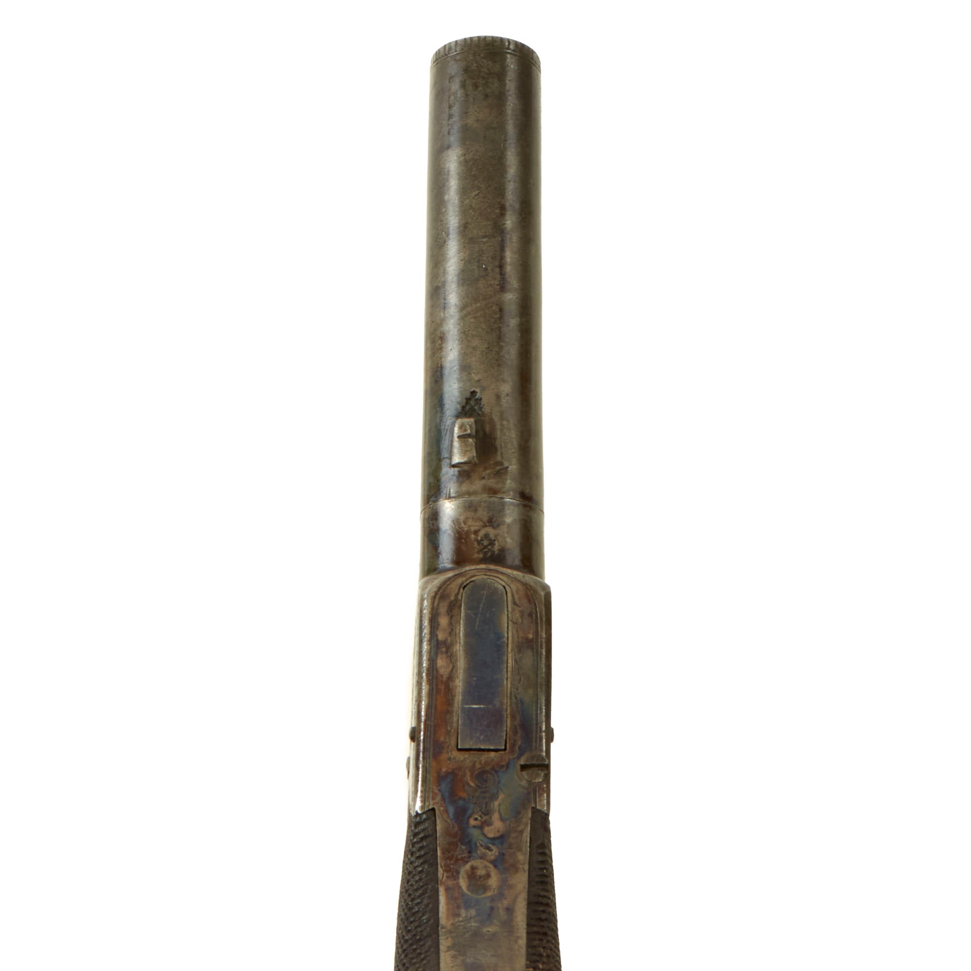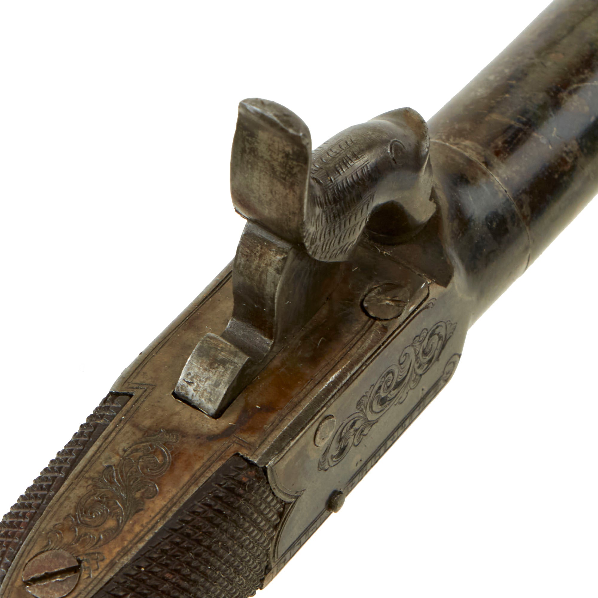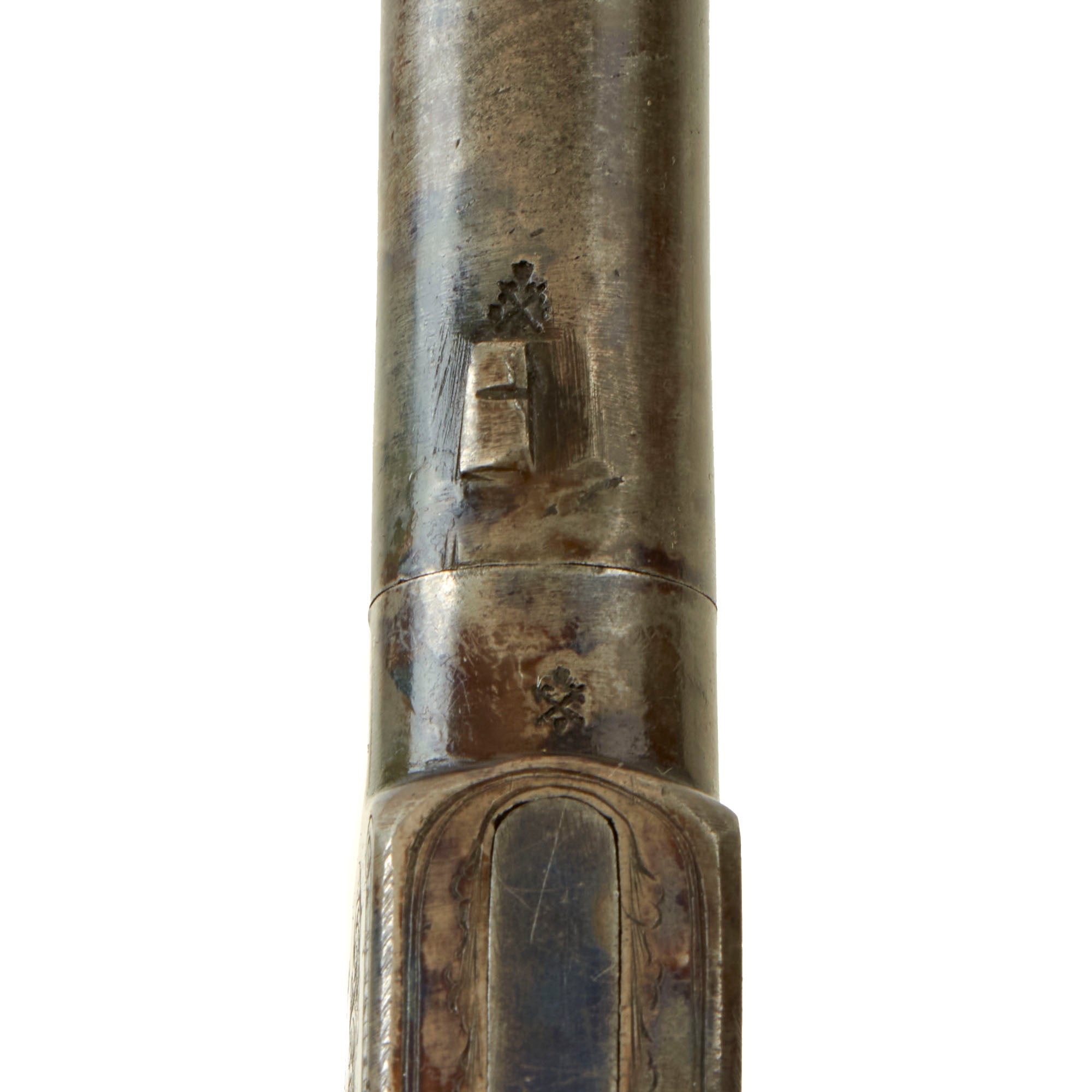 The pistol measures 7 1/2 inches in overall length, featuring a 3 inch "turn off" .45" caliber barrel, which made re-loading and cleaning the pistol a much easier process. Unlike most that we have seen, the screw joint is actually still free, and the barrel can easily be removed! The underside of the barrel is marked with the CROWN / CROSSED SCEPTERS / BPC "black powder proof" marking from from the city of Birmingham, England. The bottom of the frame is also marked with the CROWN / CROSSED SCEPTERS / V "viewed" mark. These are the style of markings in use until 1855.