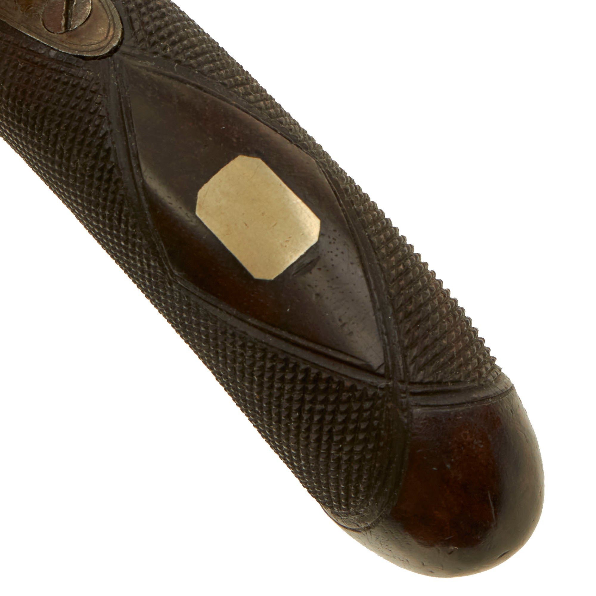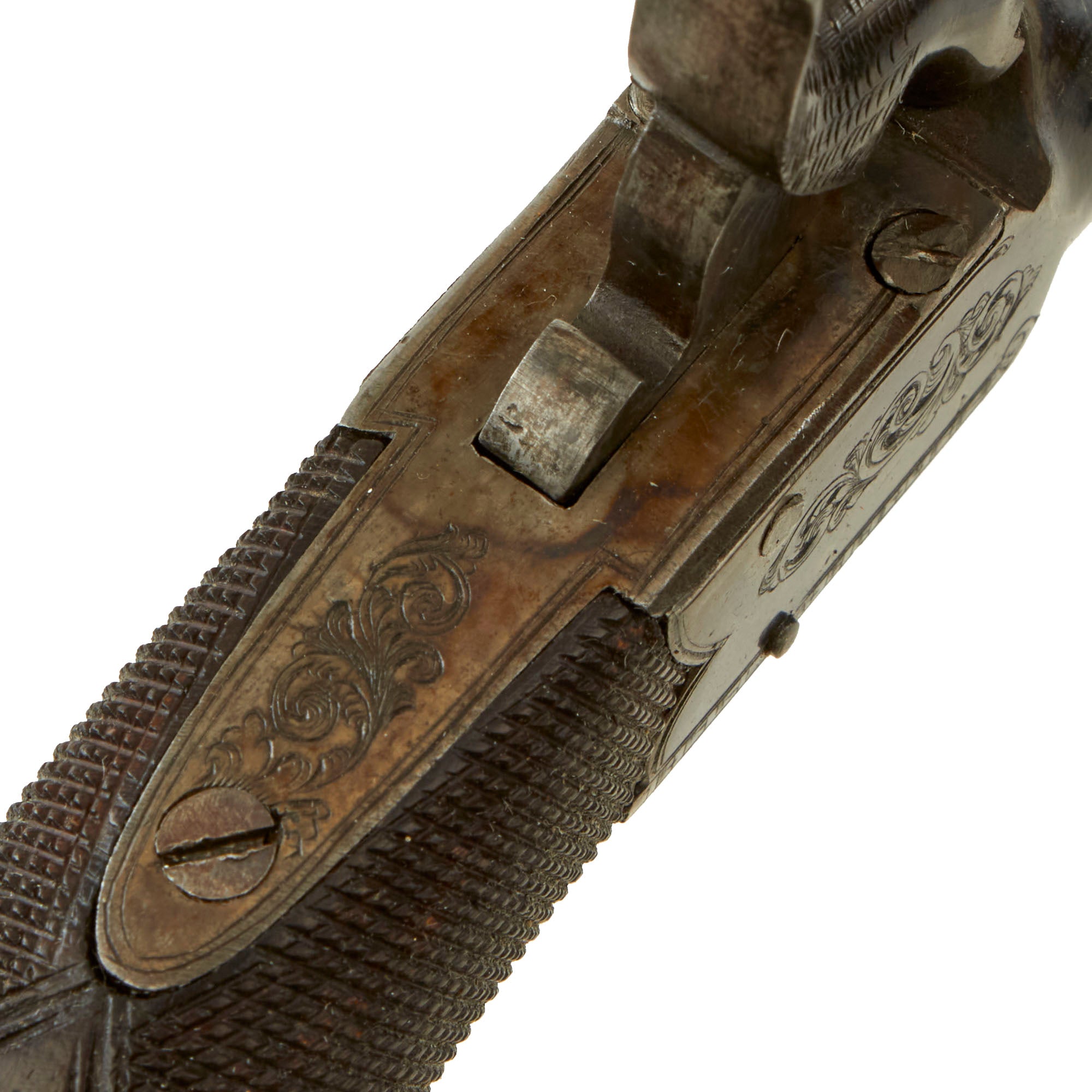 The pistol follows the classic style, and is fitted with a very nice checkered "bag" shaped curved grip, which is in great shape. There is a rectangular shaped escutcheon on the back of the grip, and the checkering is very well retained. The metalwork of the pistol sill shows a good amount of the original "case hardened" finish, with no evidence of major oxidation or damage.
