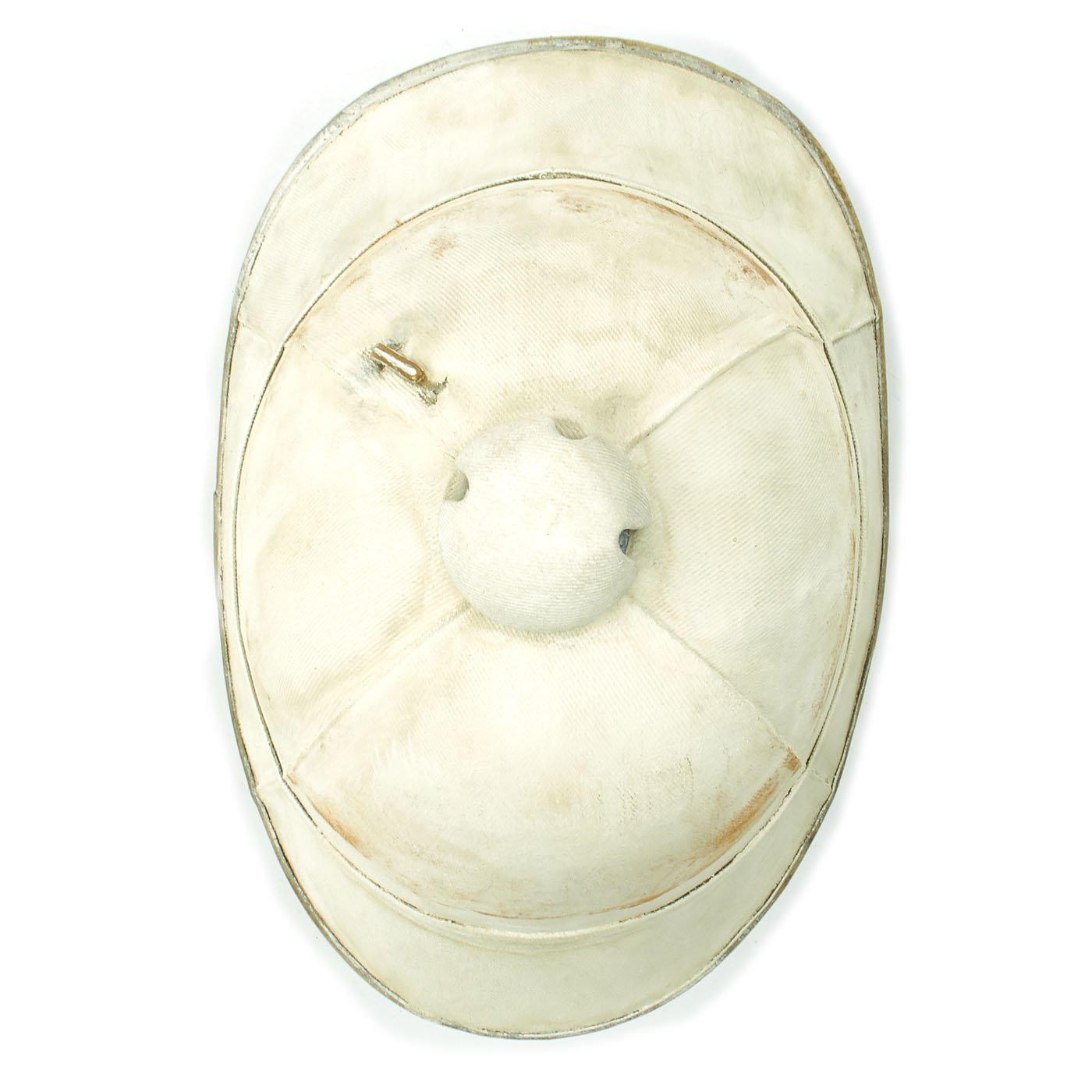 The word “khaki” is Persian for “dust.” While serving in India, it was common for officers to attempt to break up the white color of helmets, as well as other white garments with the use of mud, tea, coffee, tobacco juice and curry powder. The results varied greatly, and by 1884 a patented dyestuff produced a fast “khaki” dye. It wasn’t until the second Afghan War in 1885 that a full khaki uniform replaced the red uniforms and white helmets. But because the helmet was often a private purchase item, many continued to be produced in white. Many officers purchased a white helmet and relied on a khaki cover, rather than having to purchase both a white and a khaki helmet. For this reason, it isn’t uncommon to find Foreign Service Helmets from much later than 1885 that are white in appearance.