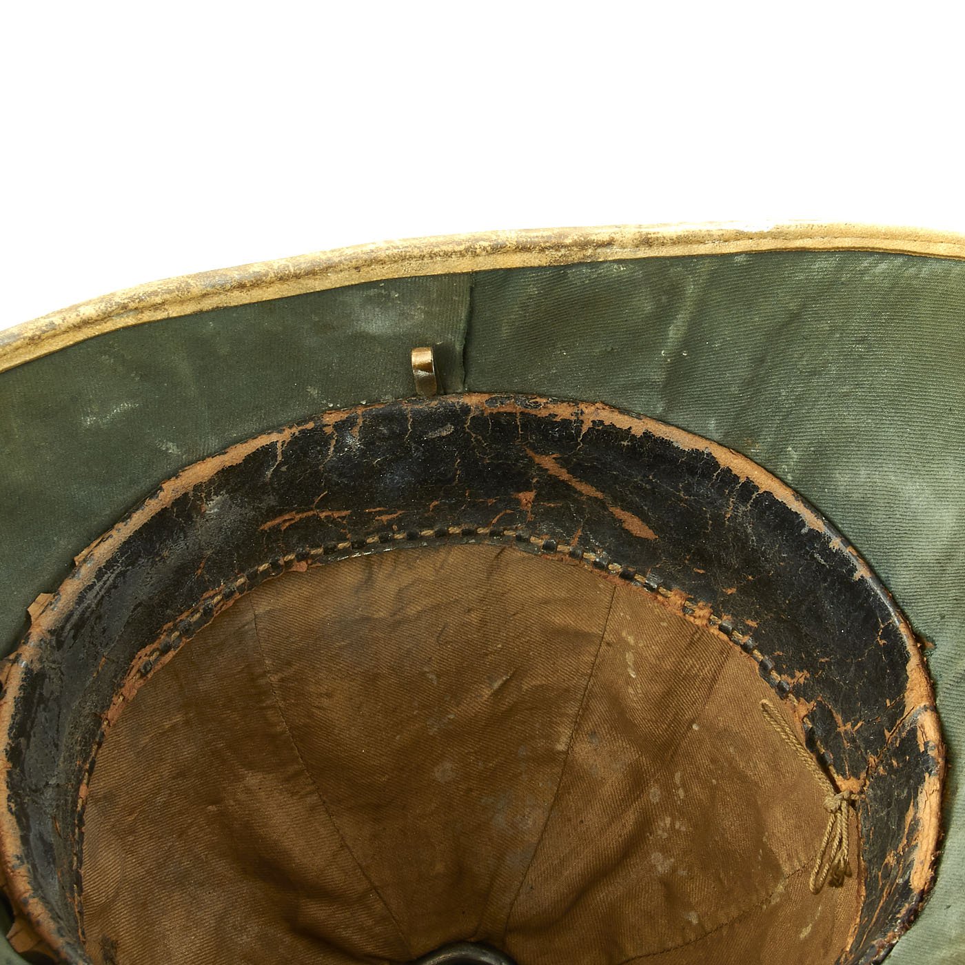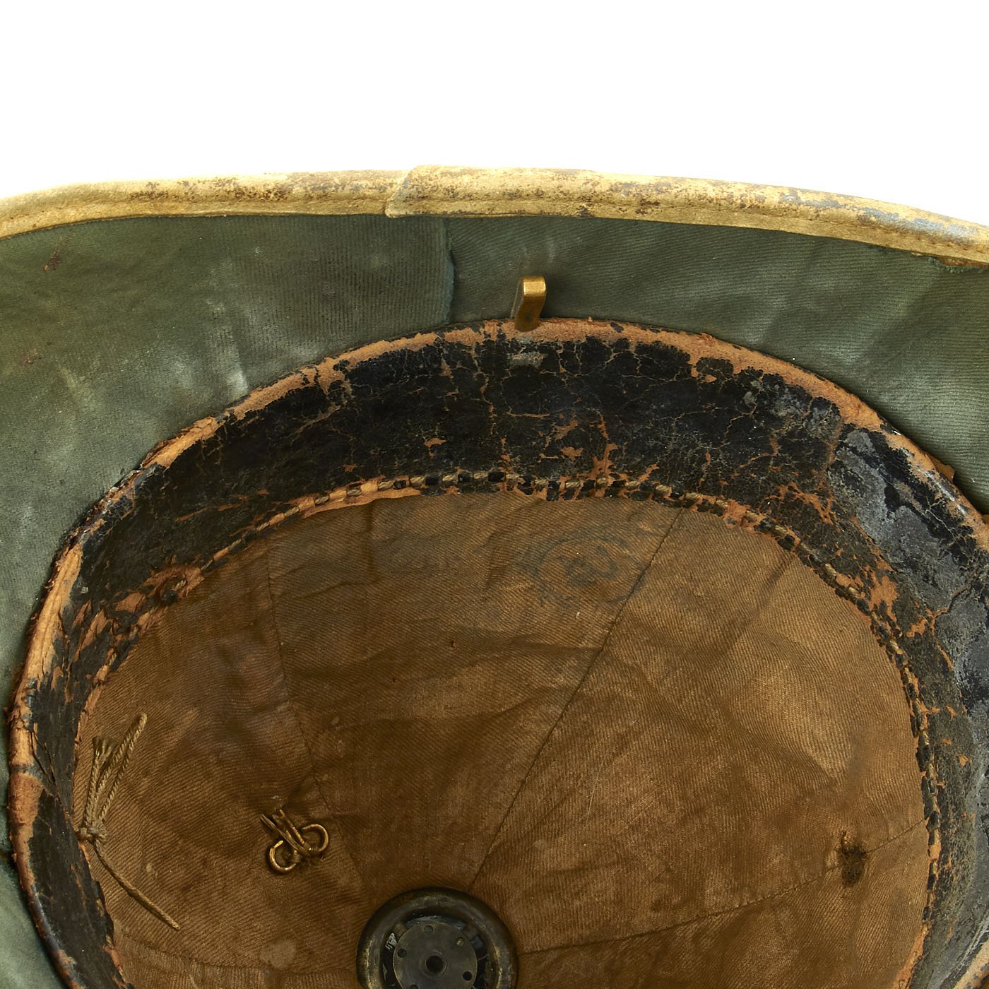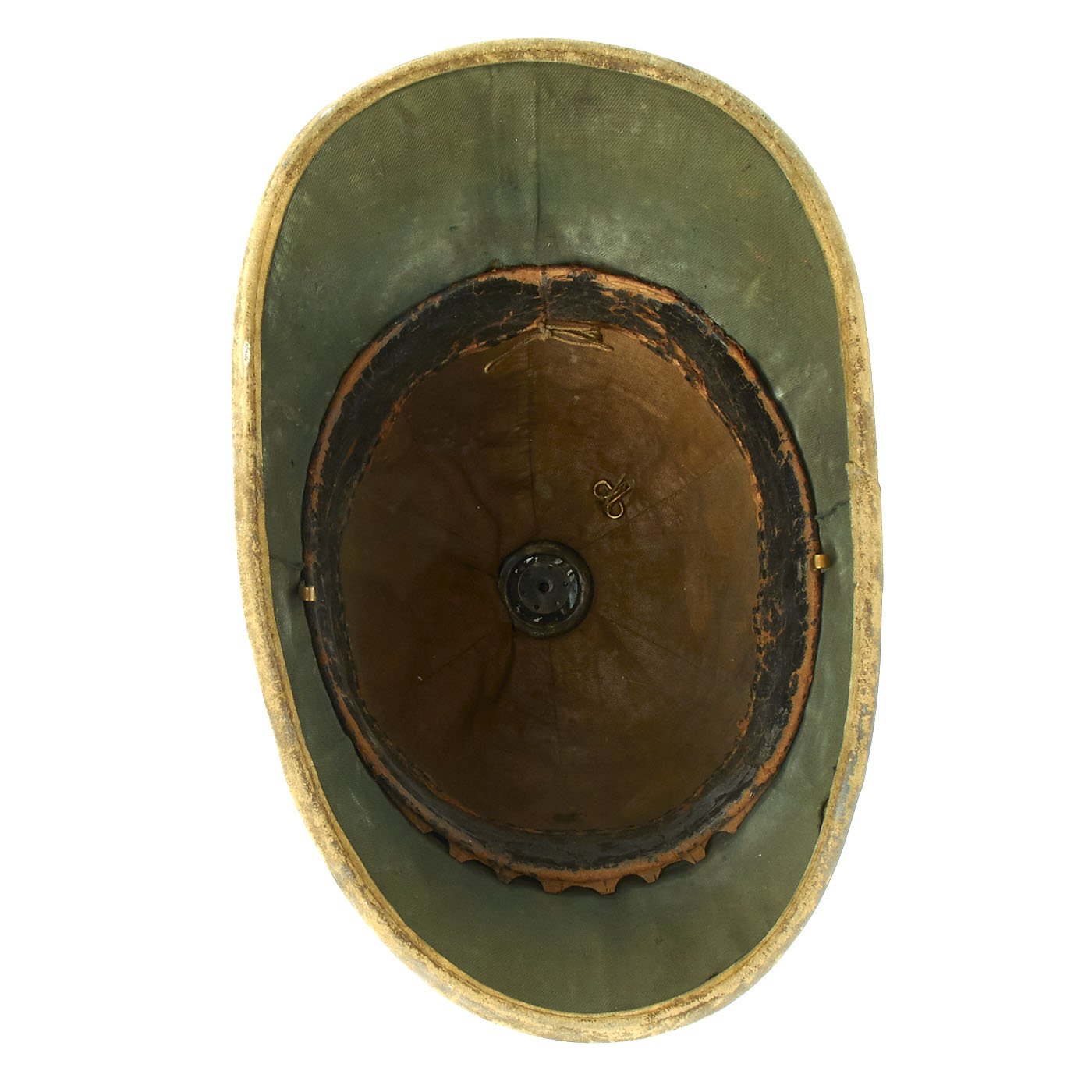 This example offered in very good condition would have been issued standard infantry. It does not have a puggaree, just a strap to cover the liner pins, and the interior has a simple sweatband liner. The helmet has been re-blanco'd since the last time it saw service, so it is still a quite vibrant white. There are chin strap hooks on the inside, as well as a hook behind the vent, but no chin strap or scales are present. Also, there definitely have been helmet plates used on this helmet, but it is currently without one, as the last owner probably kept it as a memento before selling the helmet.
