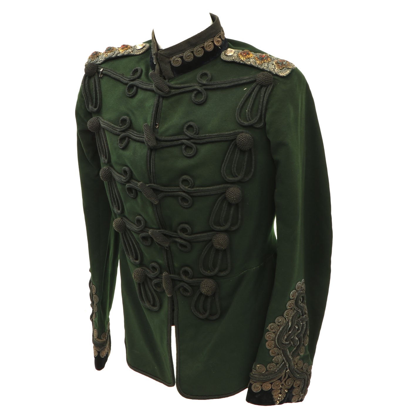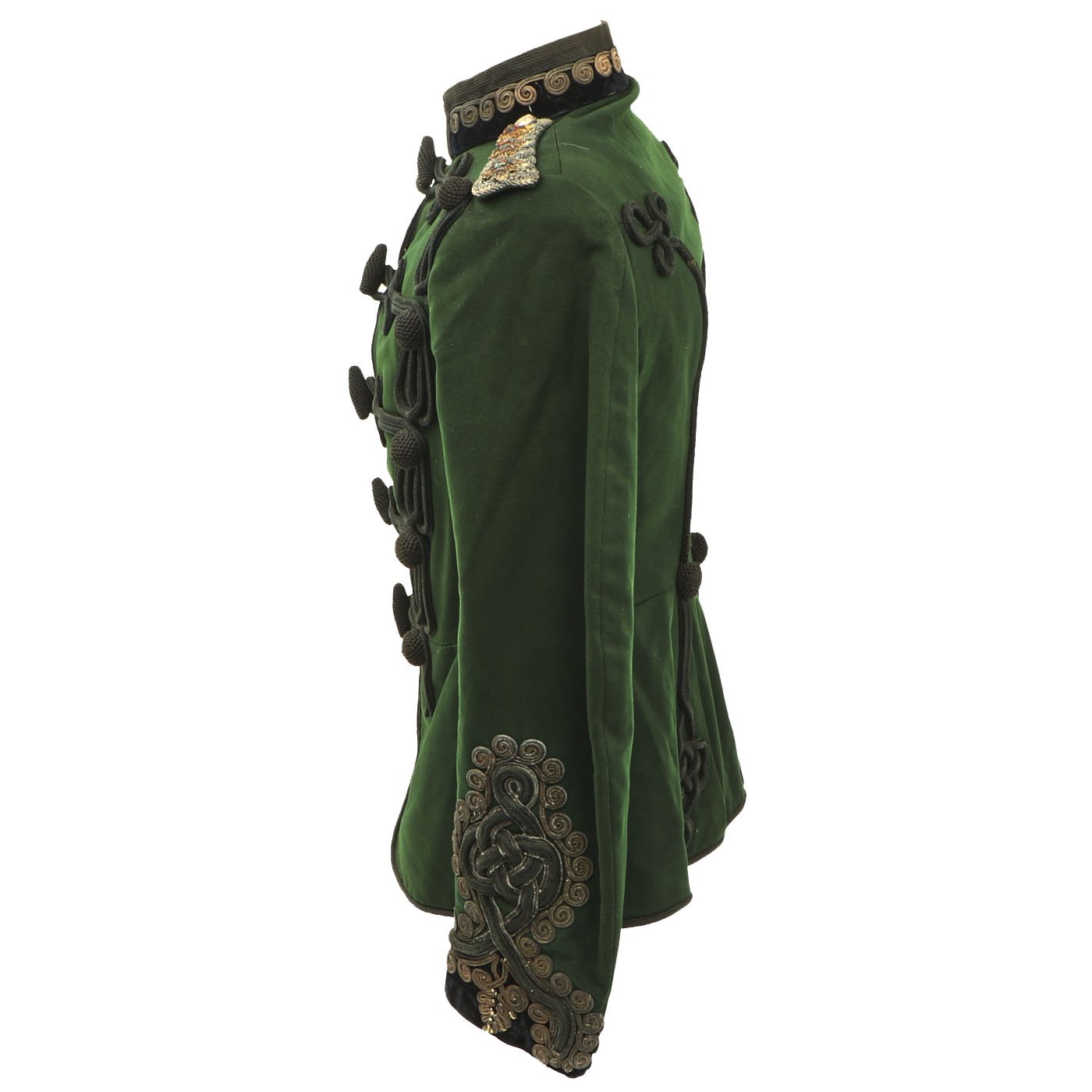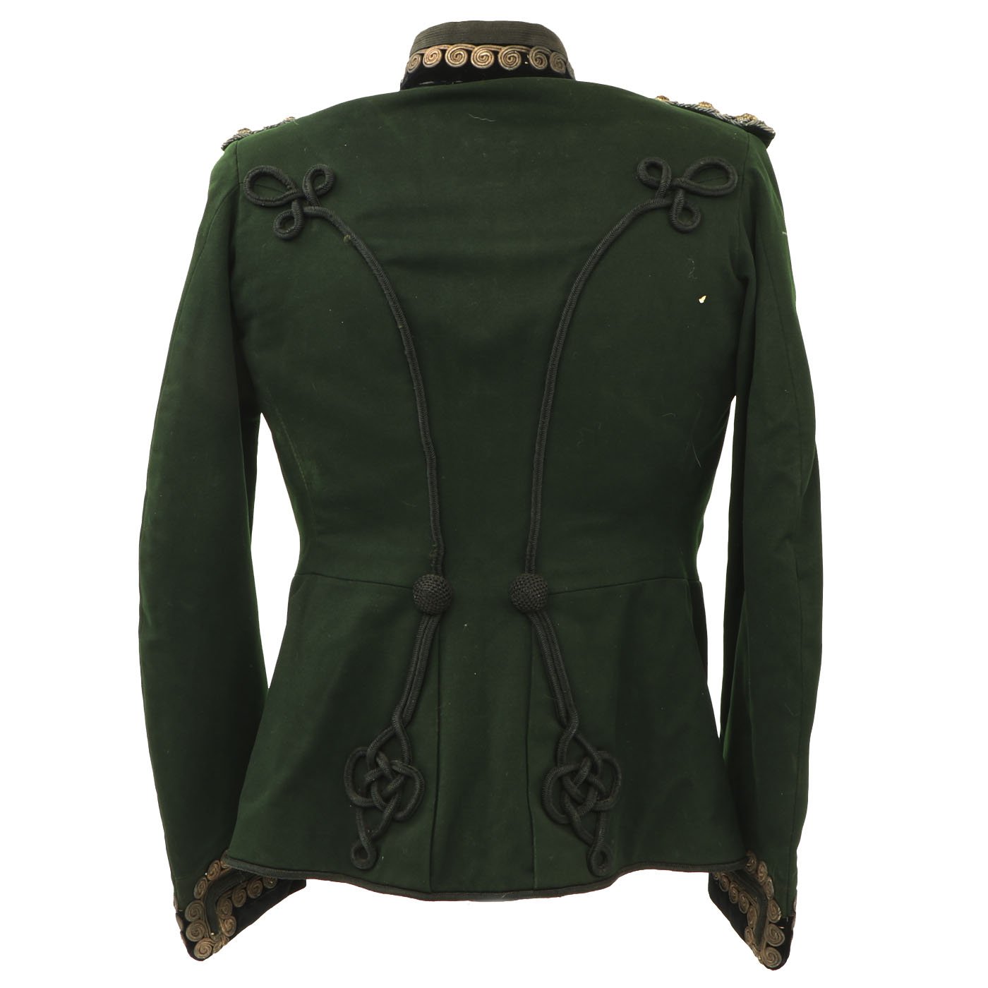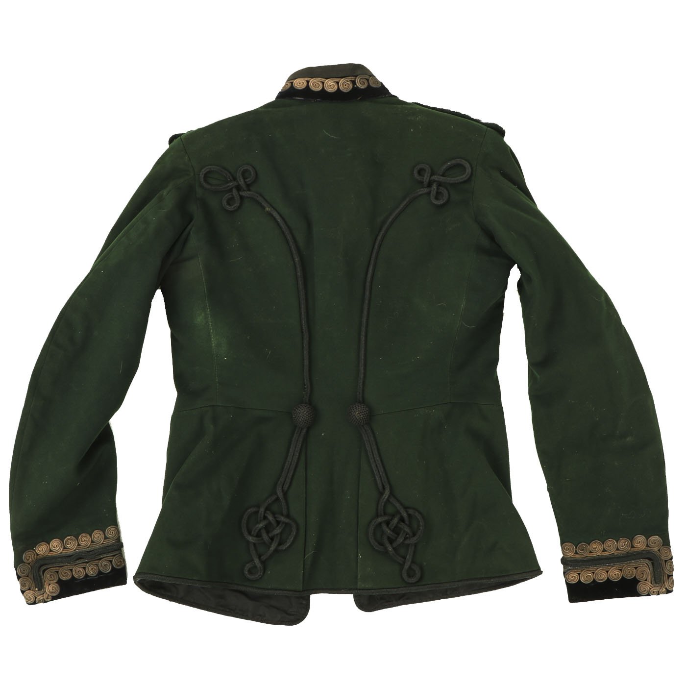 Original Item: Only One Available. This is a fantastic and rare Victorian Robin Hood Rifles Officer Atilla Dress Tunic. Inspired by the German and Austrian Attila, this garment has five pairs of loops of black frogging across the front. The shell is dark green wool, with braid around the back felt collar and cuffs. The epaulets have three pips for the rank of Captain and a RHR Evocatus Paratus (Robin Hood Rifles) silver button.