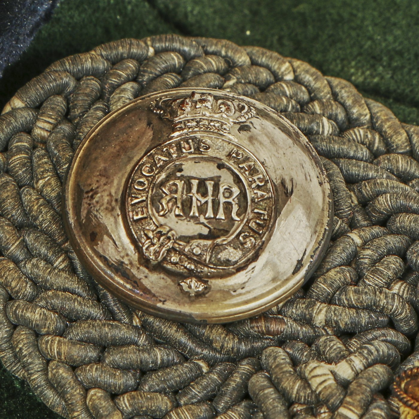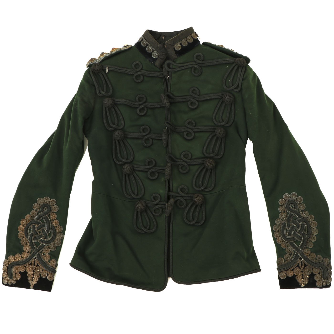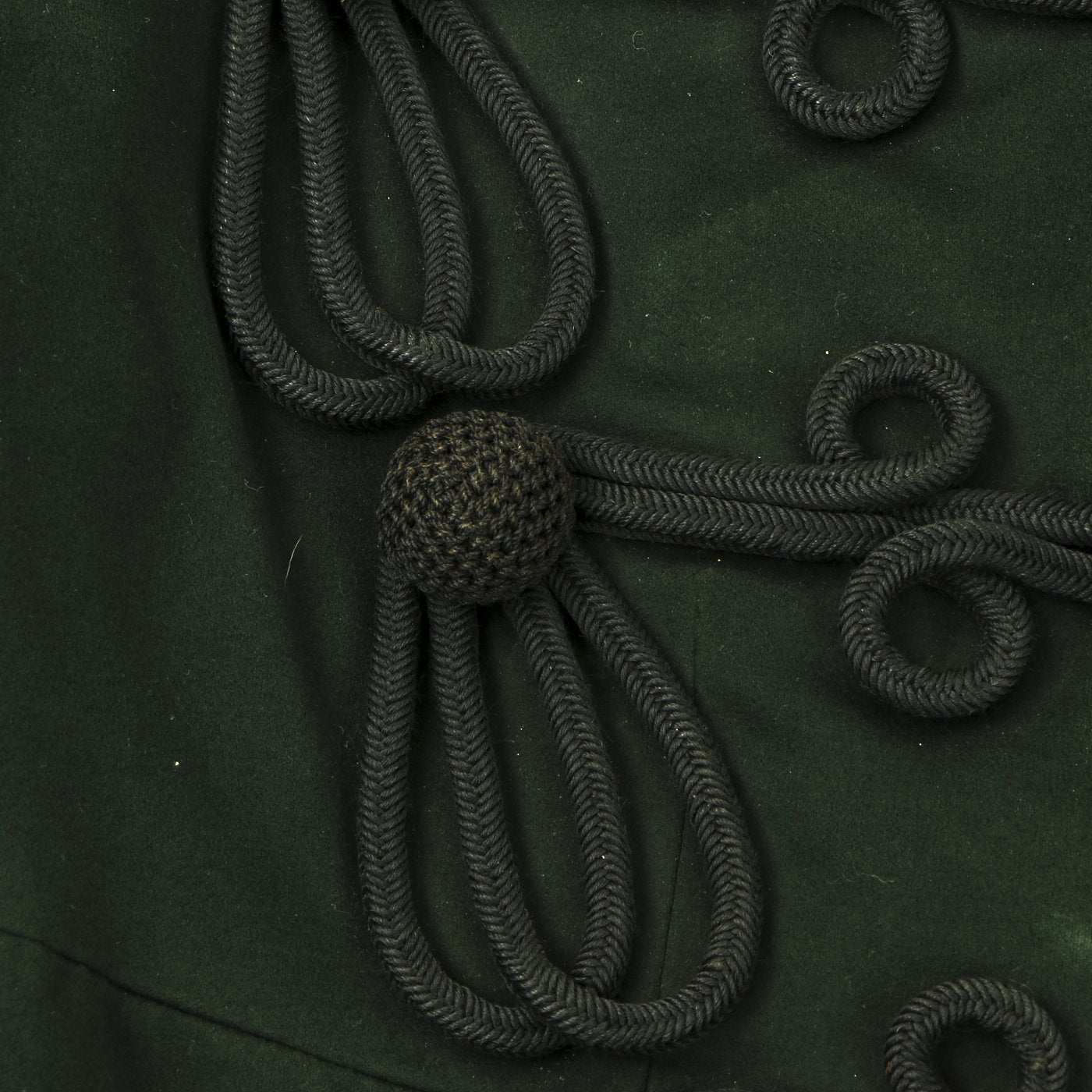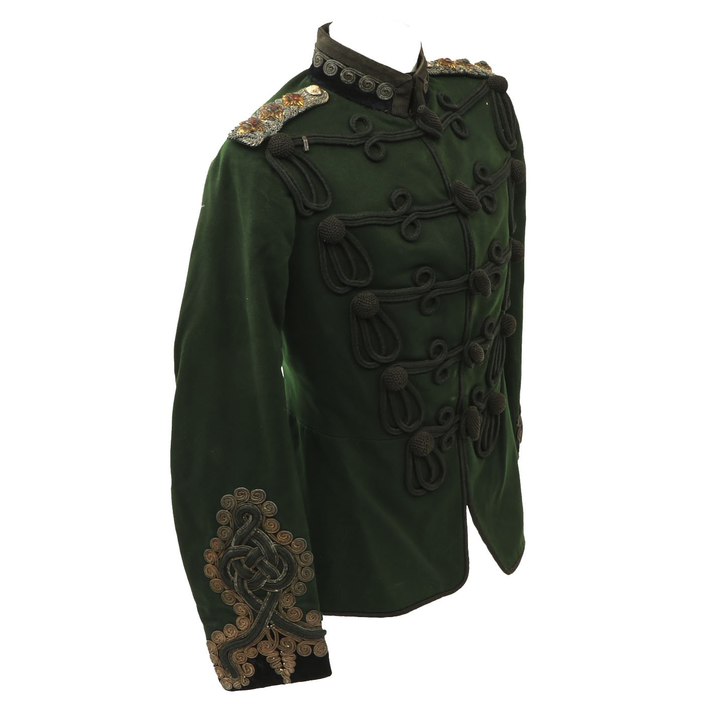 Original Item: Only One Available. This is a fantastic and rare Victorian Robin Hood Rifles Officer Atilla Dress Tunic. Inspired by the German and Austrian Attila, this garment has five pairs of loops of black frogging across the front. The shell is dark green wool, with braid around the back felt collar and cuffs. The epaulets have three pips for the rank of Captain and a RHR Evocatus Paratus (Robin Hood Rifles) silver button.