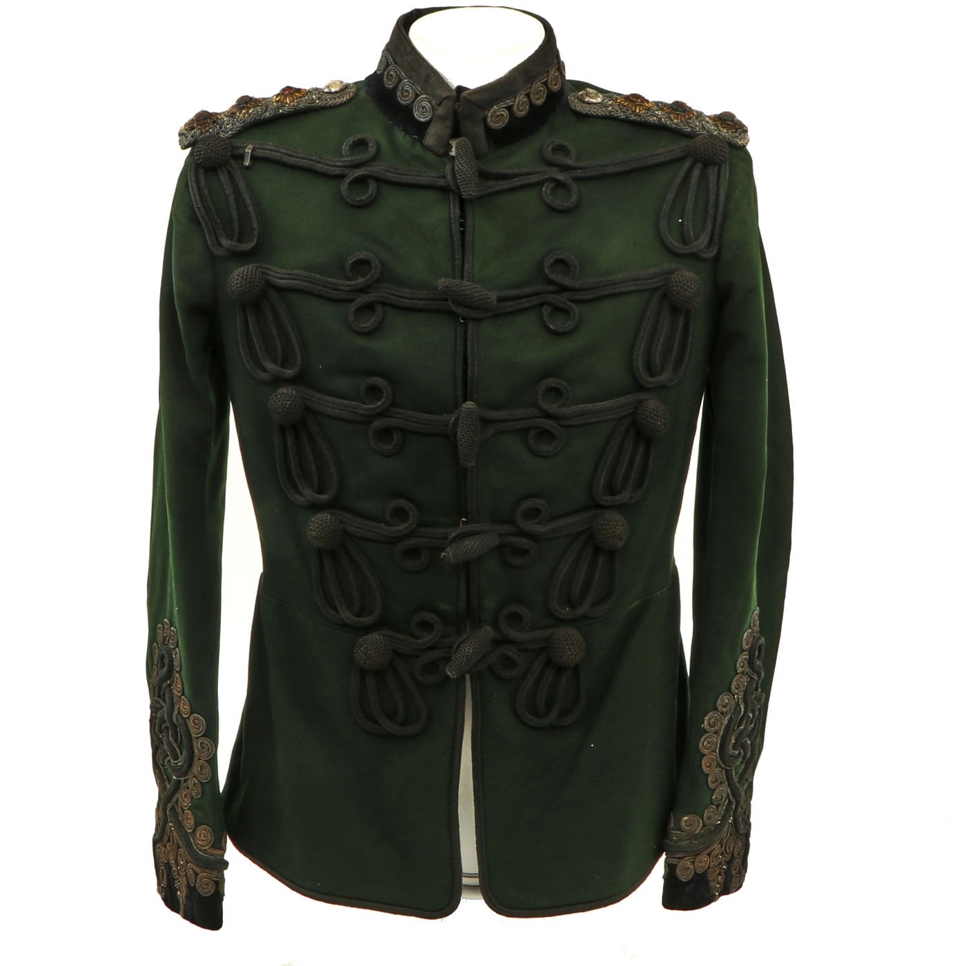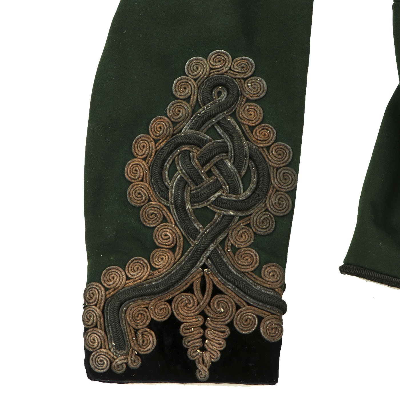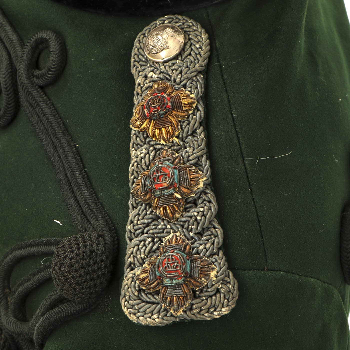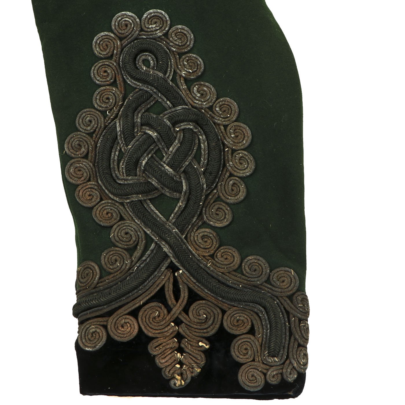 Original Item: Only One Available. This is a fantastic and rare Victorian Robin Hood Rifles Officer Atilla Dress Tunic. Inspired by the German and Austrian Attila, this garment has five pairs of loops of black frogging across the front. The shell is dark green wool, with braid around the back felt collar and cuffs. The epaulets have three pips for the rank of Captain and a RHR Evocatus Paratus (Robin Hood Rifles) silver button.