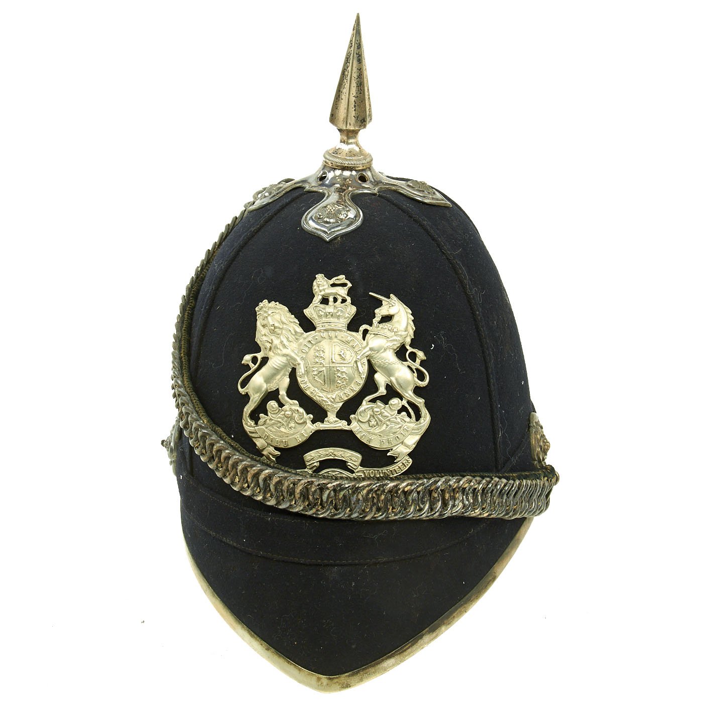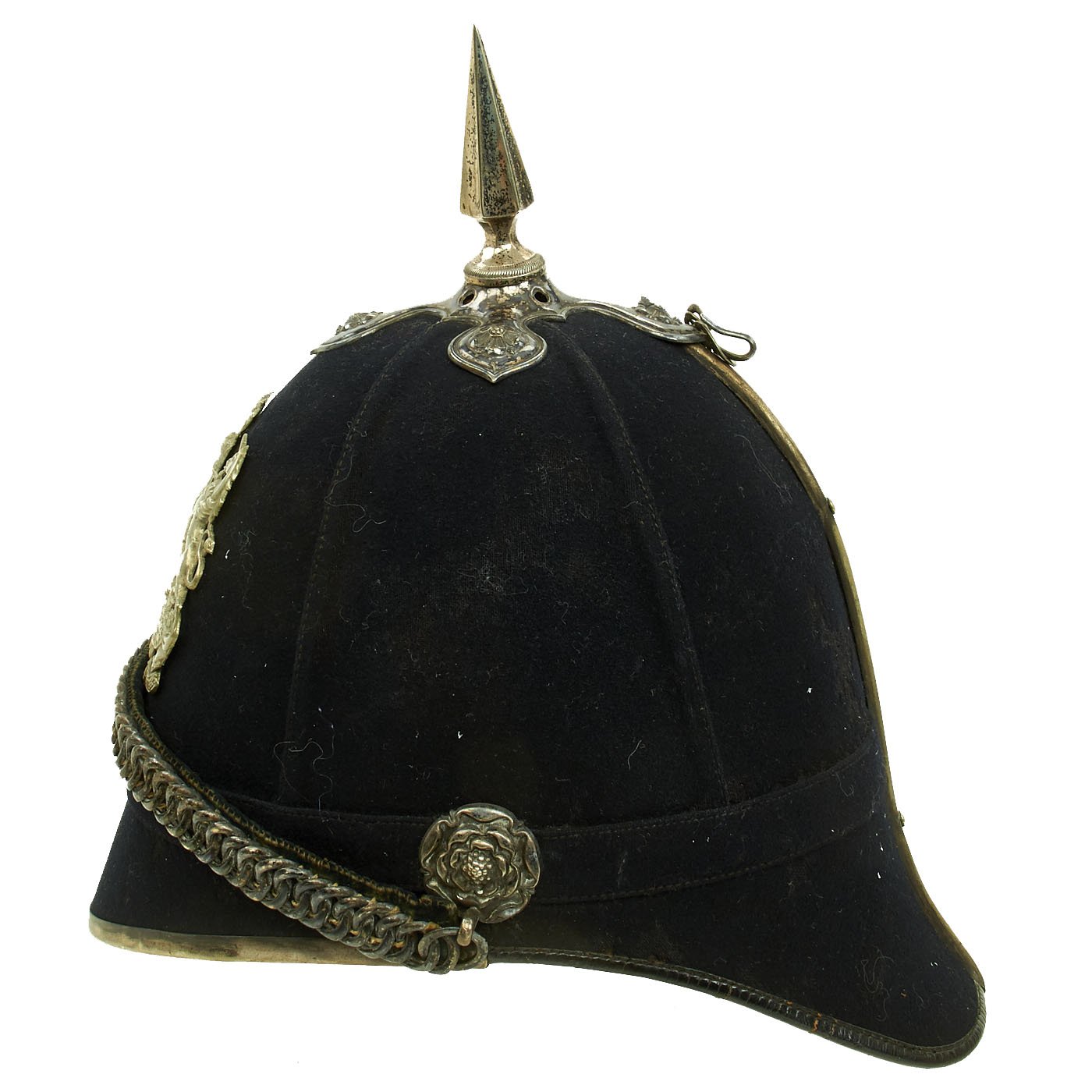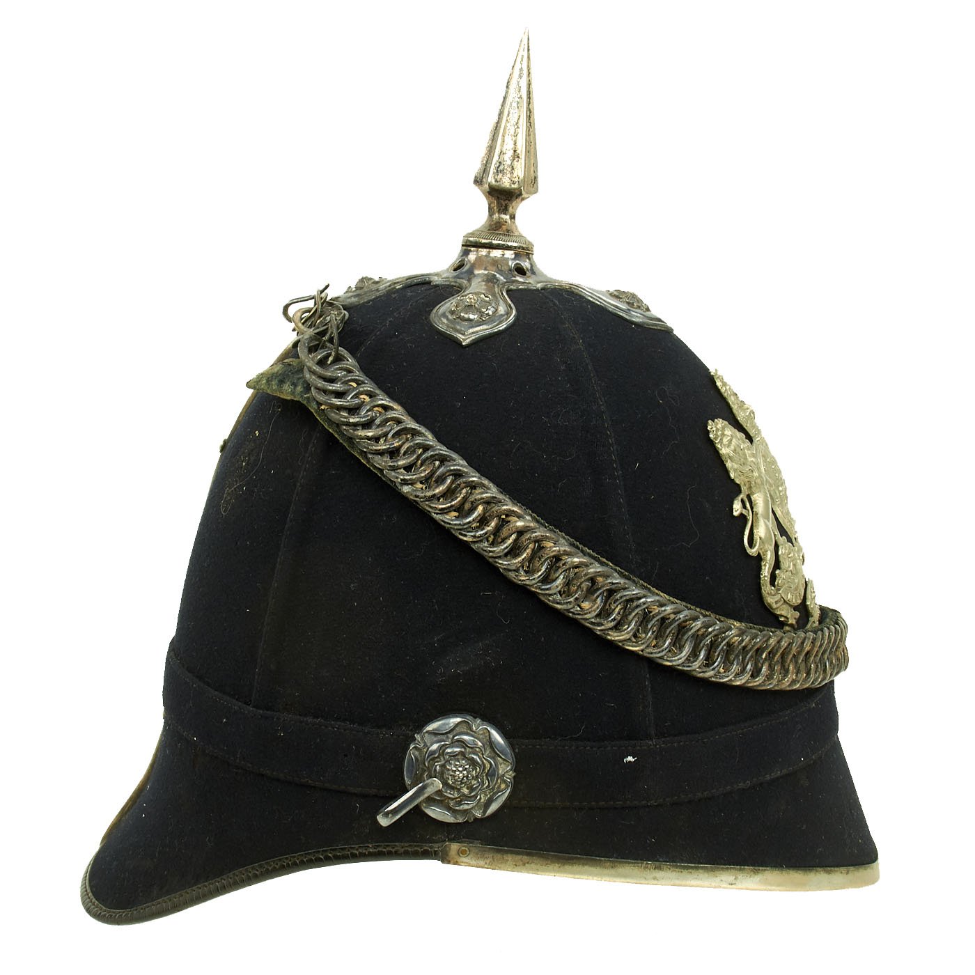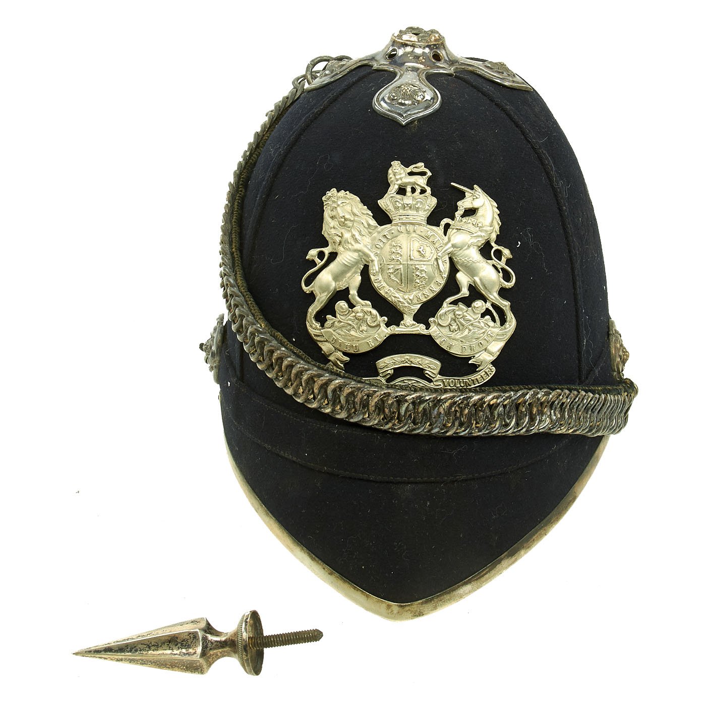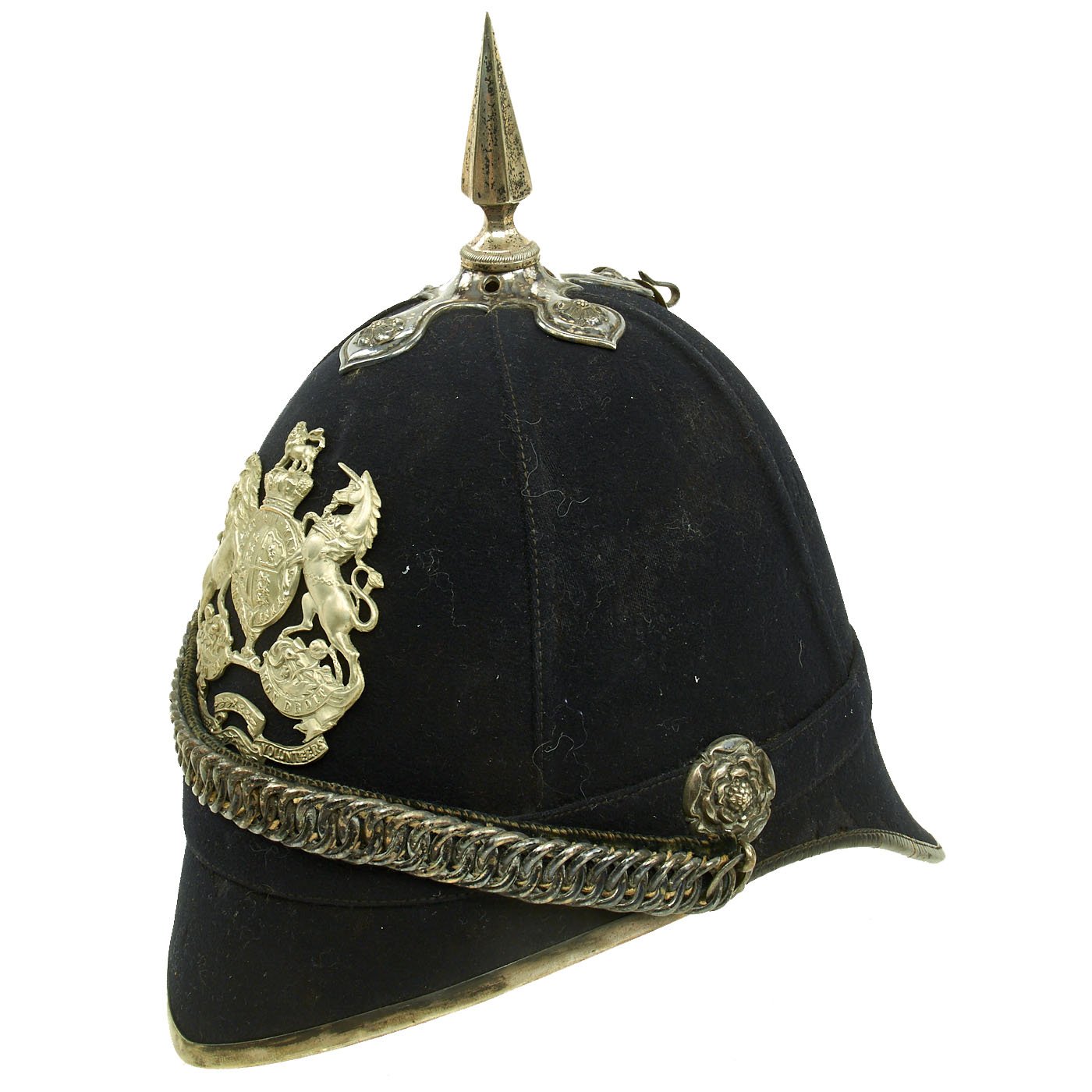 This is an excellent condition British Engineer Volunteer's spiked Blue Cloth helmet, and is typical of those in use during the late VICTORIAN era, the time of the British Empire. It comes complete with its original top fitting, removable spike, and metal "ring" chin strap, attached to the back of the spike base. The chin strap lugs and spike base ends are all properly adorned with embossed roses. This helmet has all white metal or silver plated mounts used on "Volunteer" helmets, as opposed to the gilt brass of regular forces.