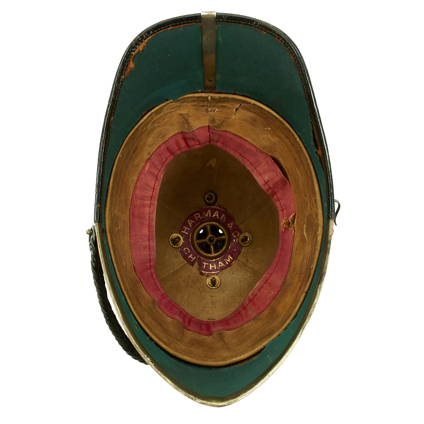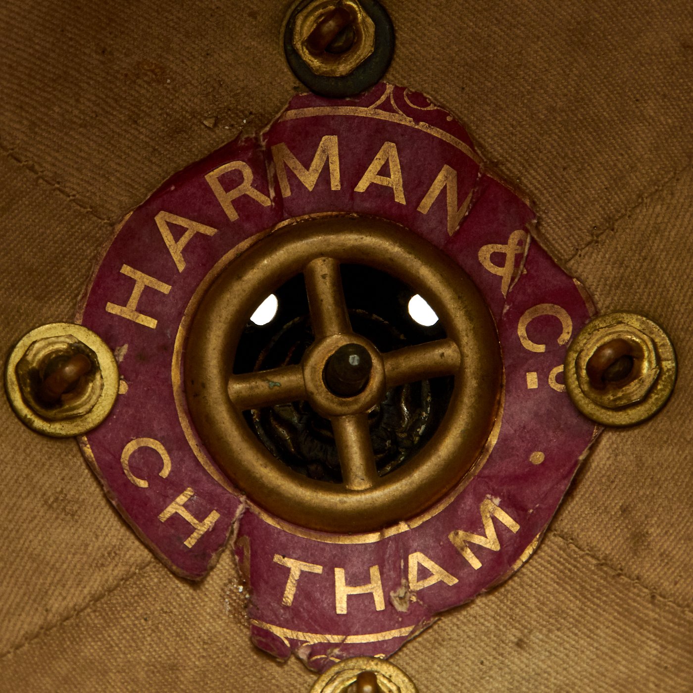 The interior of the helmet still has its correct leather and fabric liner, which does show some degradation from age and use. There is some tearing of the leather and fabric, as well as some seam pulling. The top vent of the helmet has a manufacture's label reading HARMAN & CO. / CHATHAM.