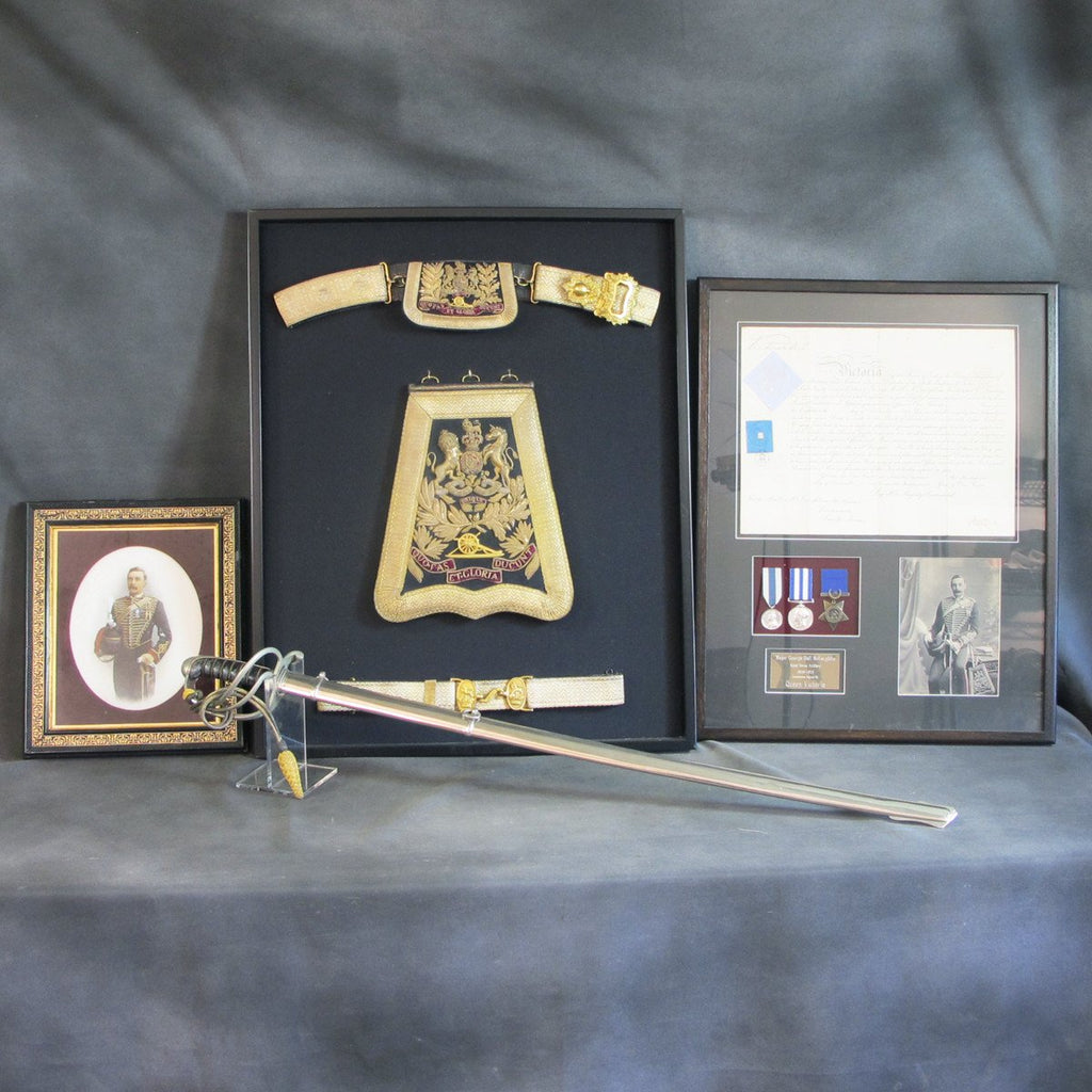 The first framed display includes the Vellum Officer's Commission dated 31st December 1878 and SIGNED by QUEEN VICTORIA appointing "GEORGE HALL McLAUGHLIN, GENTLEMAN" to be a "LIEUTENANT" in her Majesty's land forces. In fact, Lieutenant McLaughlin joined the prestigious Regiment, THE ROYAL HORSE ARTILLERY. He saw active service in the Egyptian Campaign in 1884 receiving the Campaign Medal and Kedive's Star, examples of which are framed together with the Commission and a large photographic portrait of the Officer in full uniform wearing the medals and other accouterments included in this archive.