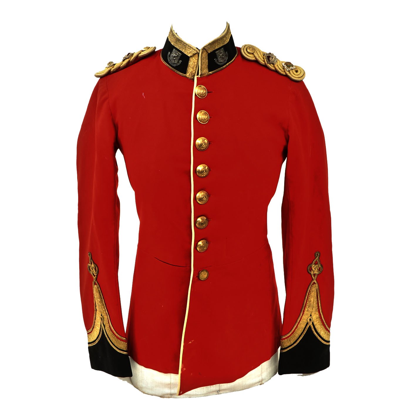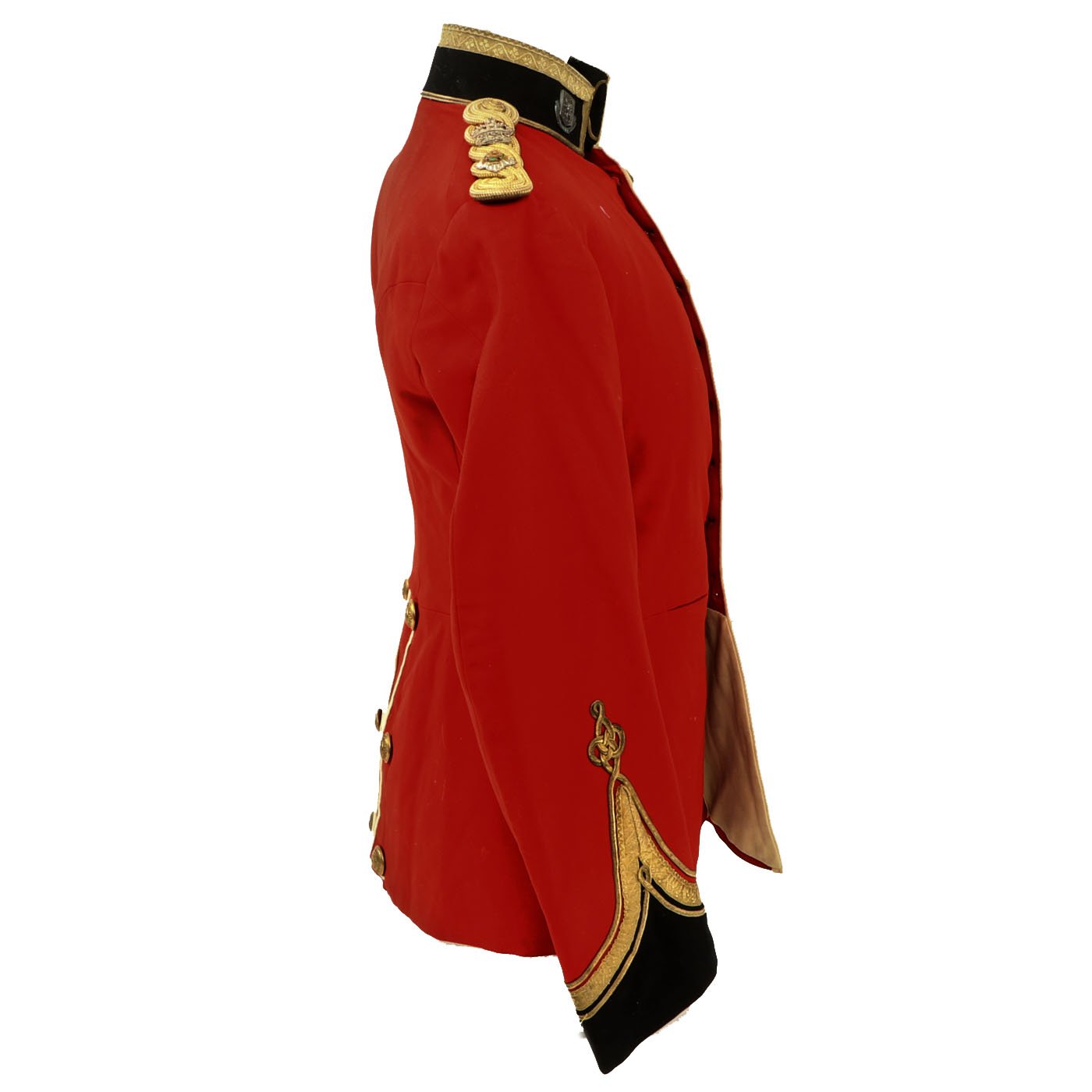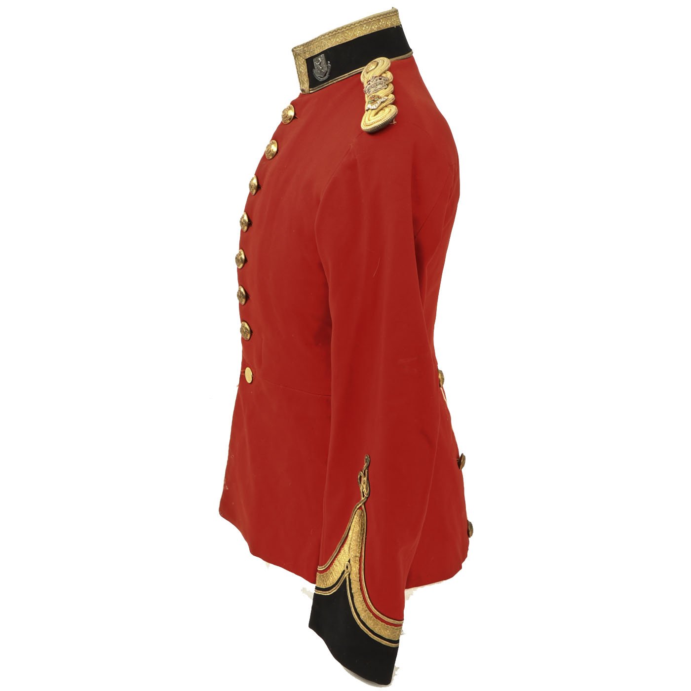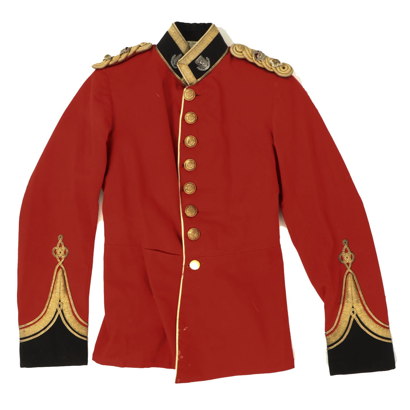 Original Item: Only One Available. Dating between 1881-1902 this fine tunic is in very good condition and features original gilt Royal Irish Regiment buttons with Queen's Crown dating this tunic between 1881 - 1902. Front of tunic has 8 buttons by JENNENS & Co. of LONDON , epaulets are gilt braided with one pips and a crown indicating rank of Lieutenant Colonel. The collar has two silvered Royal Irish Regiment Officer Pins with Latin Motto - "Virtutis Namurcensis Praemium” Translation- Reward for valor at Namur (Belgium). Inside lining shows wear and use but overall condition is very good. There is a \tailor's name tag stitched into the neck that reads: Capt. G. F. R. Forbes. Also included red striped blue trousers.