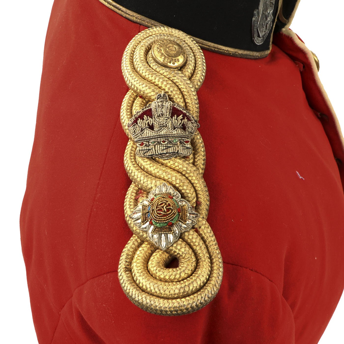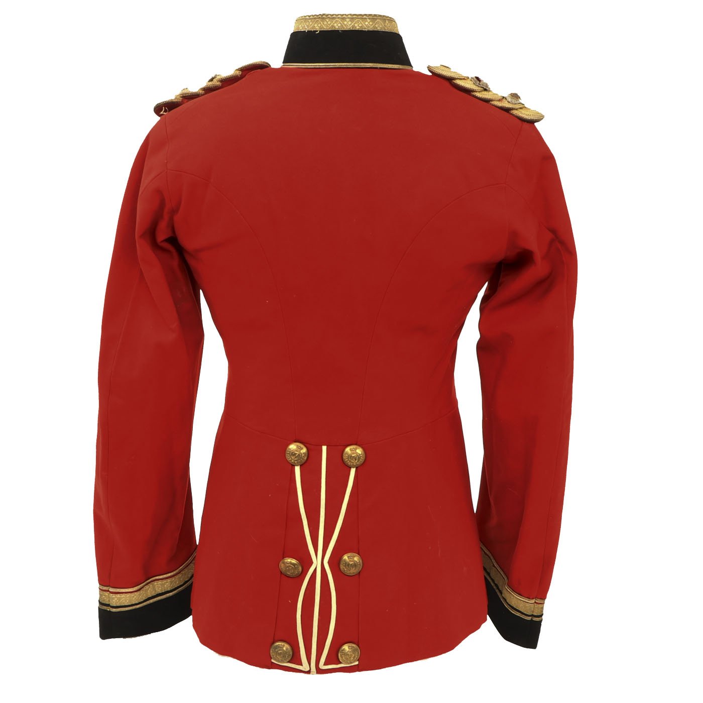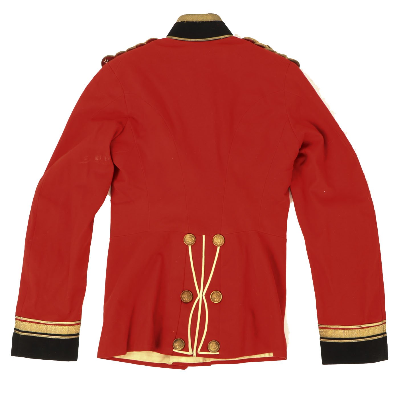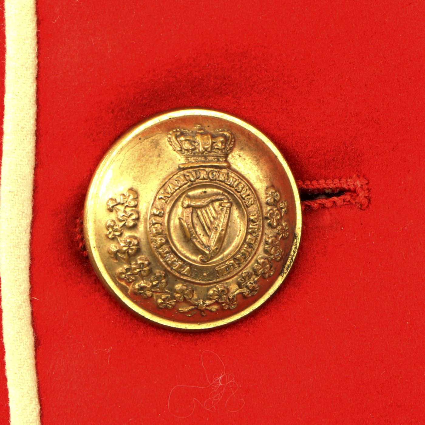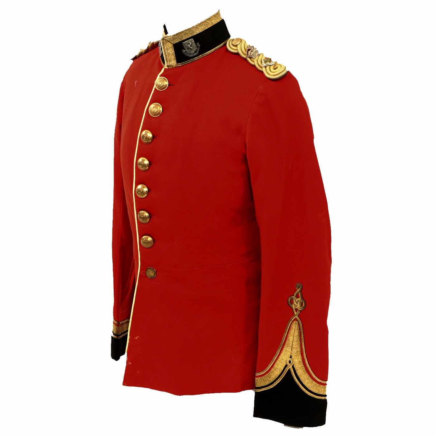 Original Item: Only One Available. Dating between 1881-1902 this fine tunic is in very good condition and features original gilt Royal Irish Regiment buttons with Queen's Crown dating this tunic between 1881 - 1902. Front of tunic has 8 buttons by JENNENS & Co. of LONDON , epaulets are gilt braided with one pips and a crown indicating rank of Lieutenant Colonel. The collar has two silvered Royal Irish Regiment Officer Pins with Latin Motto - "Virtutis Namurcensis Praemium” Translation- Reward for valor at Namur (Belgium). Inside lining shows wear and use but overall condition is very good. There is a \tailor's name tag stitched into the neck that reads: Capt. G. F. R. Forbes. Also included red striped blue trousers.