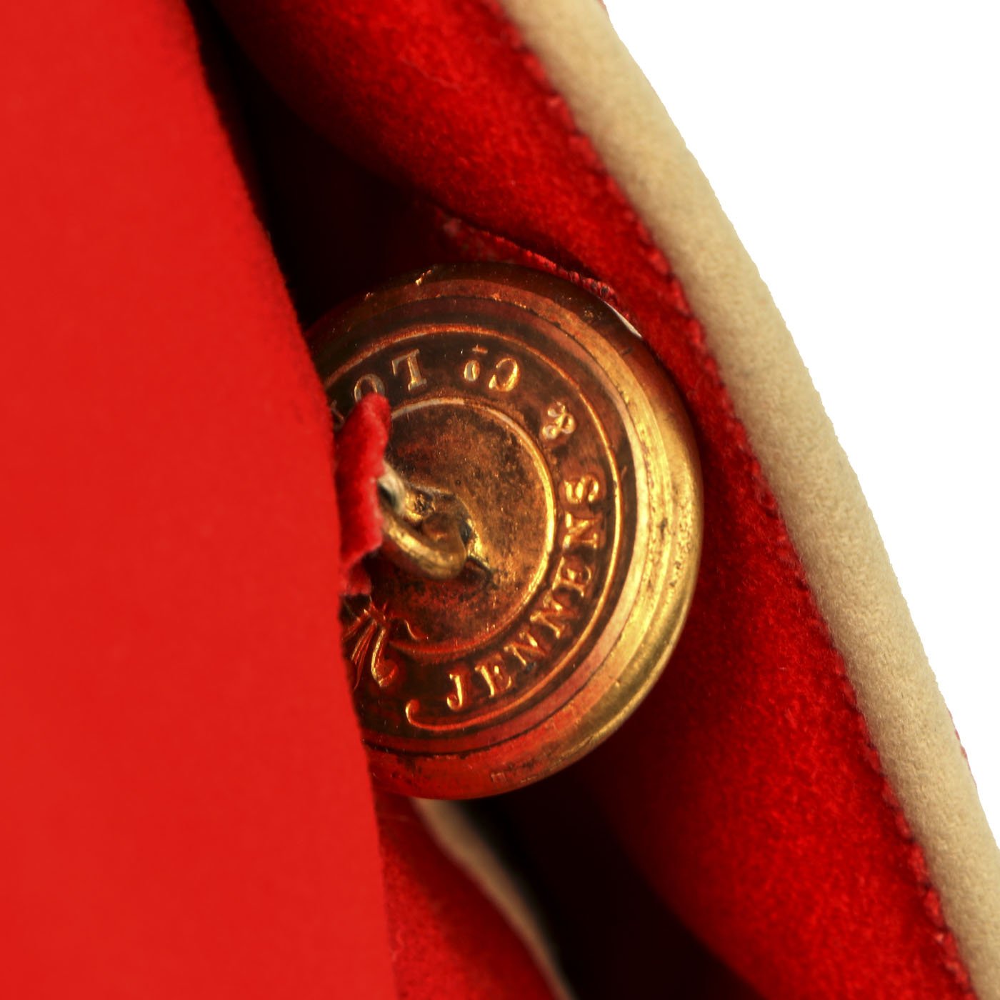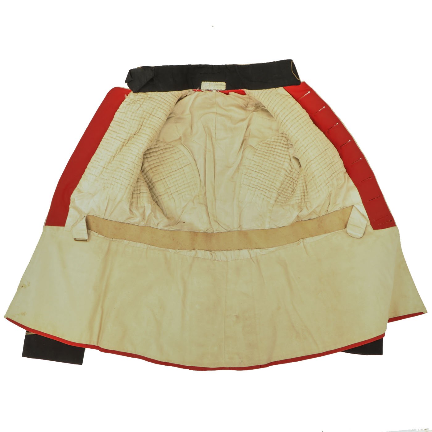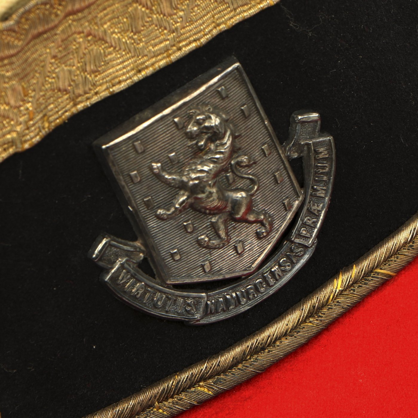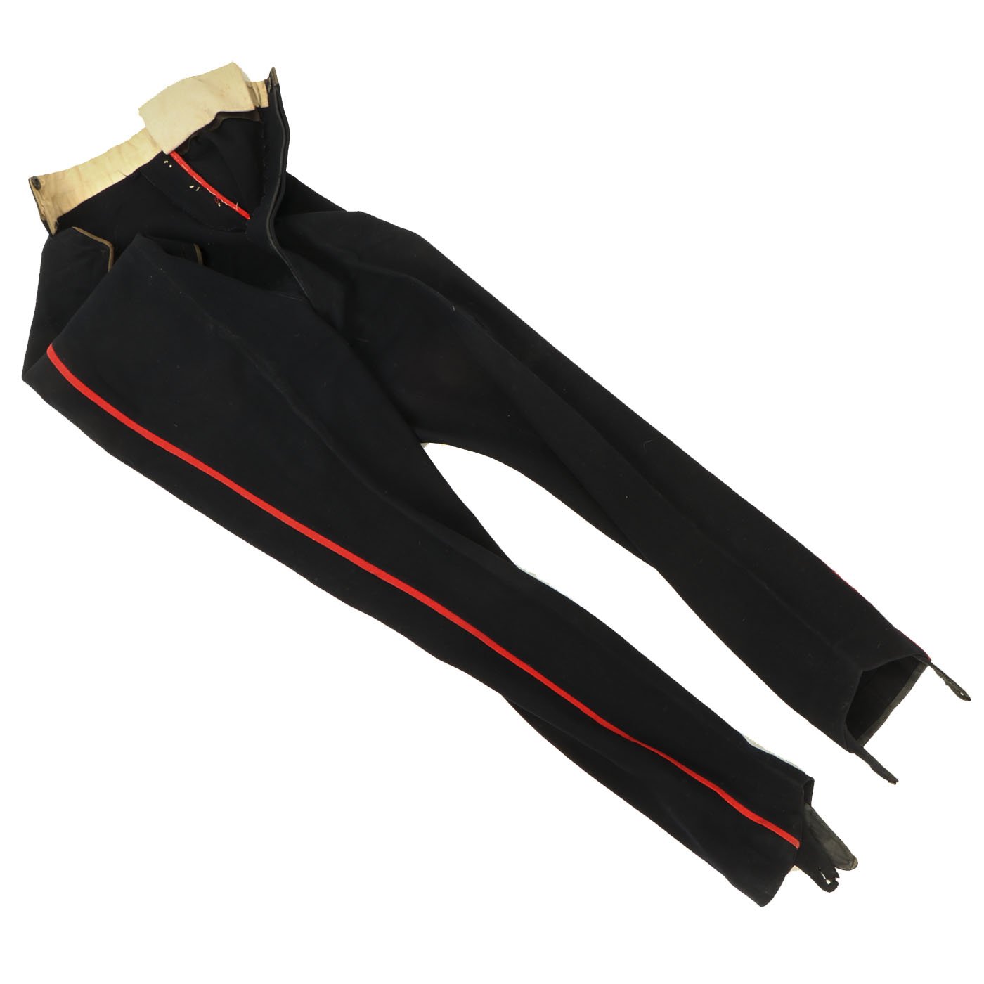 Original Item: Only One Available. Dating between 1881-1902 this fine tunic is in very good condition and features original gilt Royal Irish Regiment buttons with Queen's Crown dating this tunic between 1881 - 1902. Front of tunic has 8 buttons by JENNENS & Co. of LONDON , epaulets are gilt braided with one pips and a crown indicating rank of Lieutenant Colonel. The collar has two silvered Royal Irish Regiment Officer Pins with Latin Motto - "Virtutis Namurcensis Praemium” Translation- Reward for valor at Namur (Belgium). Inside lining shows wear and use but overall condition is very good. There is a \tailor's name tag stitched into the neck that reads: Capt. G. F. R. Forbes. Also included red striped blue trousers.