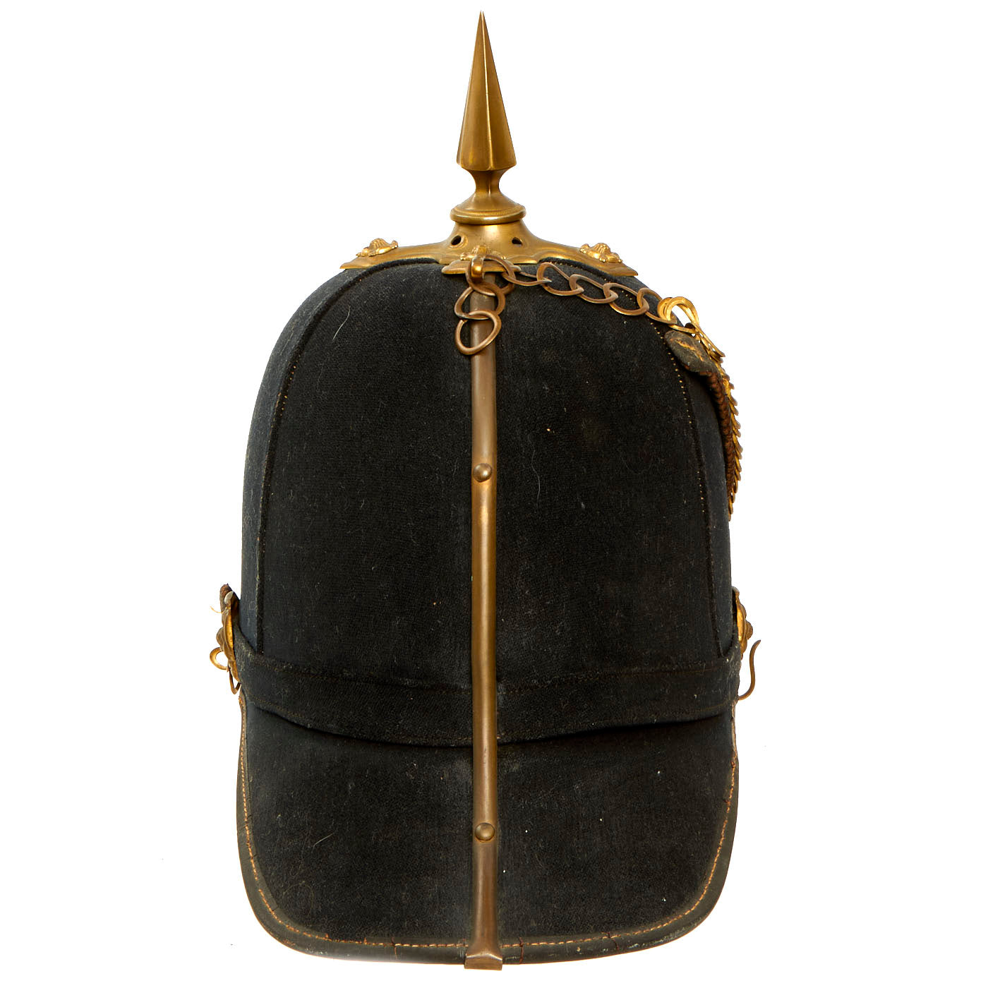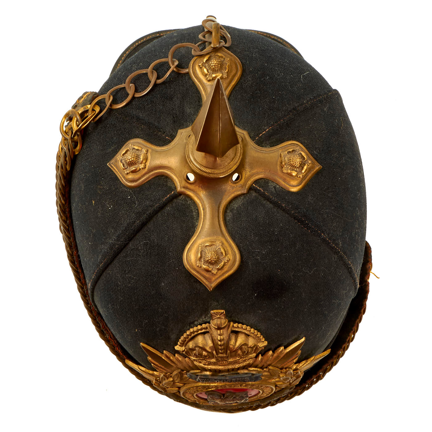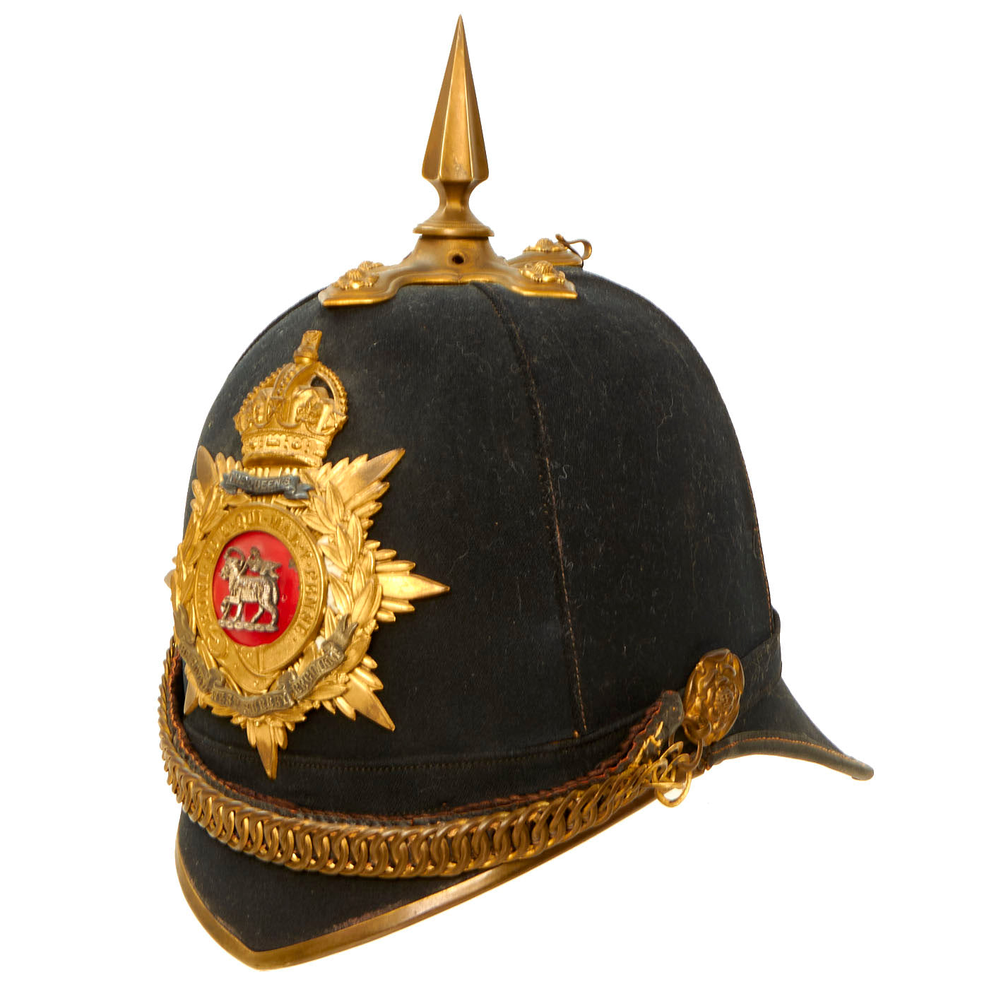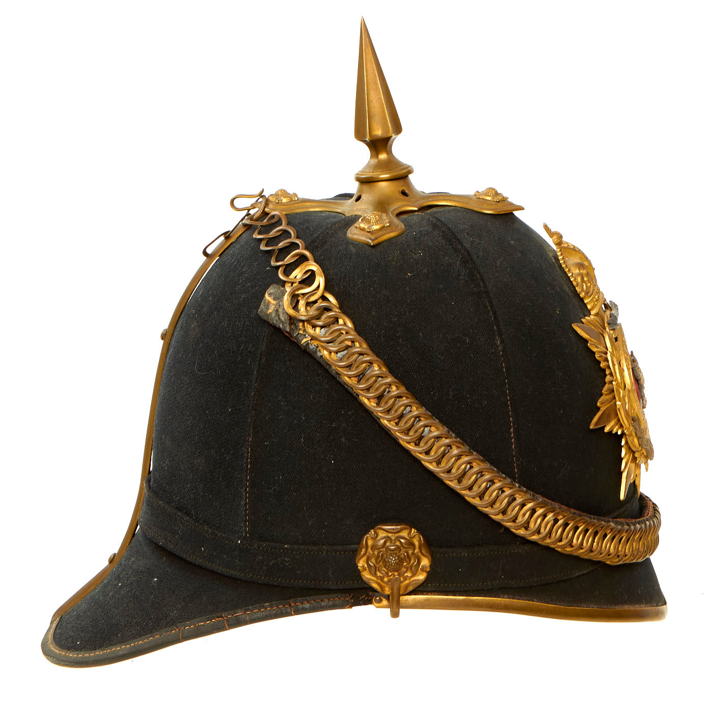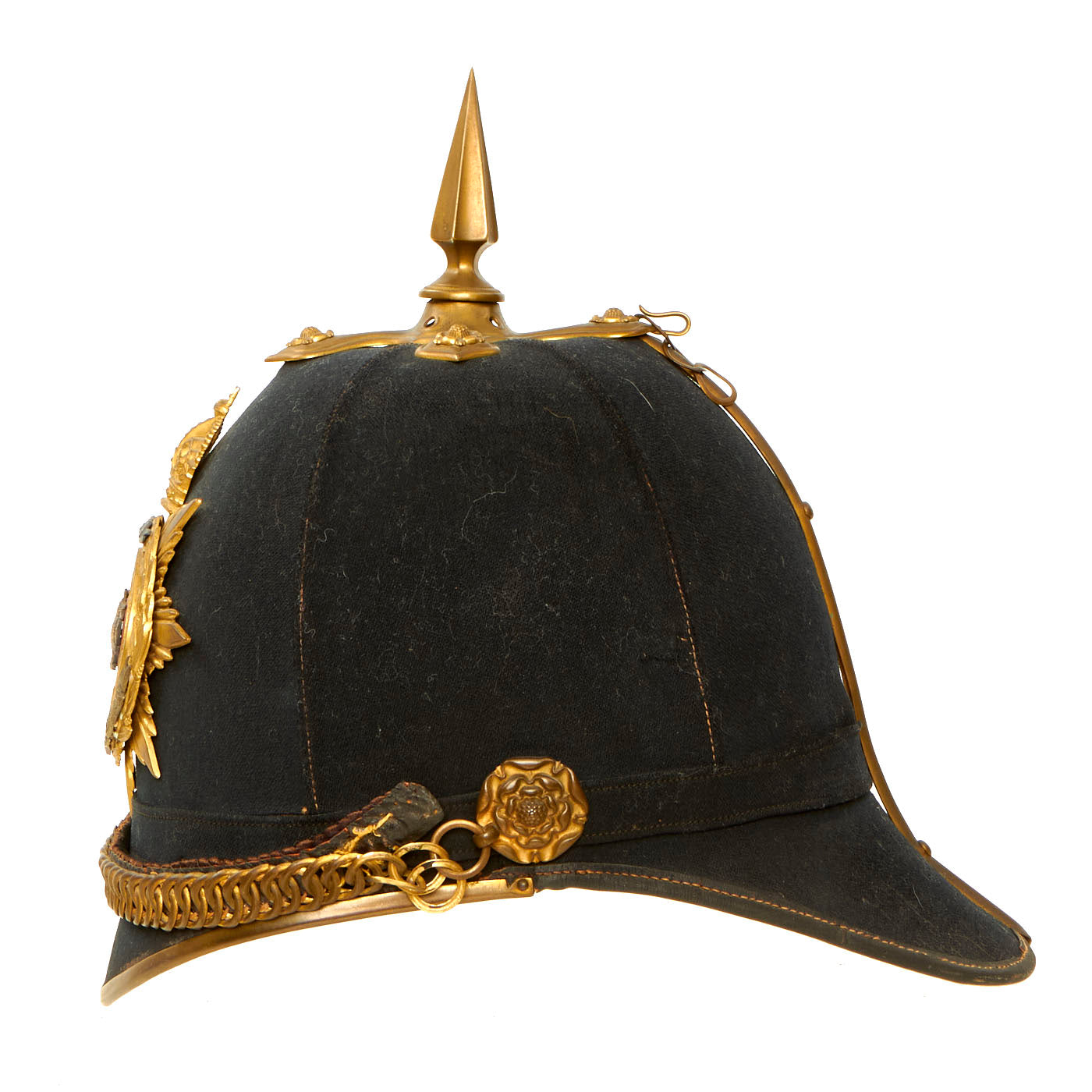 Original Item: Only One Available. This is a well used but solid condition Victorian era British Army Officer Blue Cloth Spiked helmet which is complete with its spiked finial and scaled chinstrap. The chin strap lugs and spike base ends are all properly adorned with embossed roses. This helmet has gilt brass mounts used on all regular Army helmets.