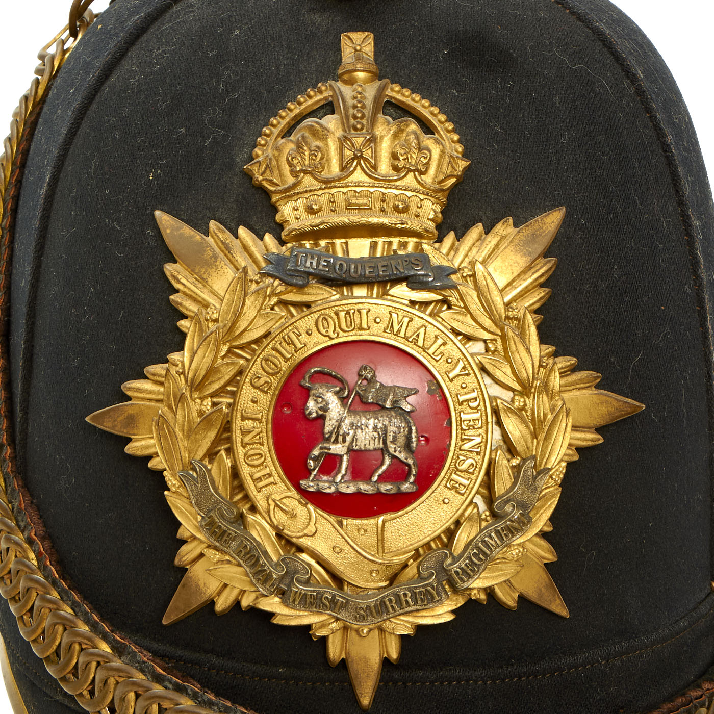 The front of the helmet has the correct regiment plate for THE QUEENS / THE ROYAL WEST SURREY REGIMENT. Body consists of cork covered with blue wool, trimmed with brass. Liner is calfskin leather and has a worn silk lining. Interior of the front and rear visor is trimmed with fine green dyed leather, with the interior body lined with canvas.
