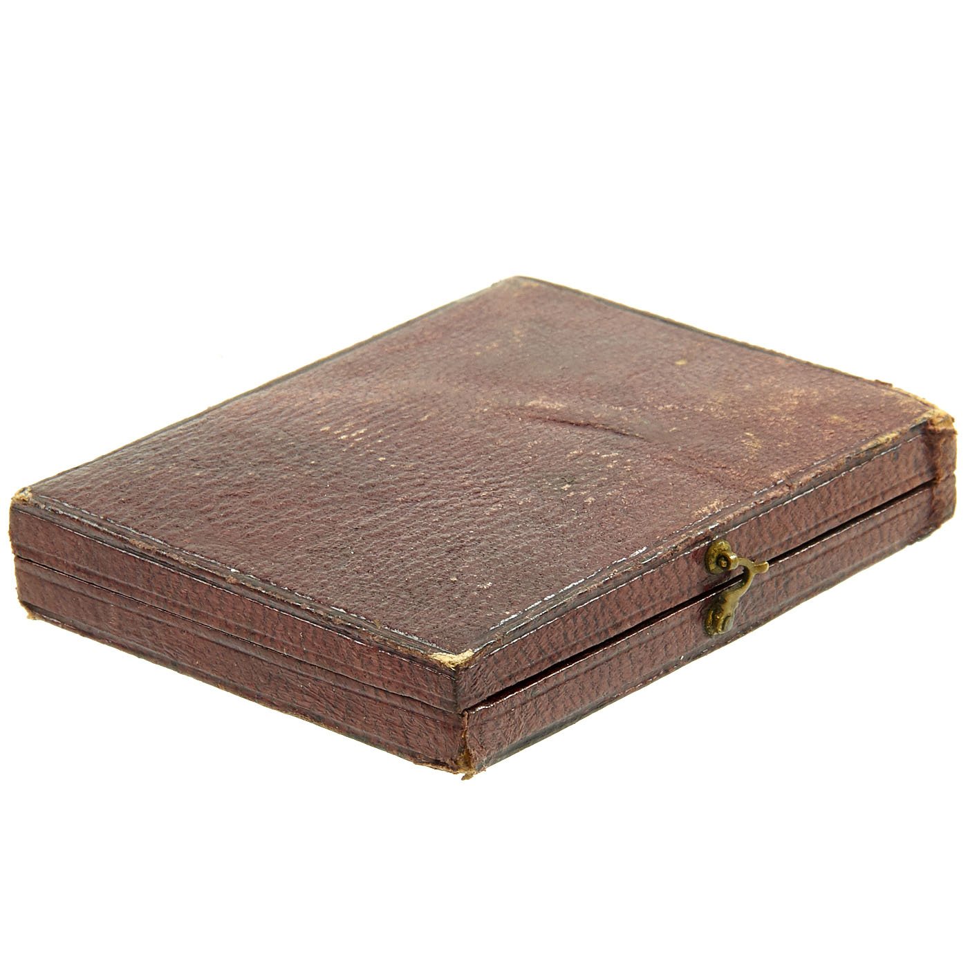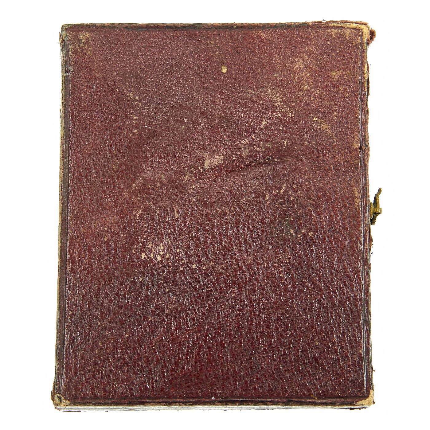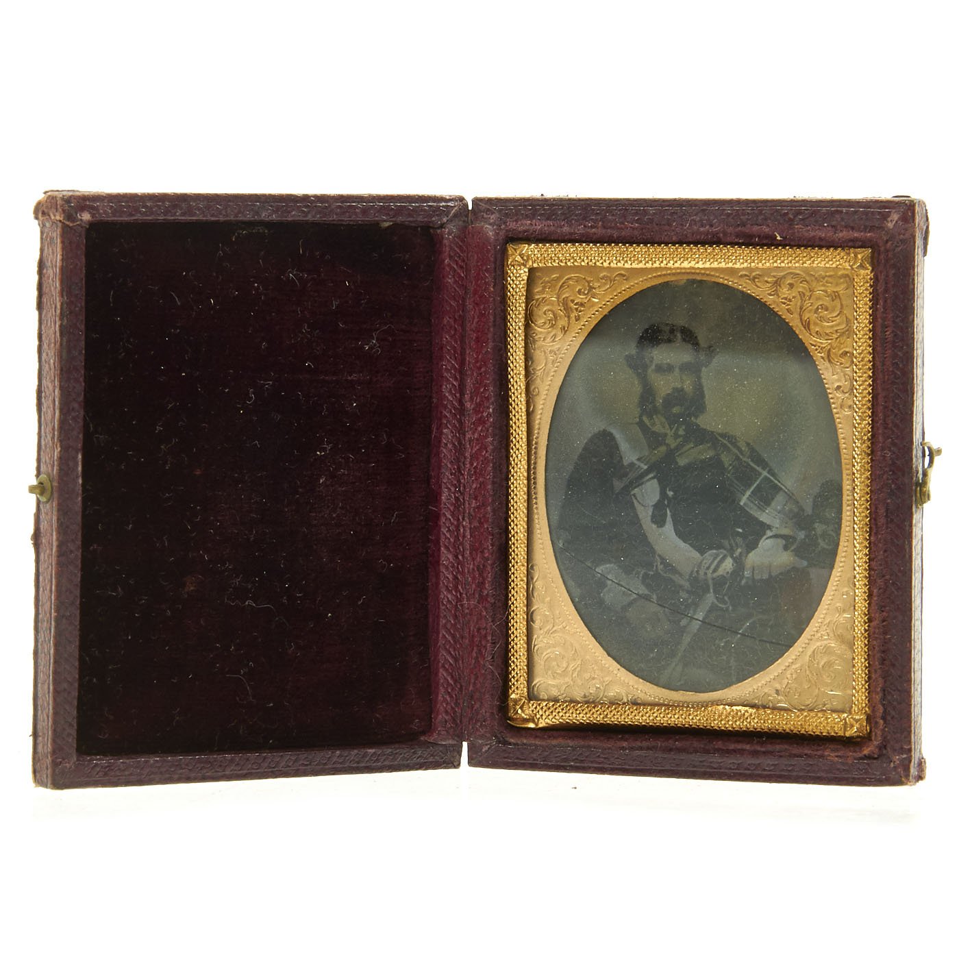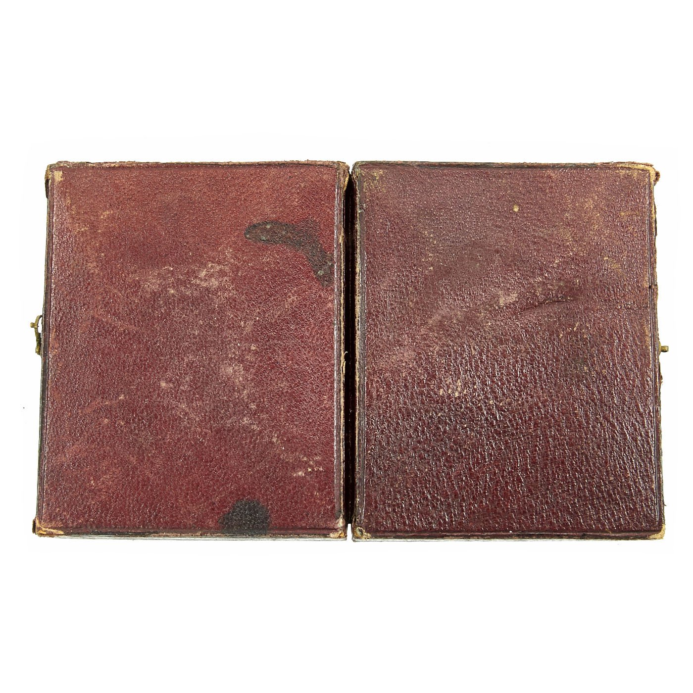 Original Item: Only One Available. Everything about this image, including its presentation, makes it a splendid memento of the British Victorian Era dating from the 1870s. This cased "Sixth Plate" (2.75 x 3.25 inch) tin type portrait shows an unidentified solider. He wears a dark uniform, kepi style cap, leather cross belt with S hook buckle and holds what appears to be a Pattern 1853 Enfield rifled musket and Yataghan Sword Bayonet with leaf spring button release.