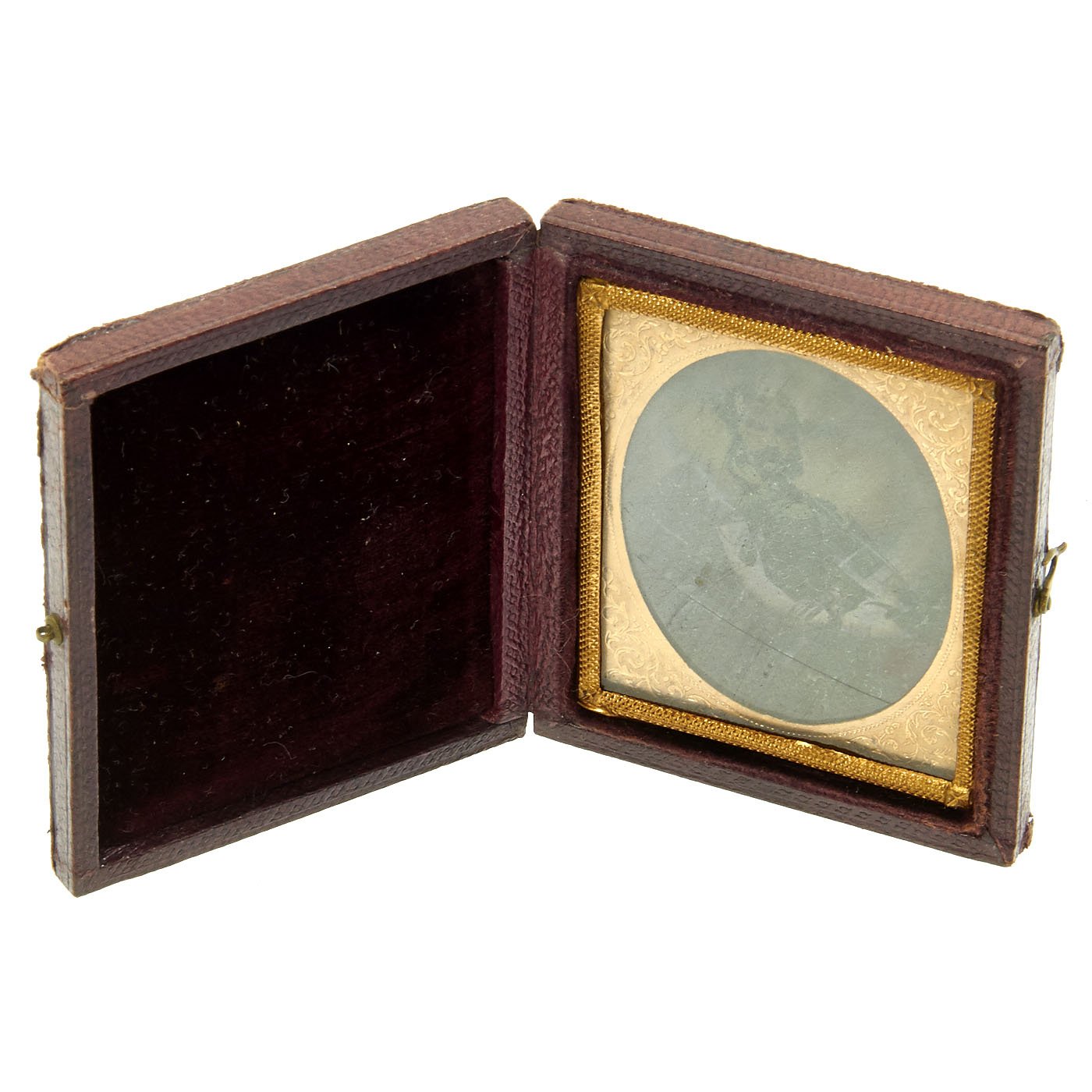 The image is behind glass held in an ornate brass mat with intricate designed edging the tintype. A gutta-percha case molded front and back. Interior of the case is lined in velvet with decorative diamond pattern. The case locks are present, though only one has its lock hook.