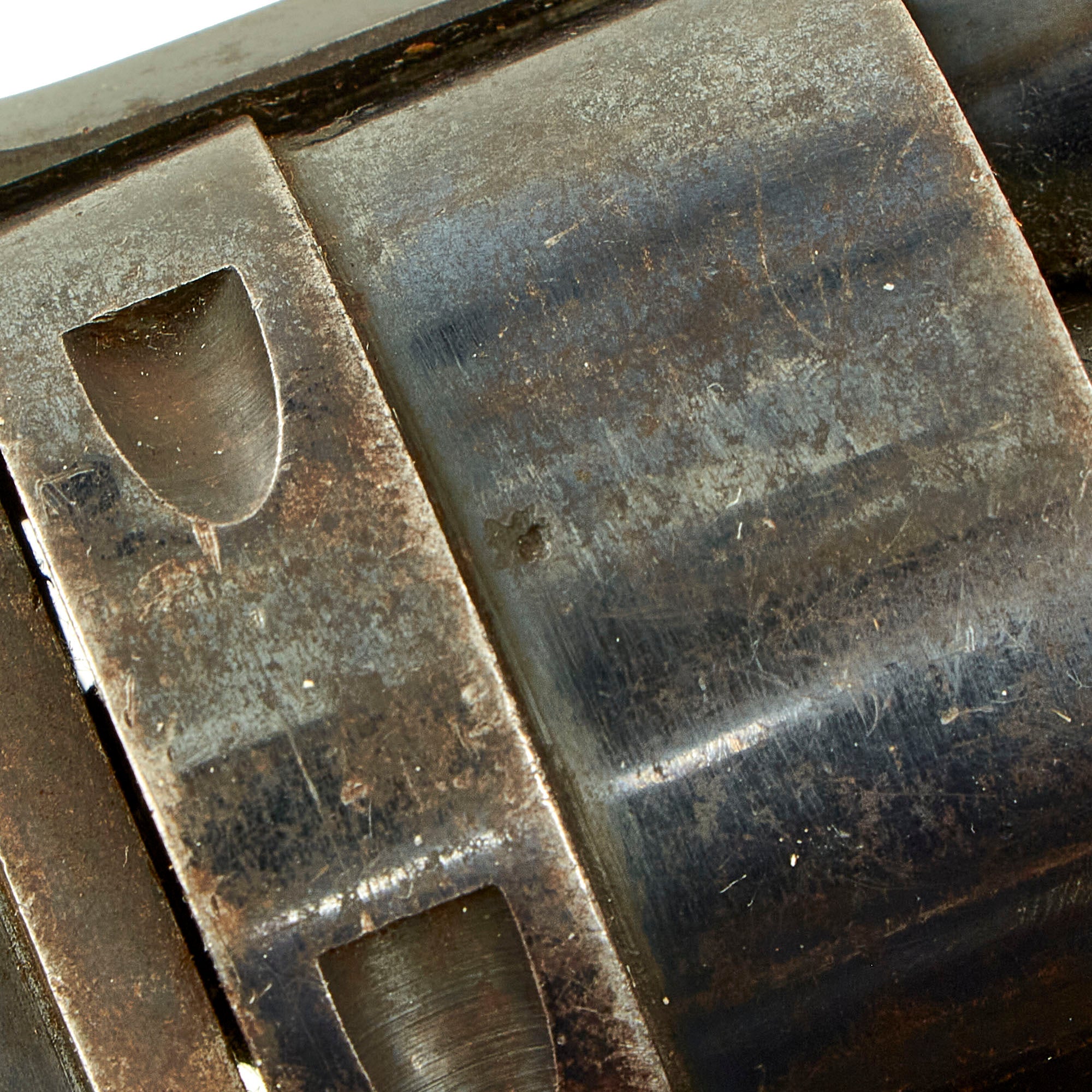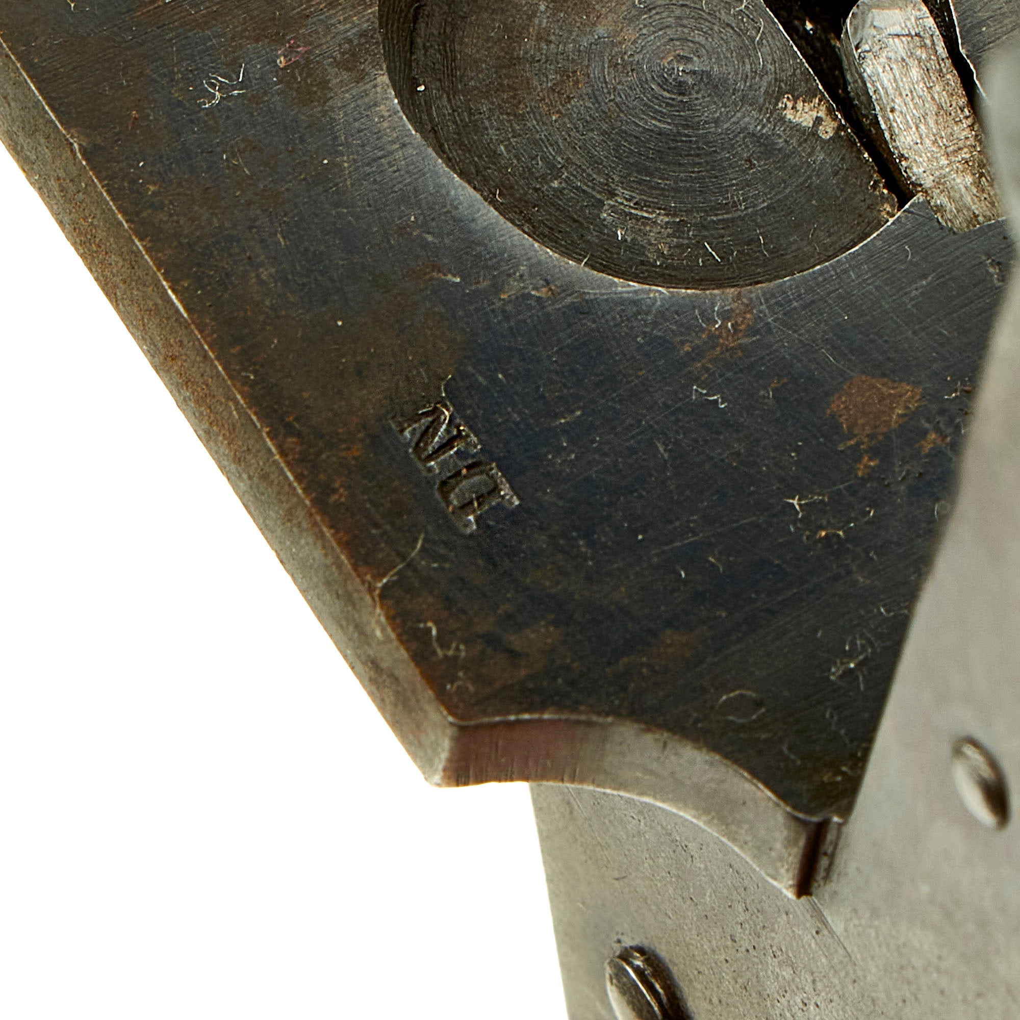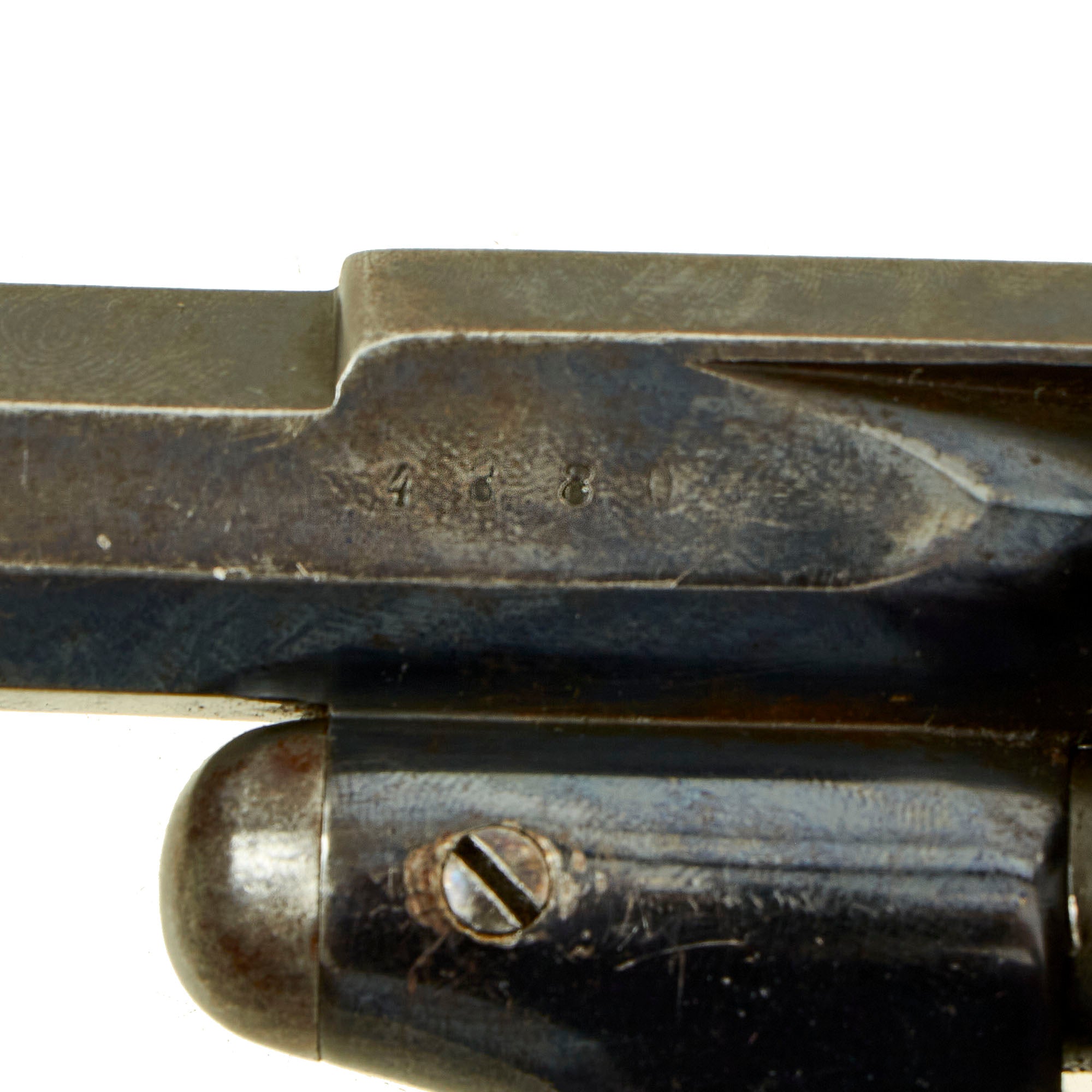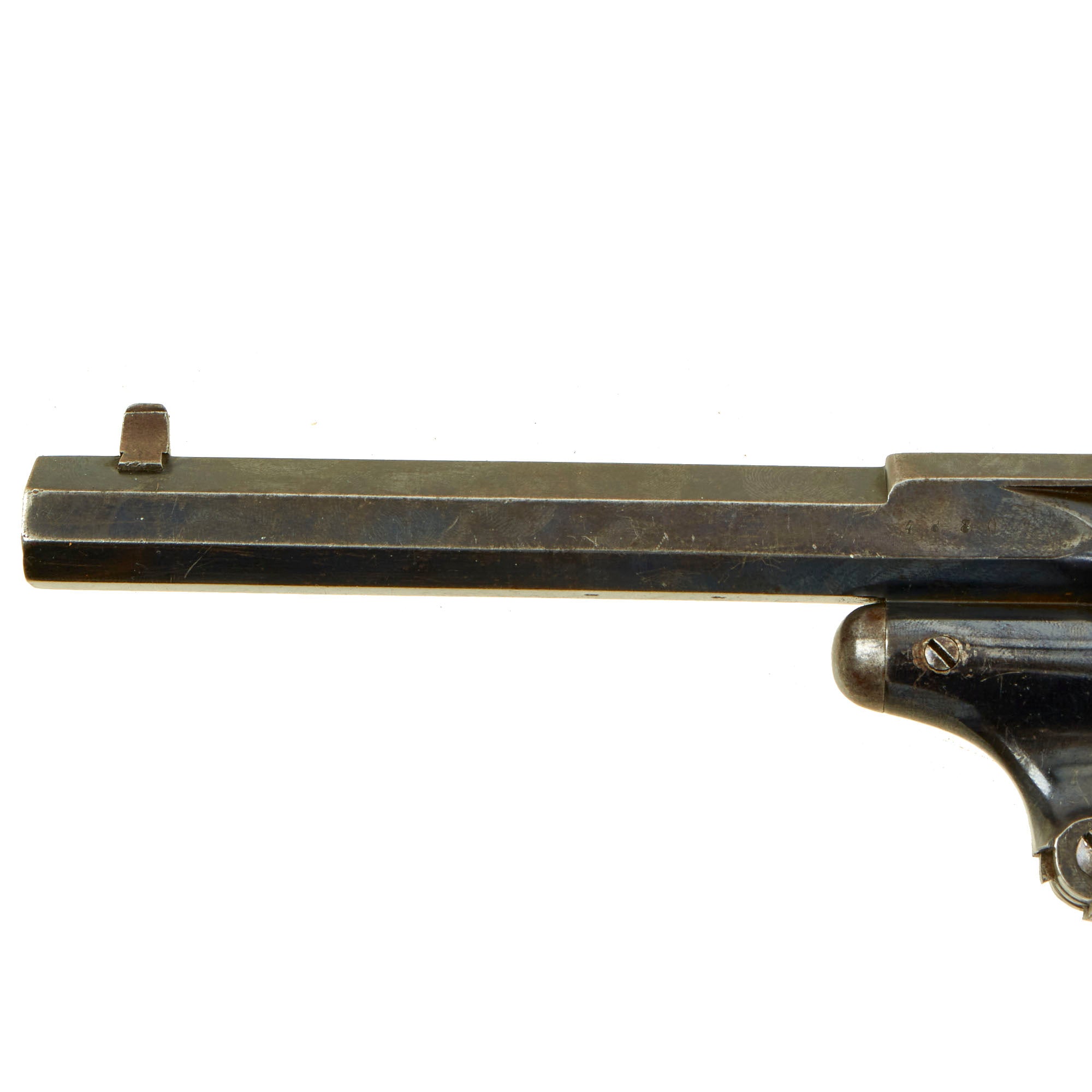The revolver still shows lots of the original deep blue/purple blued finish on the barrel, cylinder, and frame, with a more worn patina on the trigger guard and some other areas, which may have originally been case hardened. It has lovely bag shaped checkered walnut grips, showing very little wear from use, just a bit from storage. This is most likely an Officer's Private Purchase item which has seen little or no use. Gently aging showing very little wear of any type.