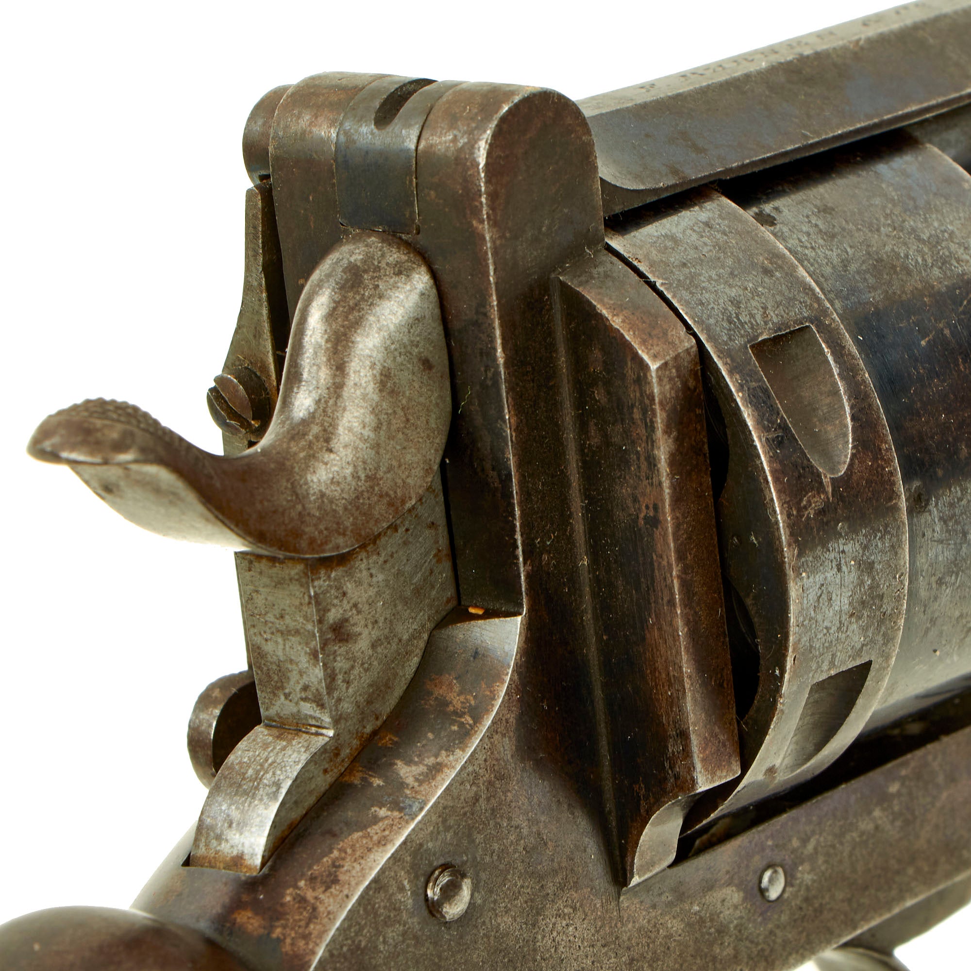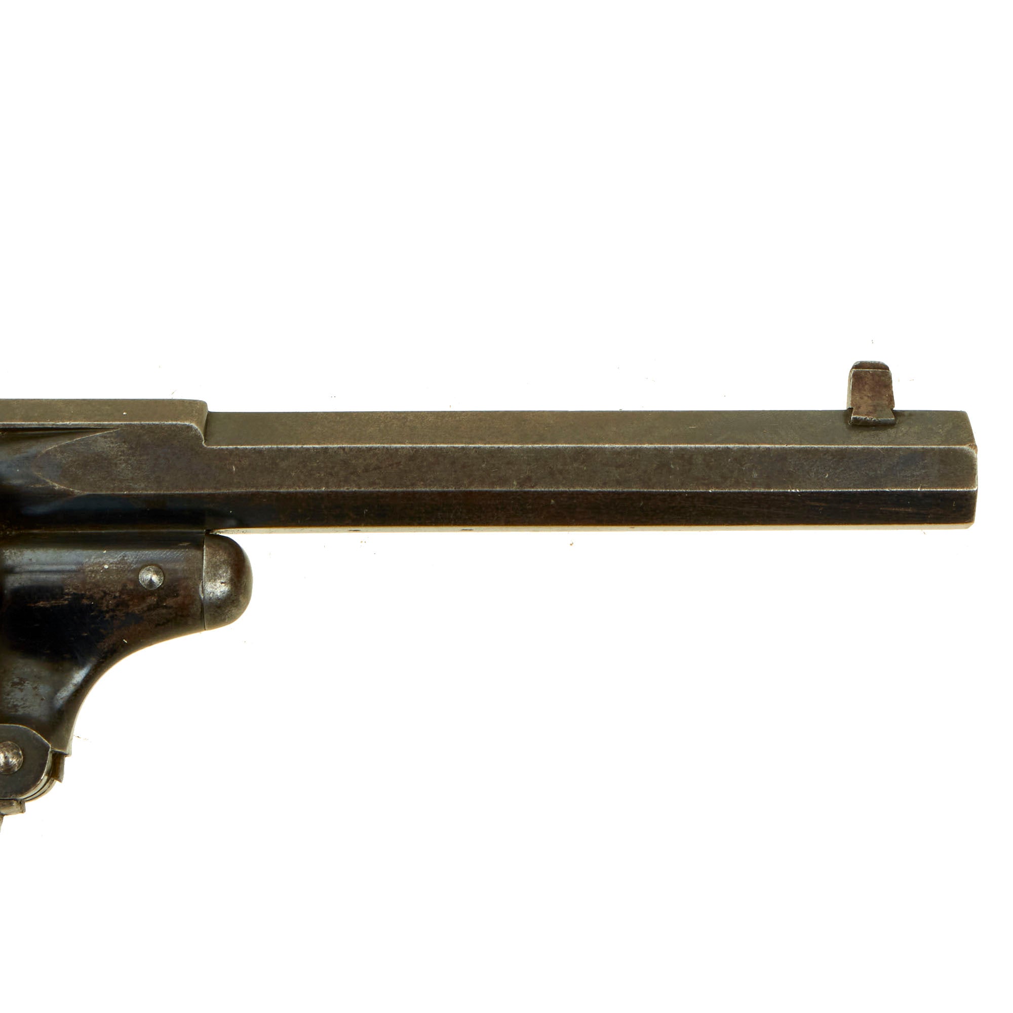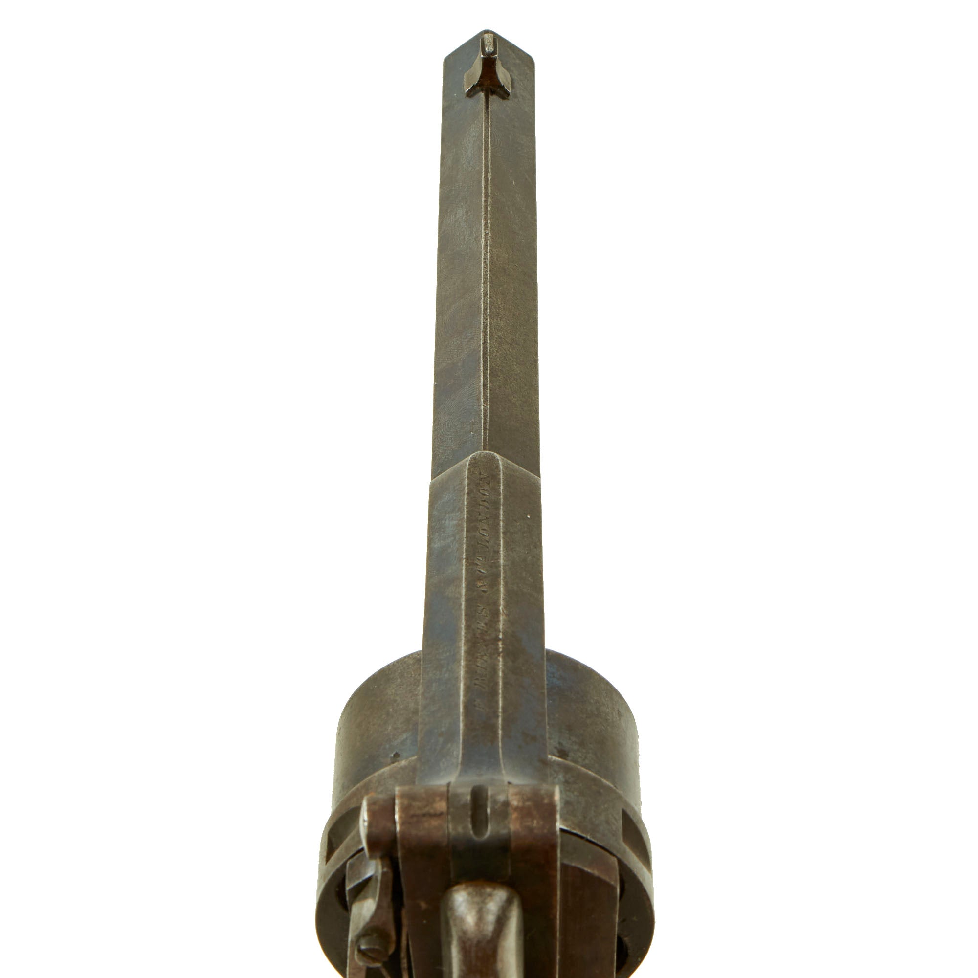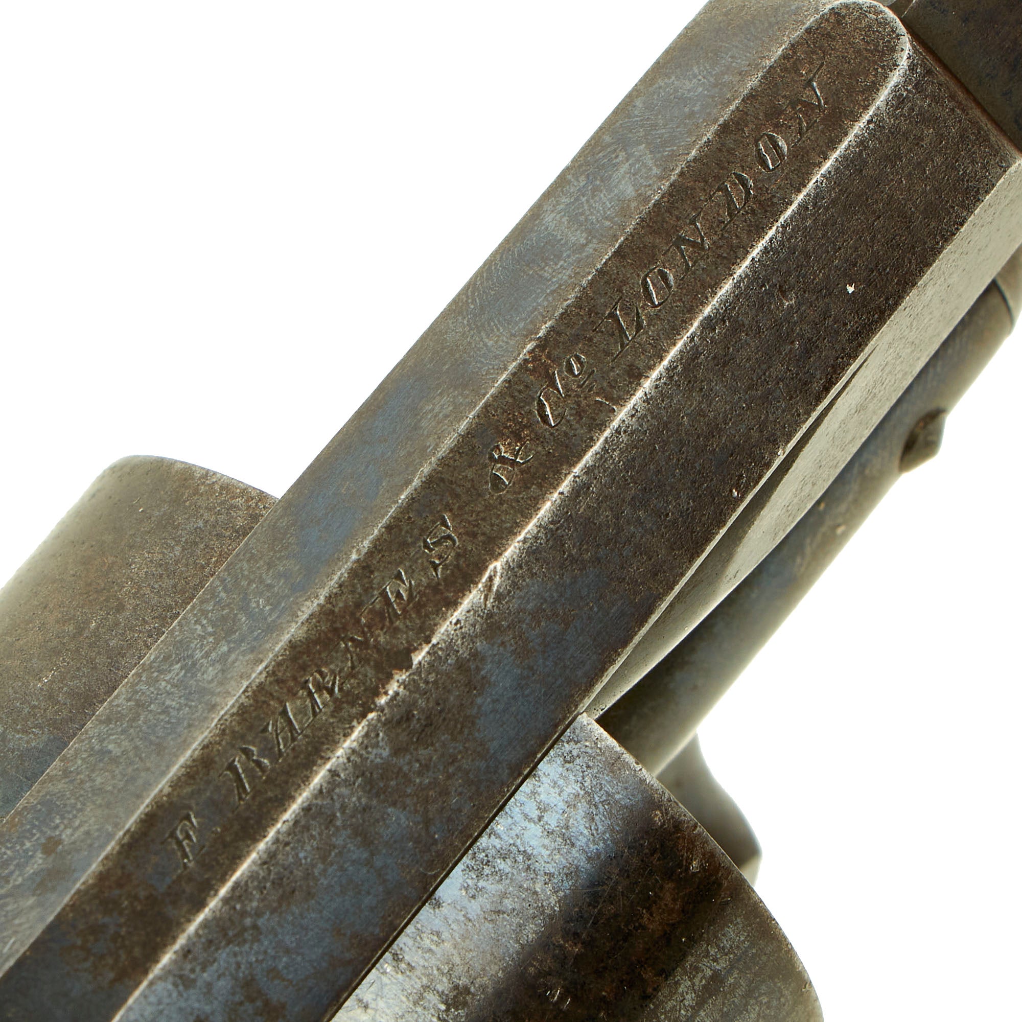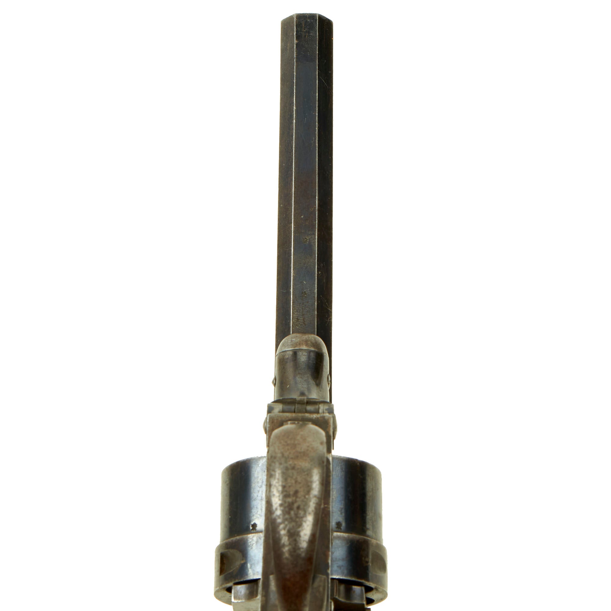 Original Item: Only One Available. This is a most interesting EARLY 6 shot .450 Caliber revolver probably made circa 1870, and marked on the top of the cylinder strap by maker F. BARNES & CO LONDON. Frederick Barnes & Co. are a known Victorian Era gunmaker, recorded in London at 3 Union Row between 1851 and 1856, 109 Fenchurch Street between 1851 and 1904, and at 67 Minories between 1851 and 1855. The Company also had premises in Birmingham between 1831 and 1903, and in Sheffield between 1839 and 1904.